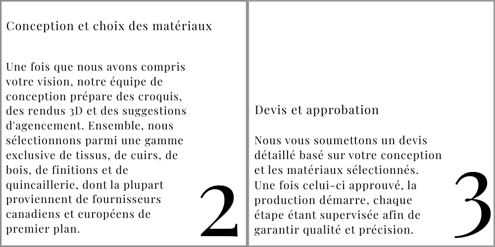 Pour obtenir plus d’informations, veuillez nous envoyer un courriel à info@avenuedesigncanada.com ou nous appeler au (514) 340-9351.