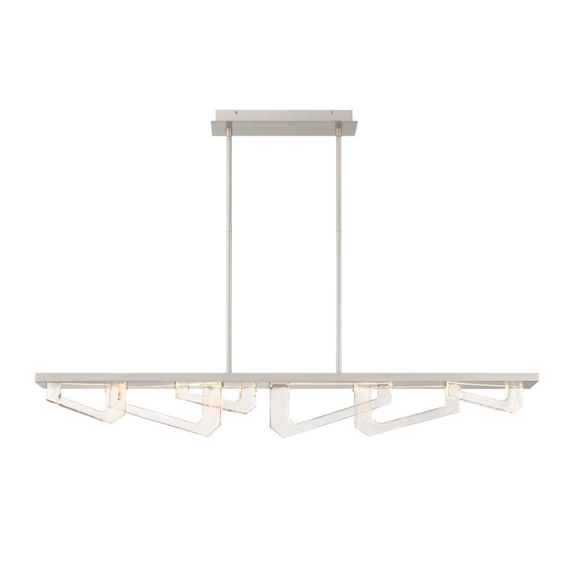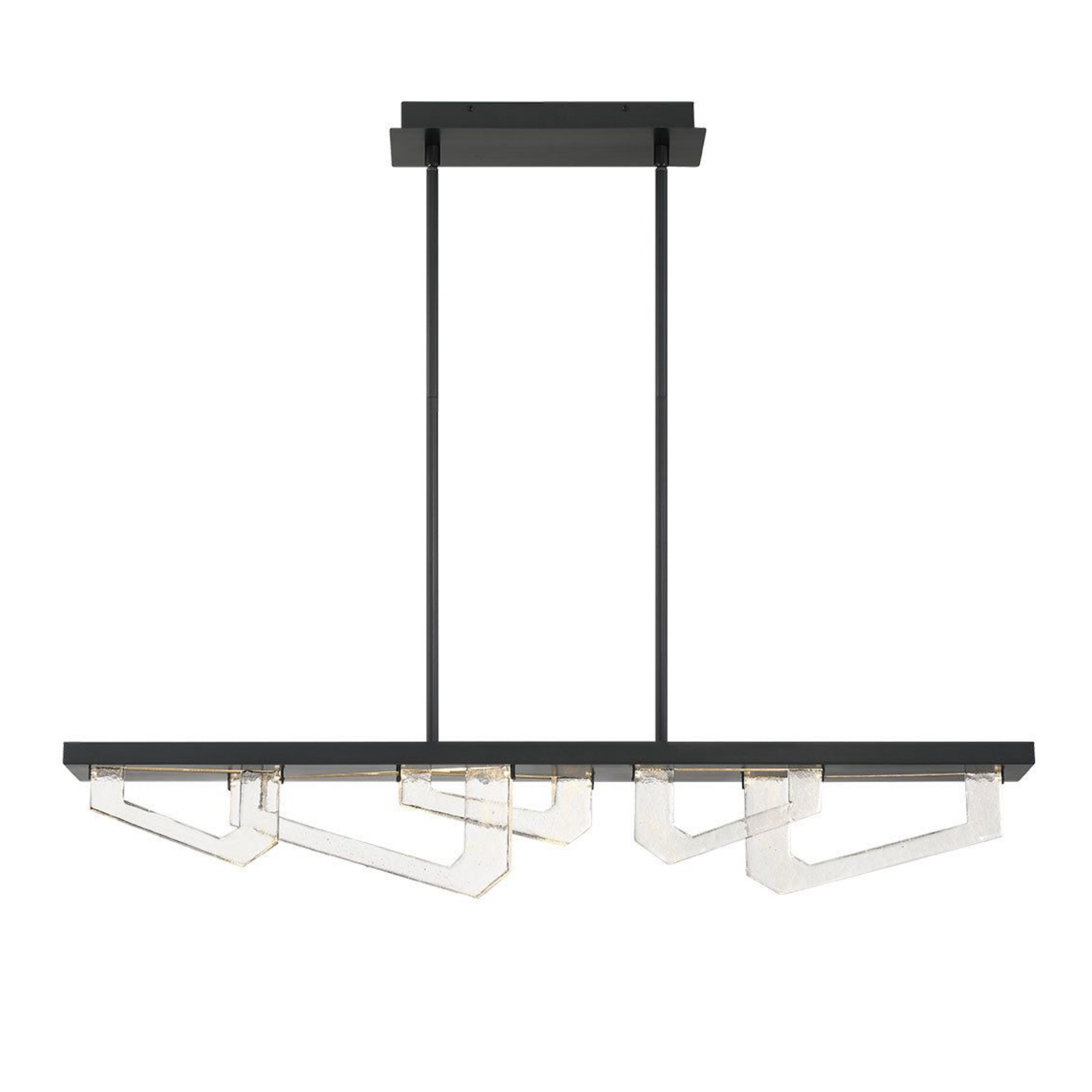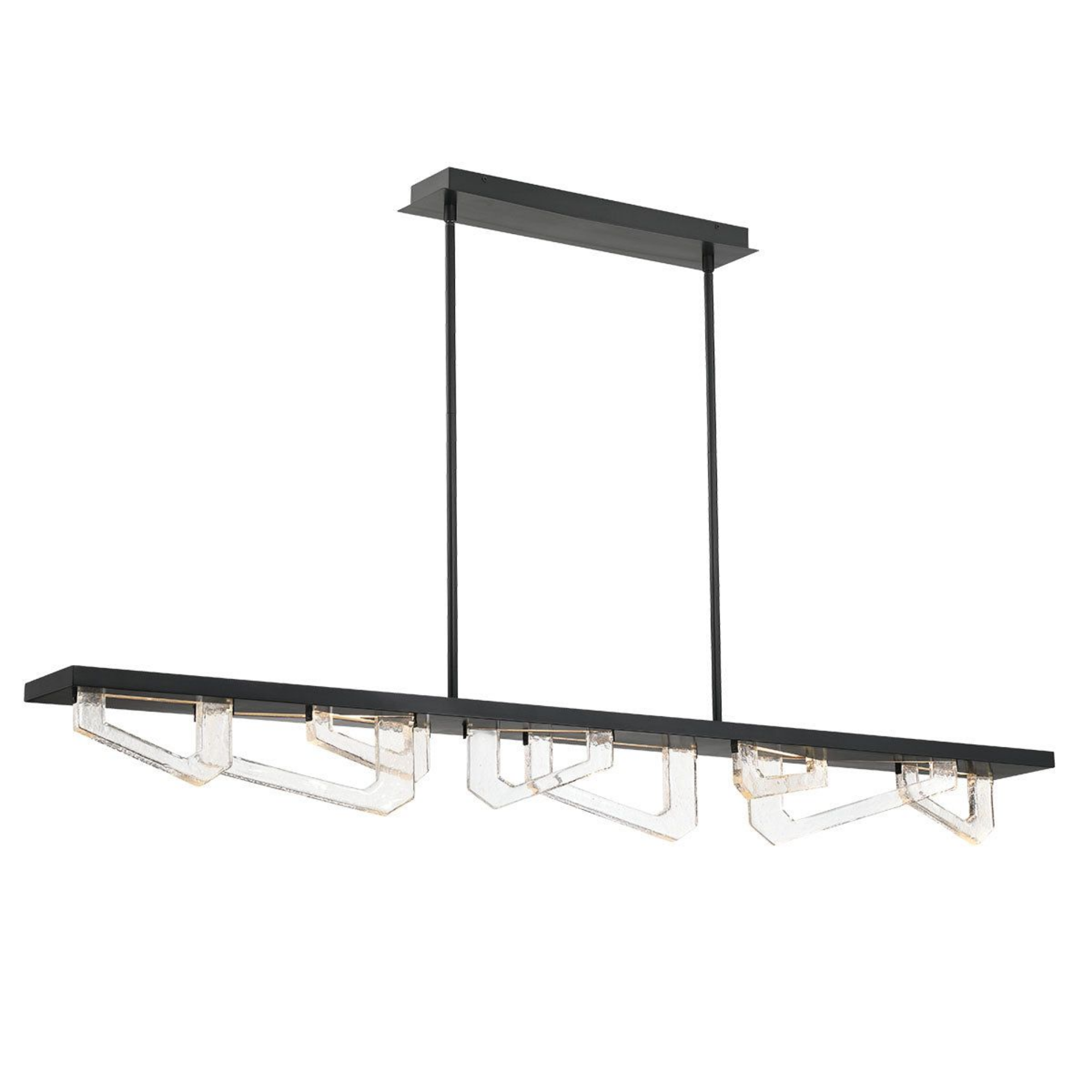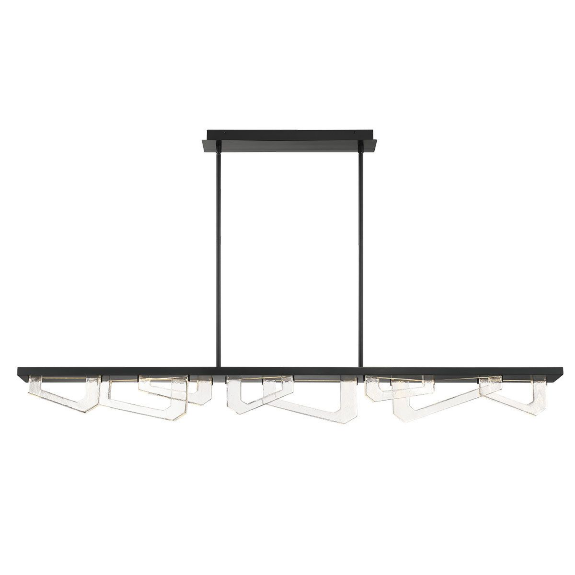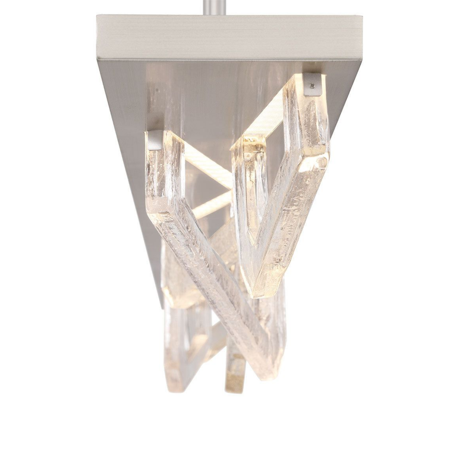 Des formes géométriques angulaires en verre sont suspendues sous le cadre, créant une composition dynamique et visuellement frappante.
