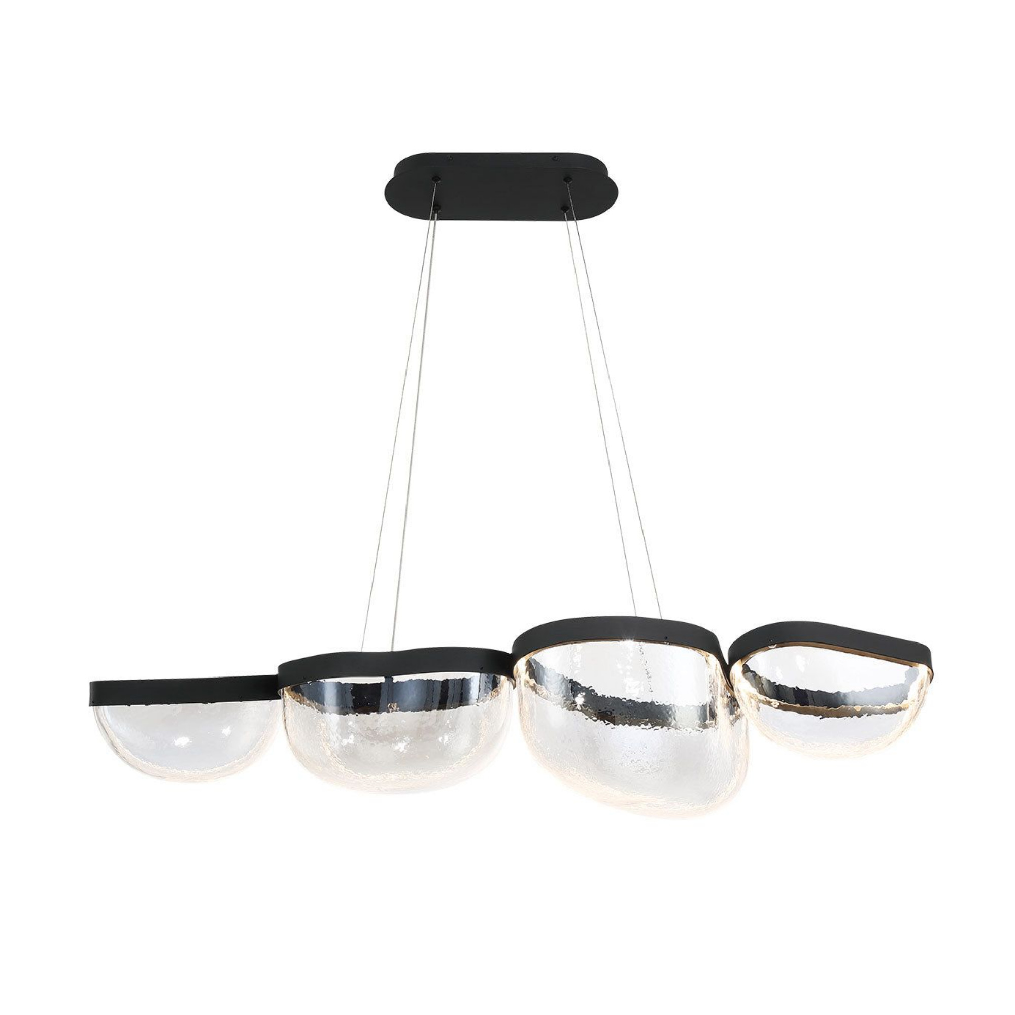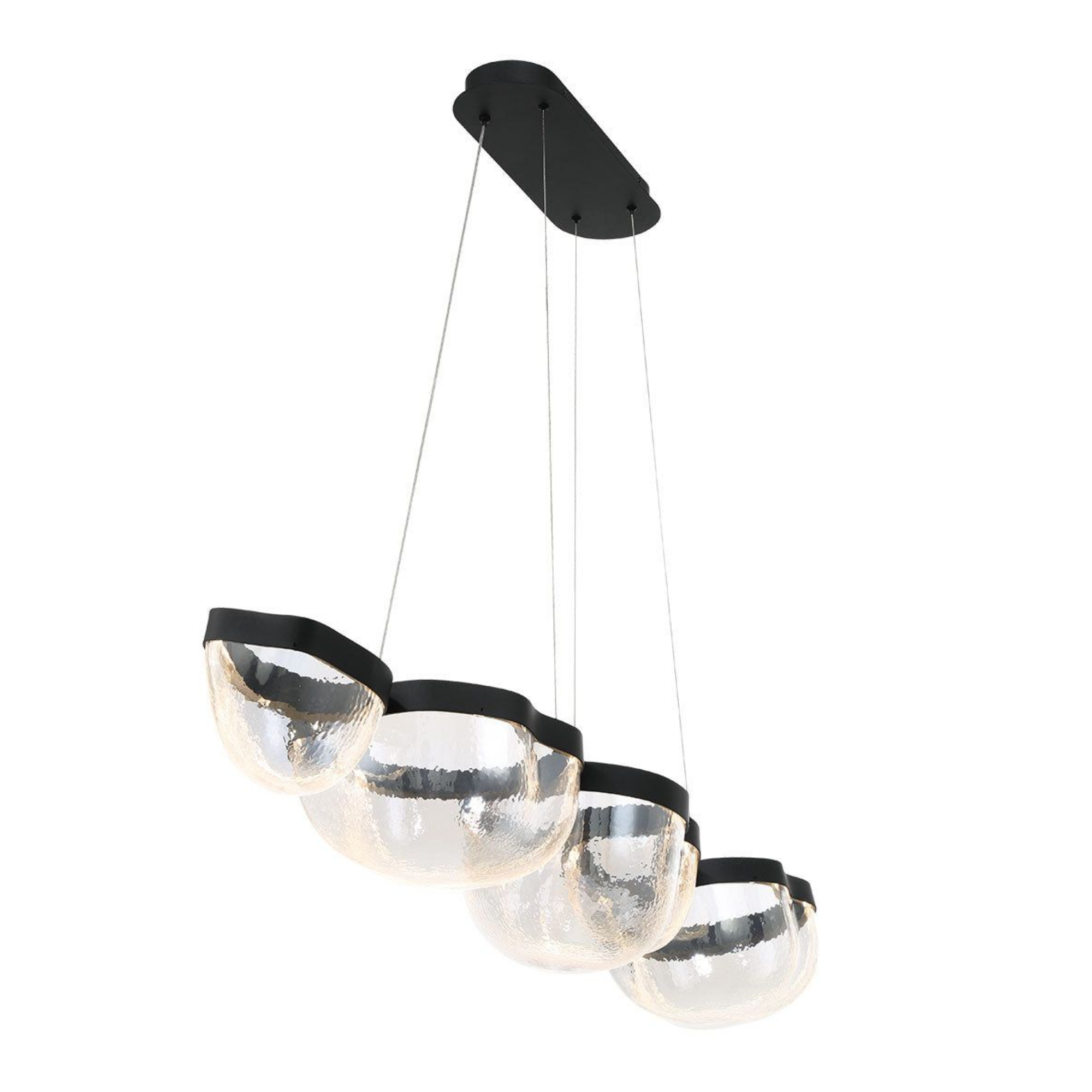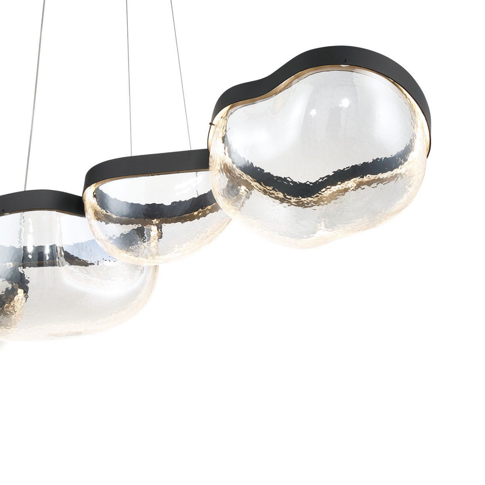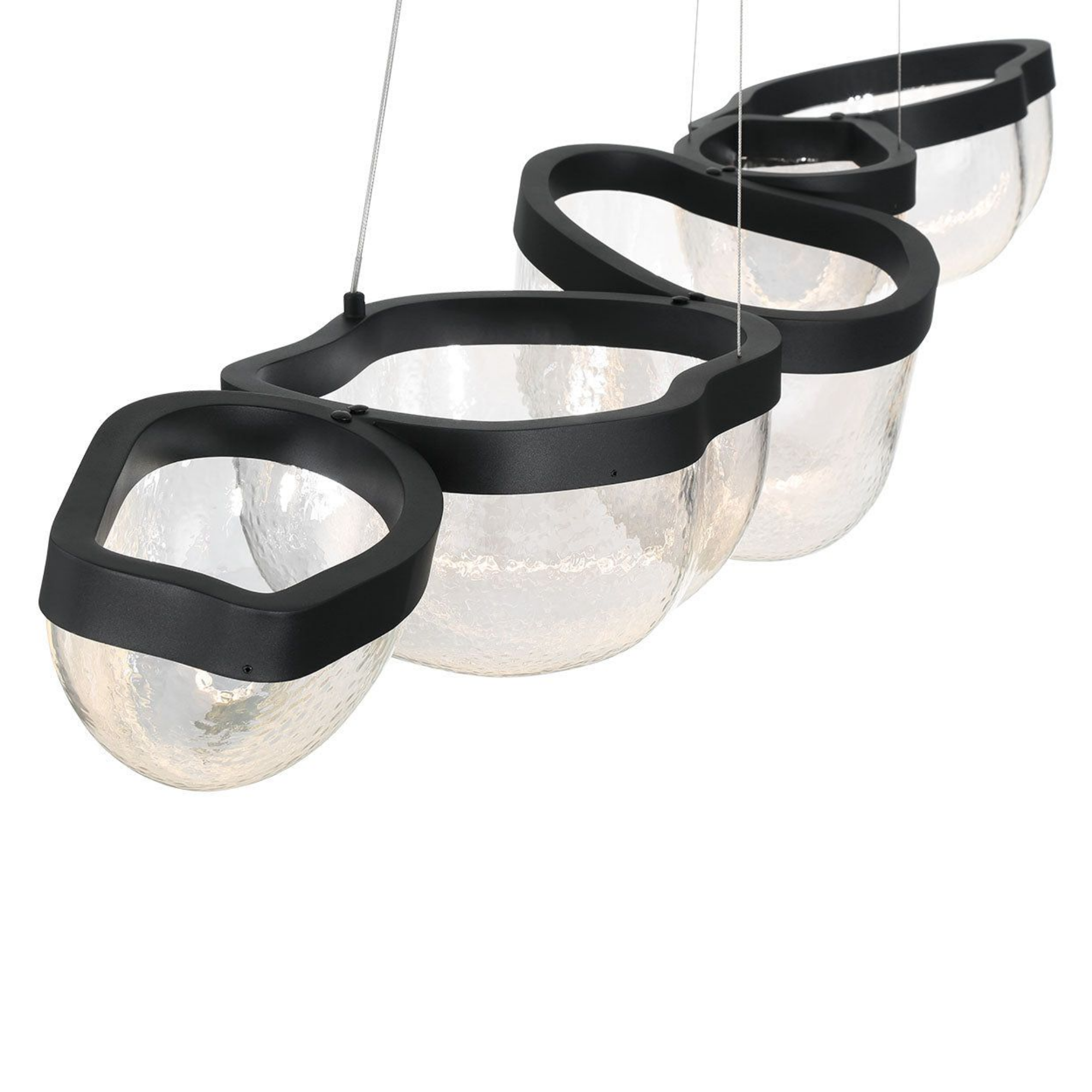 La source de lumière est intégrée de manière transparente dans le cadre noir élégant, illuminant les bols en verre soufflé à la main de l’intérieur et mettant en valeur leurs textures uniques et leur clarté.