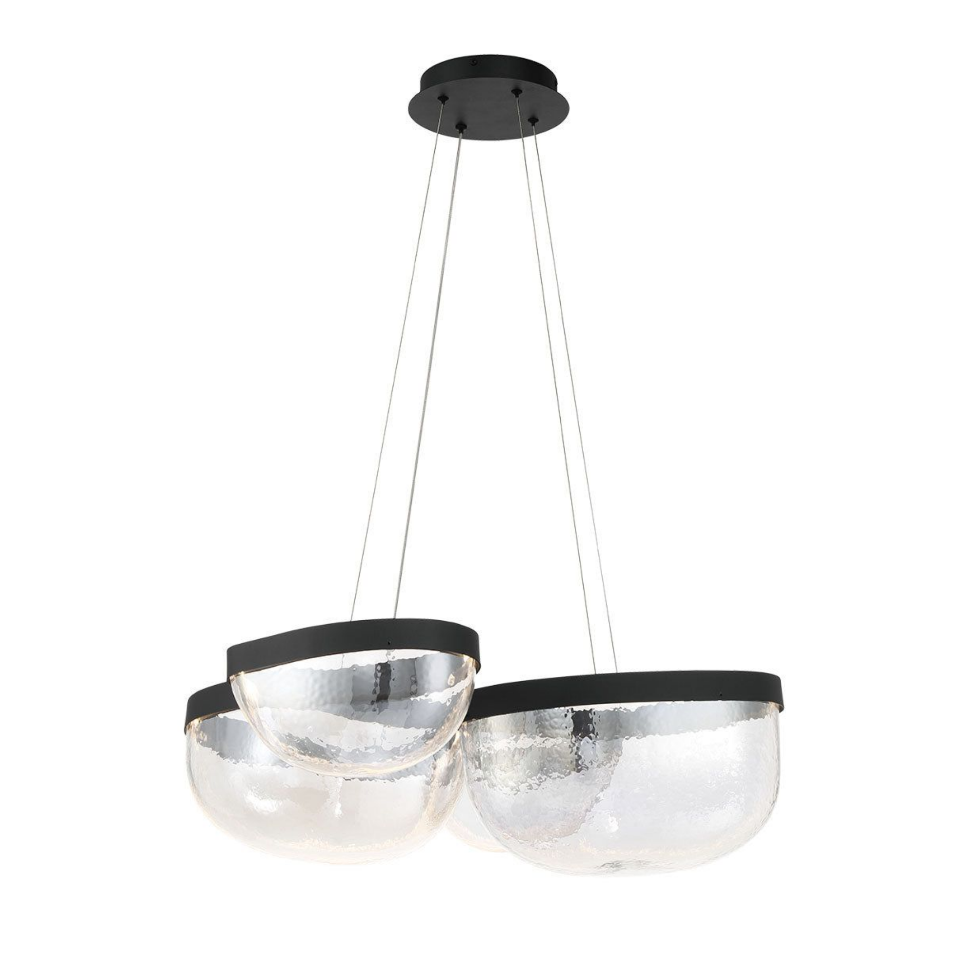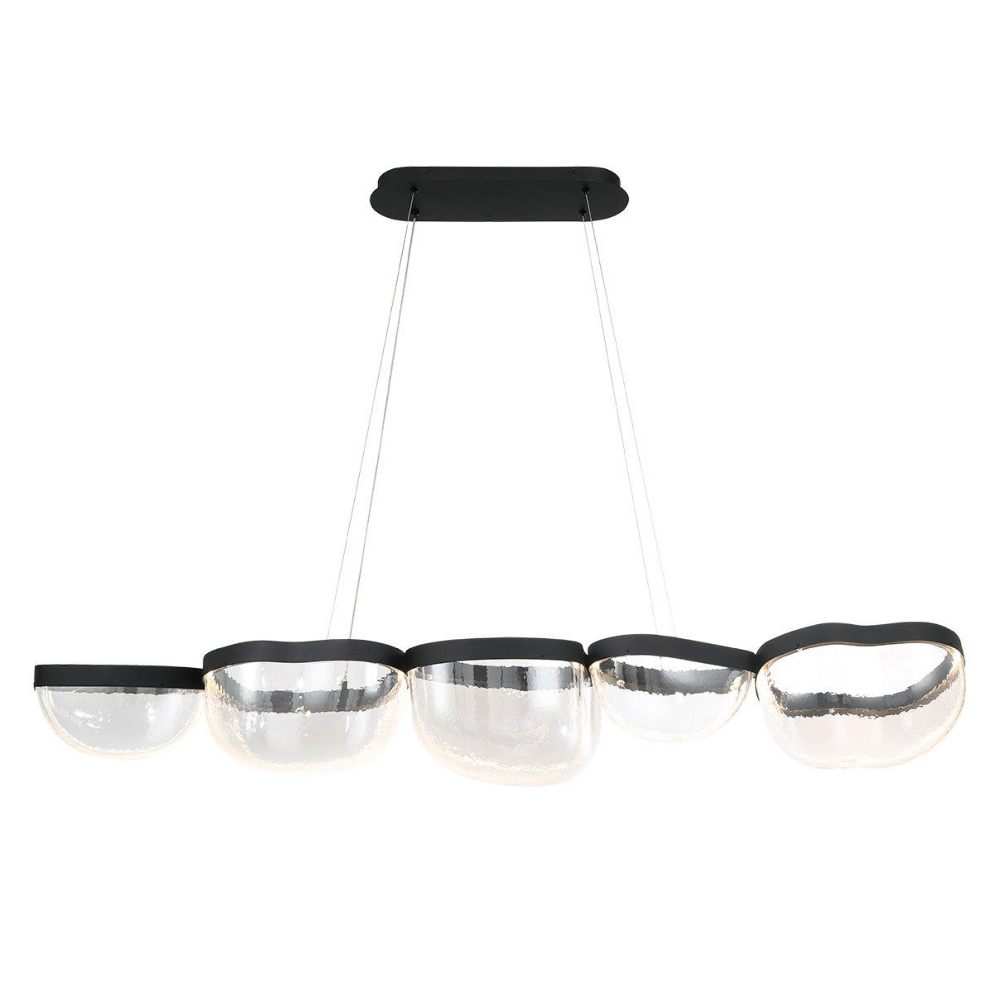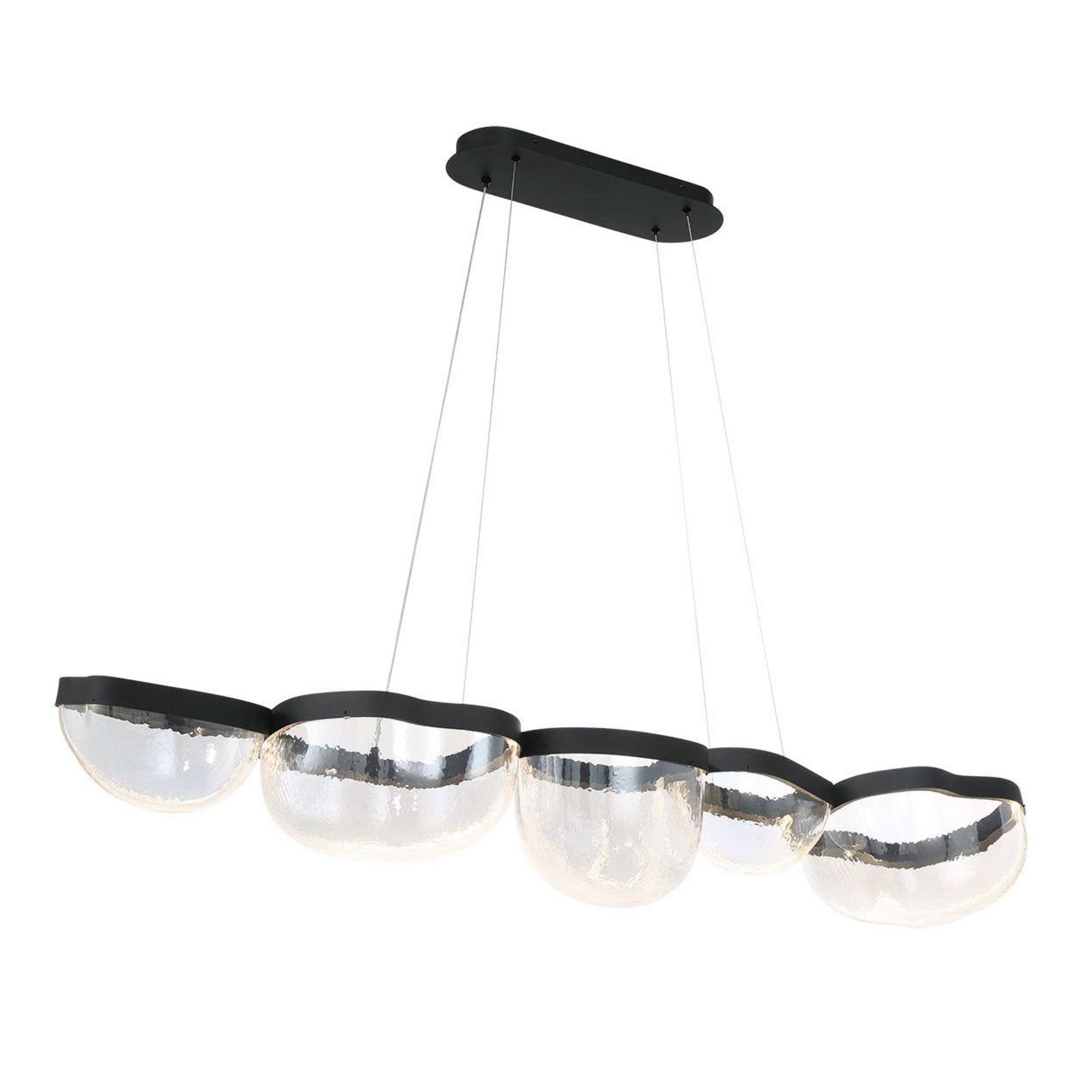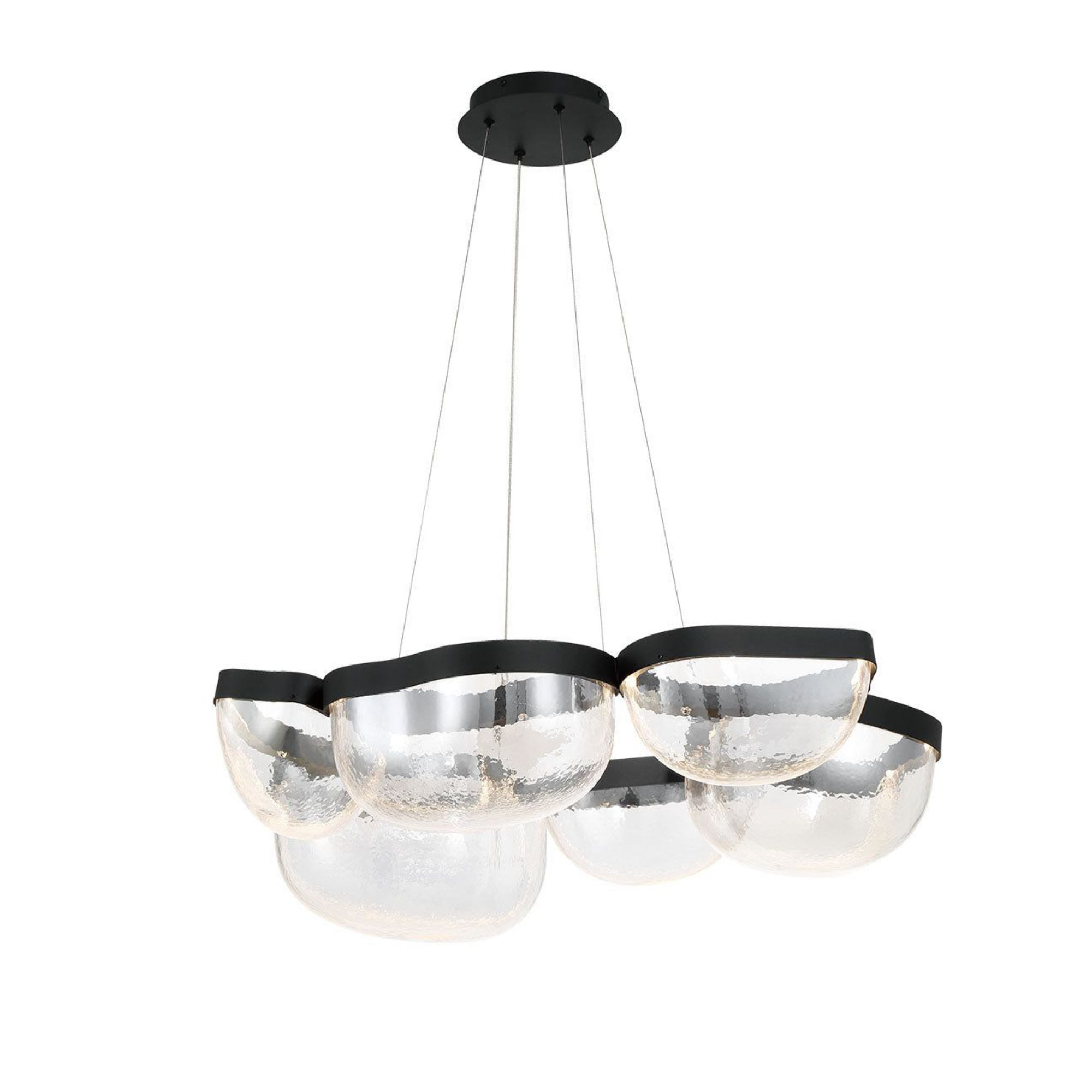 La source de lumière est intégrée de manière transparente dans le cadre noir élégant, illuminant les bols en verre soufflé à la main de l’intérieur et mettant en valeur leurs textures uniques et leur clarté.