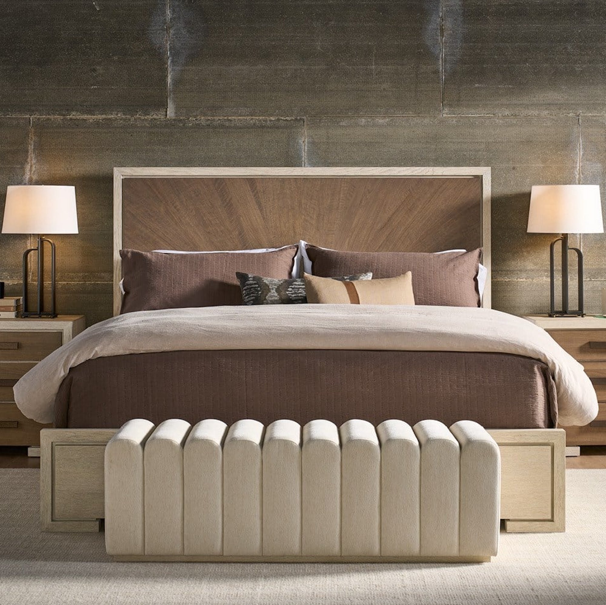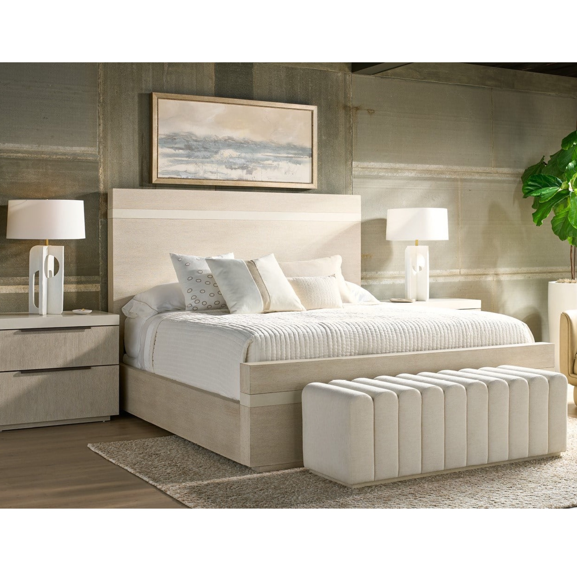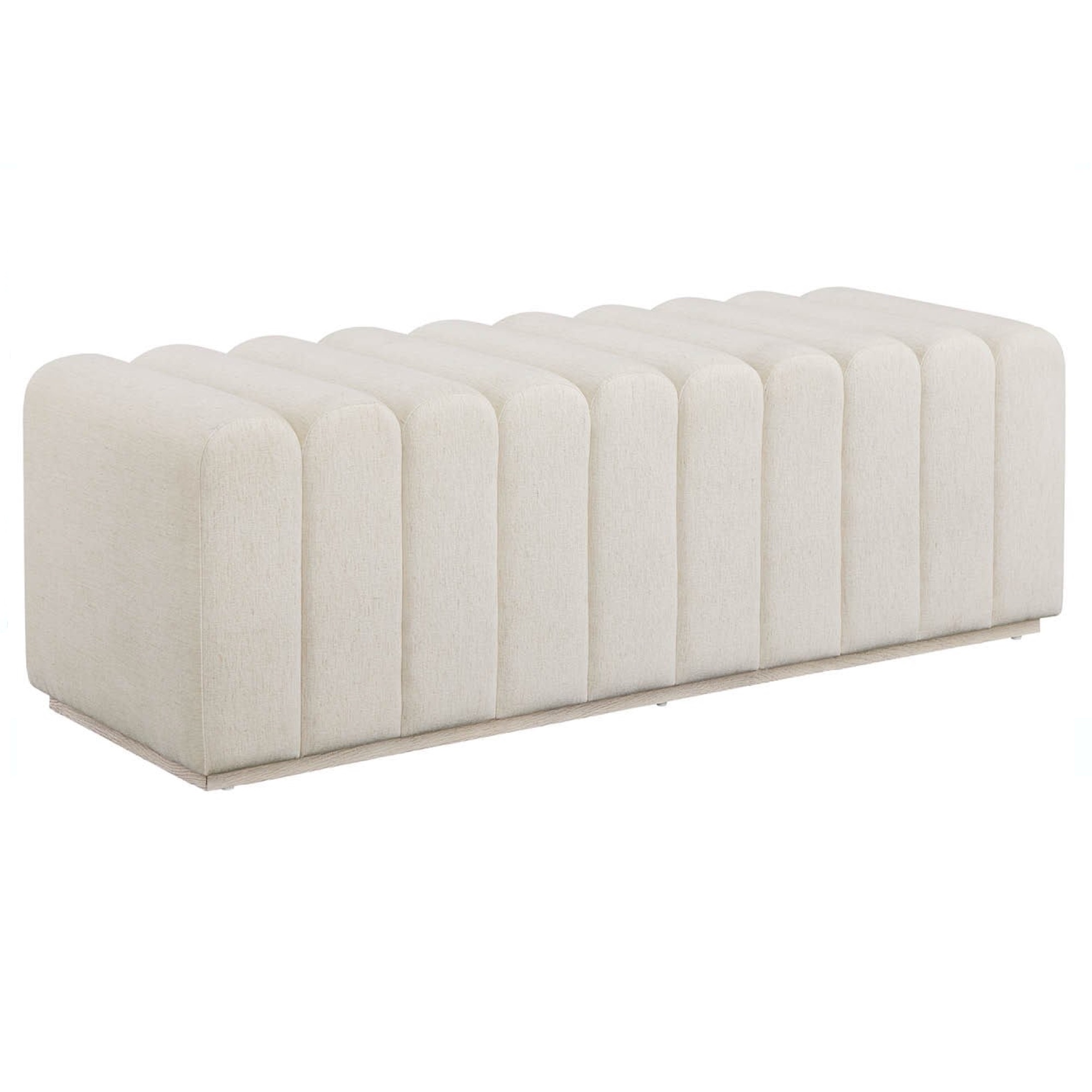 La banquette Strata est une banquette de lit tapissée qui présente des canalisations verticales frappantes dans un tissu Levi Oyster doux. Reposant sur un socle bas en Mist Oak, le Strata Bench est la pièce d’accent parfaite pour compléter une chambre à coucher sophistiquée.