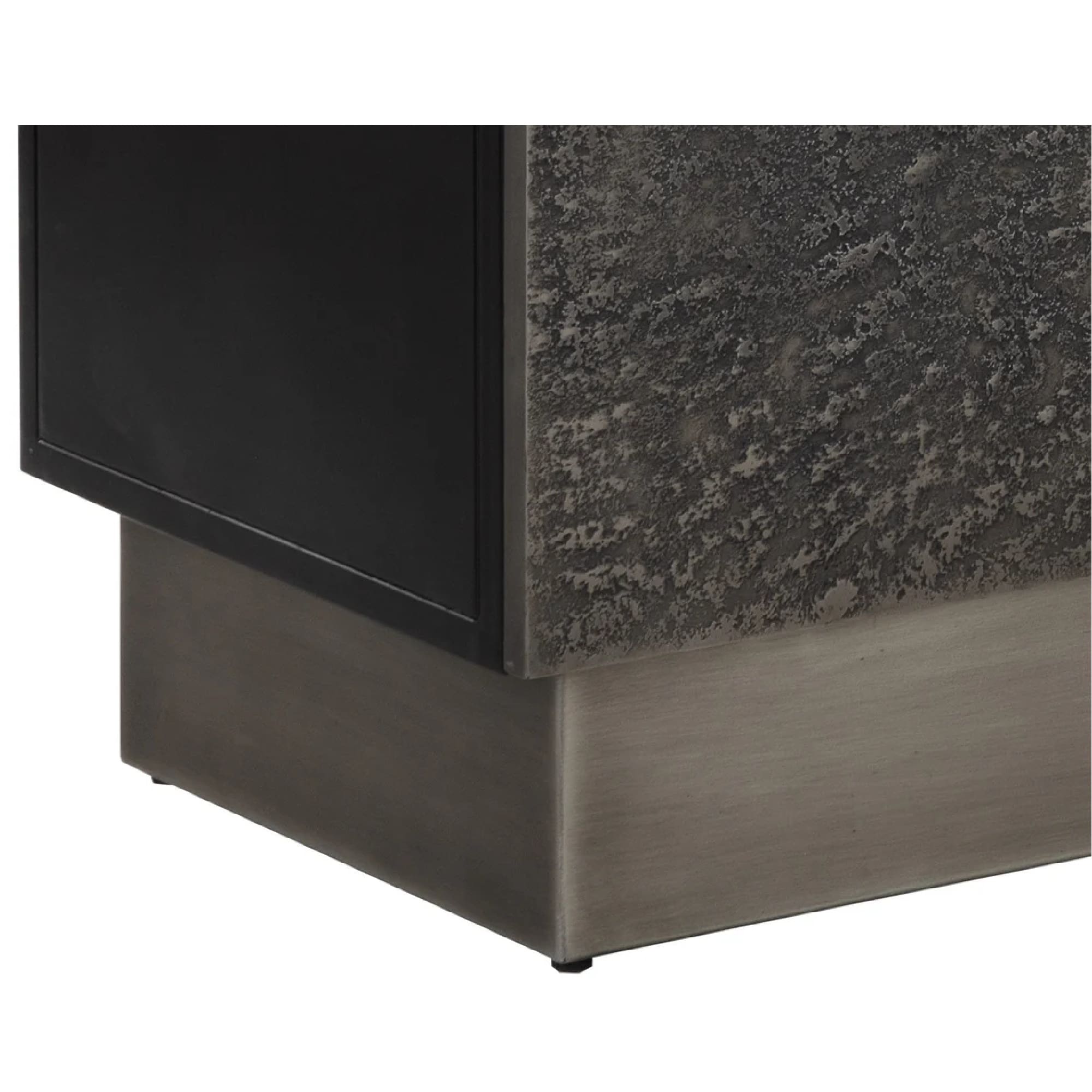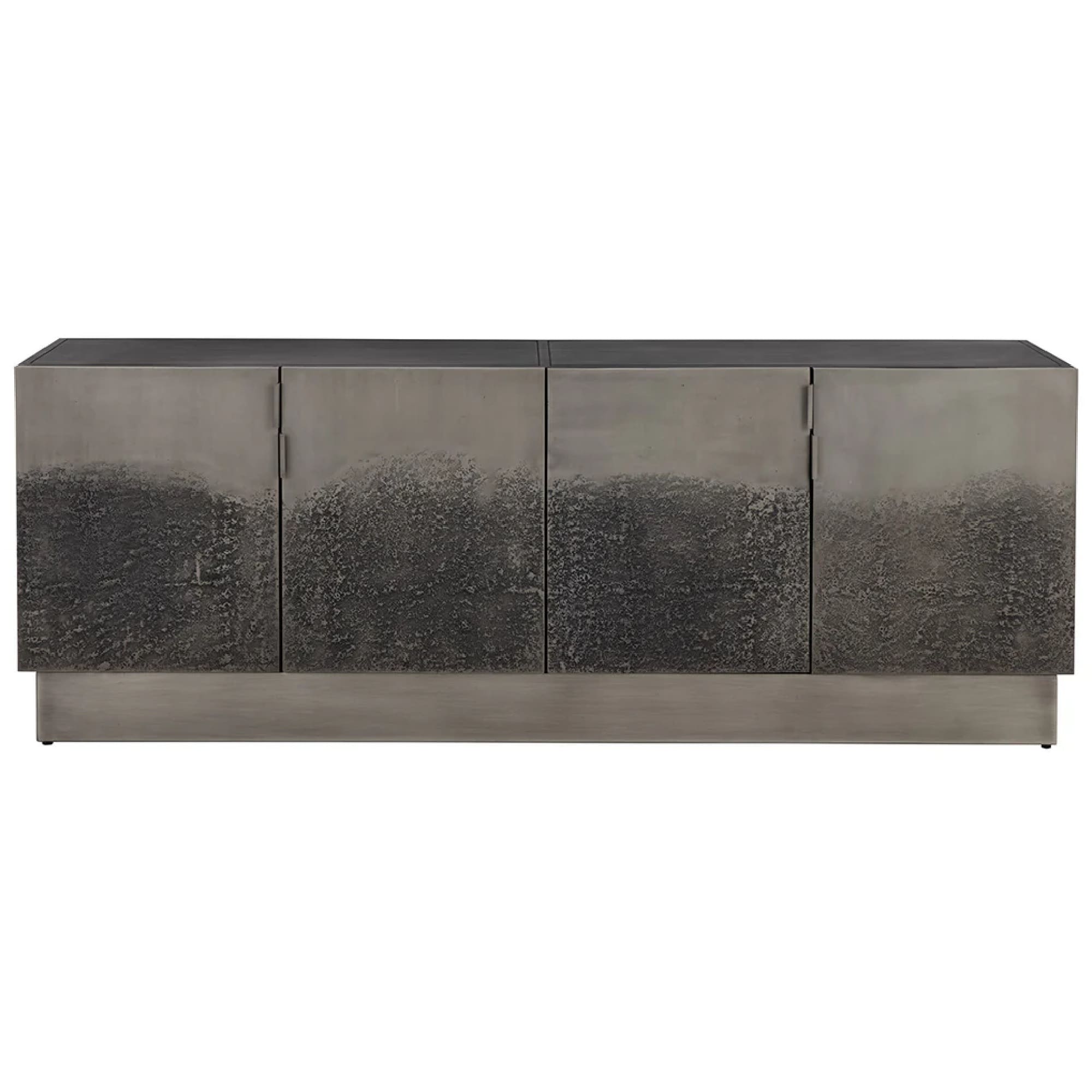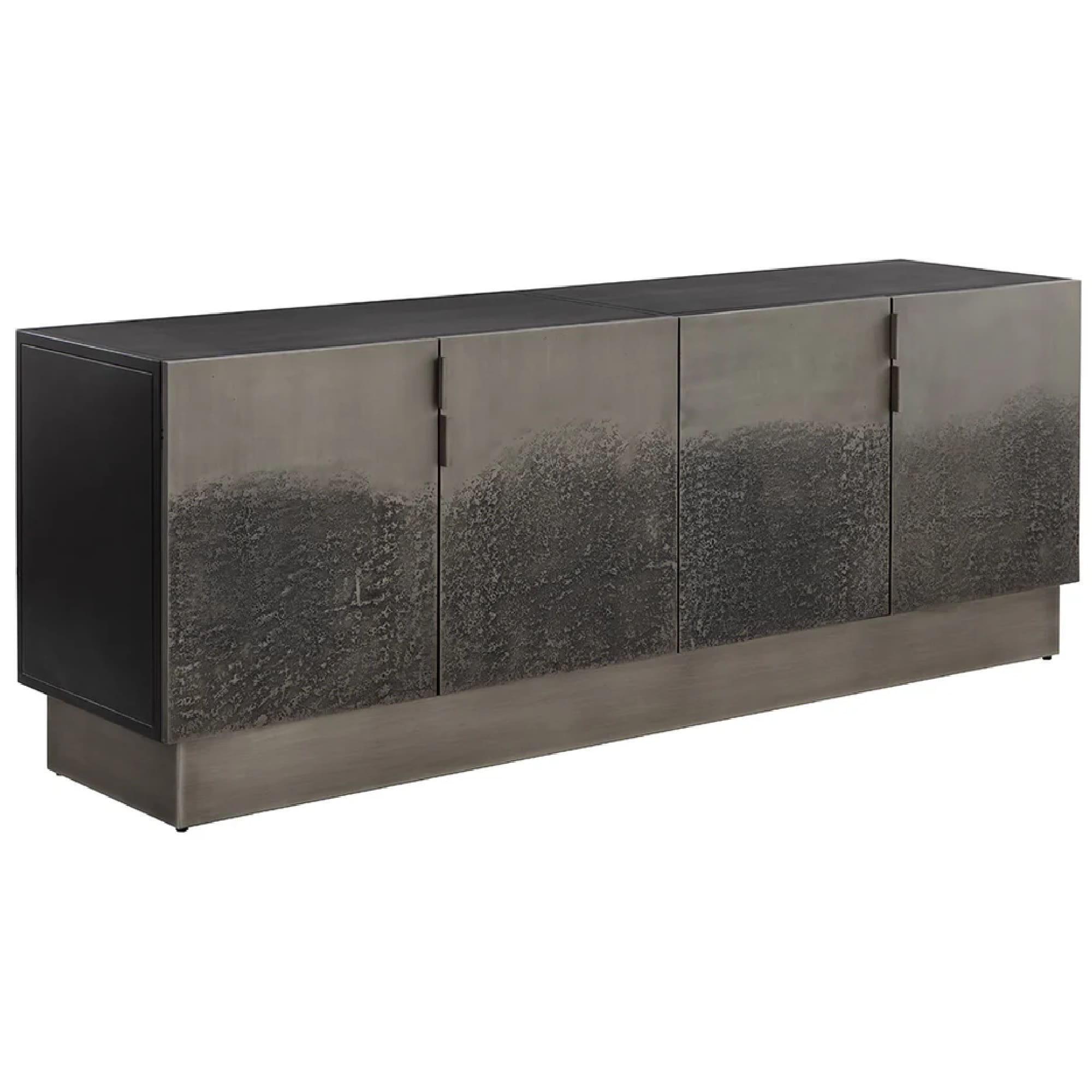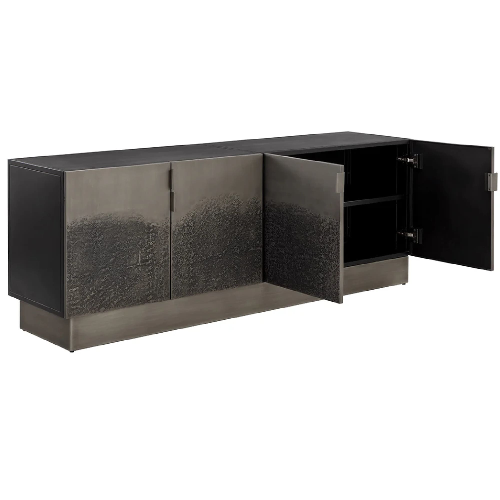 Quatre portes en aluminium texturé nickel antique, avec un cadre en fer au fini noir poudré.