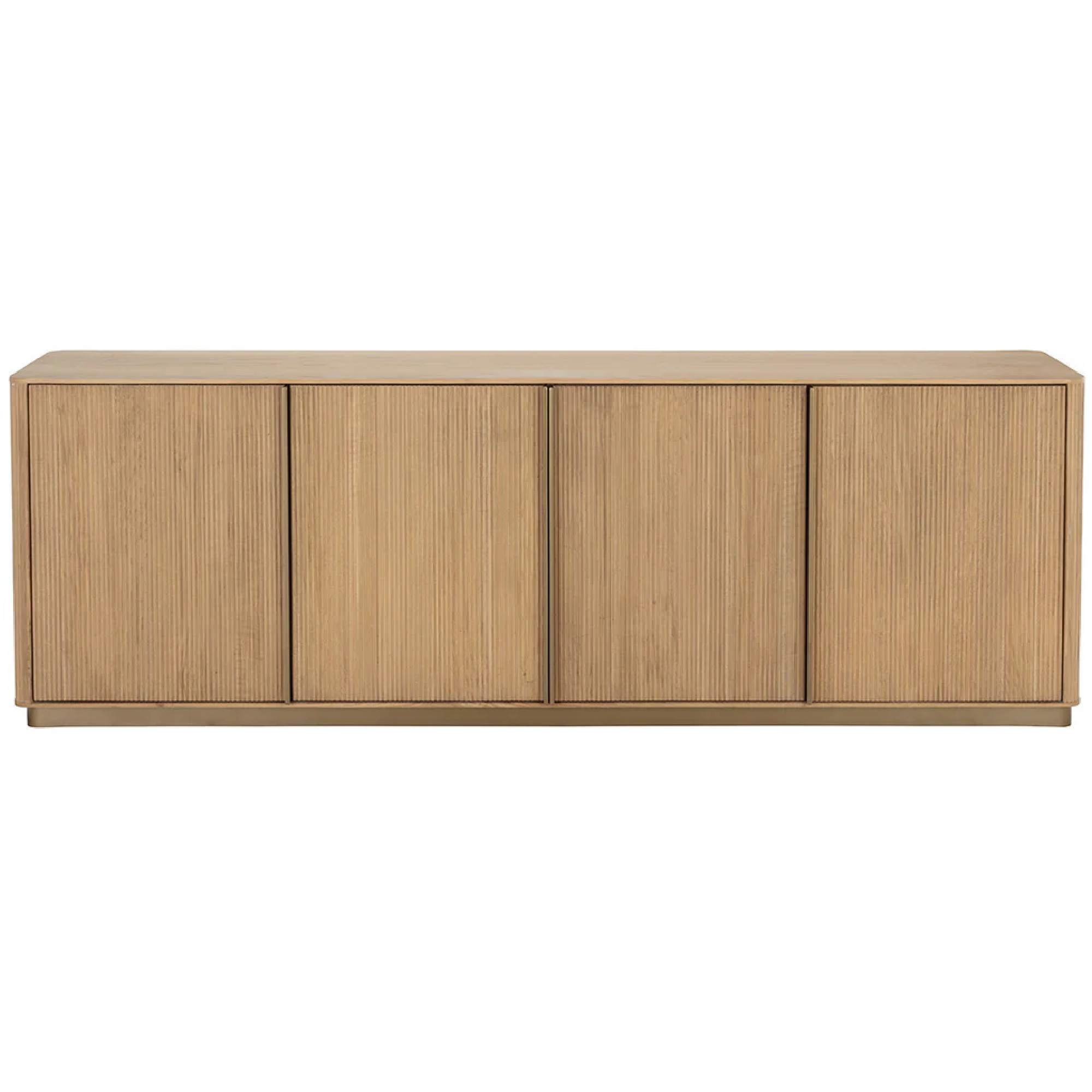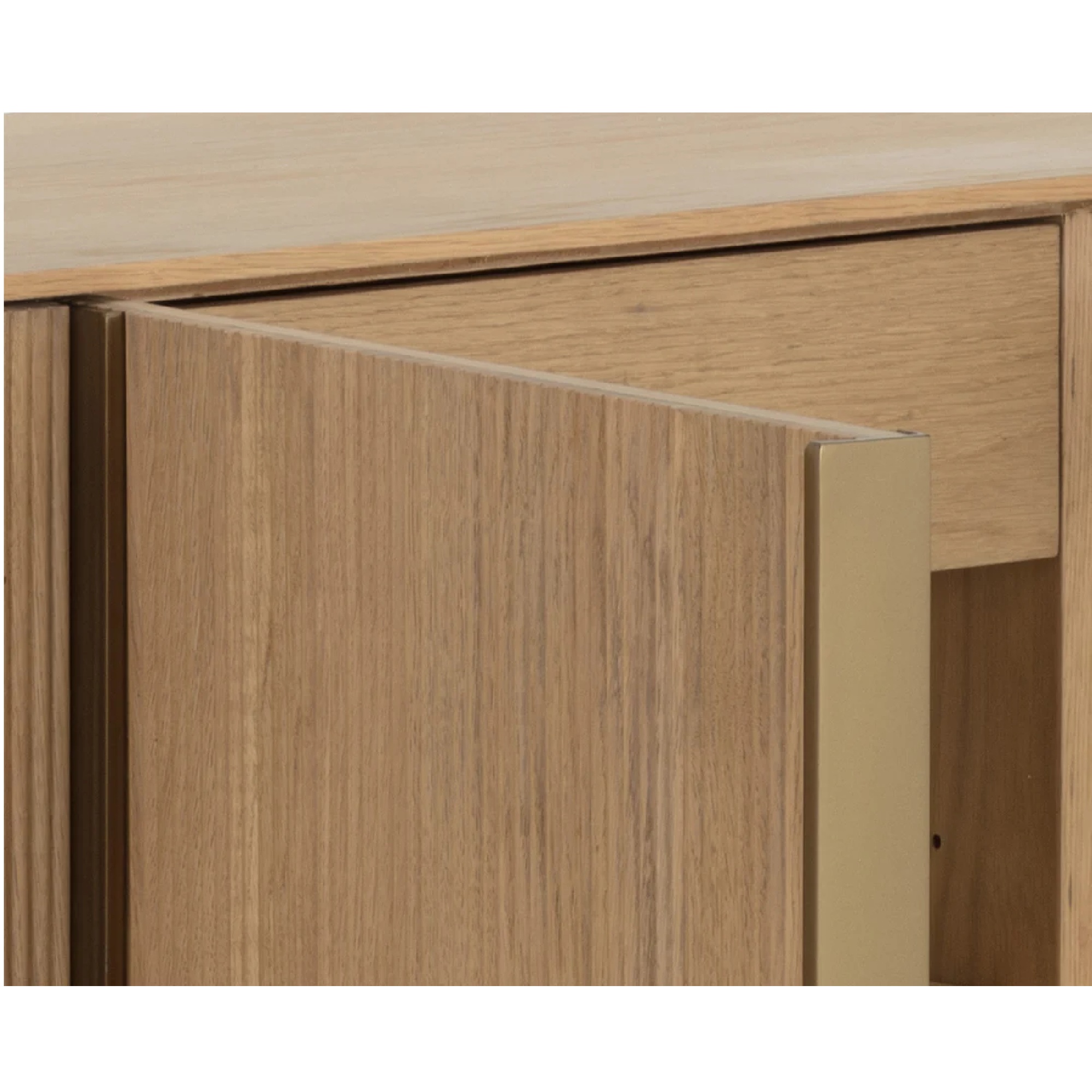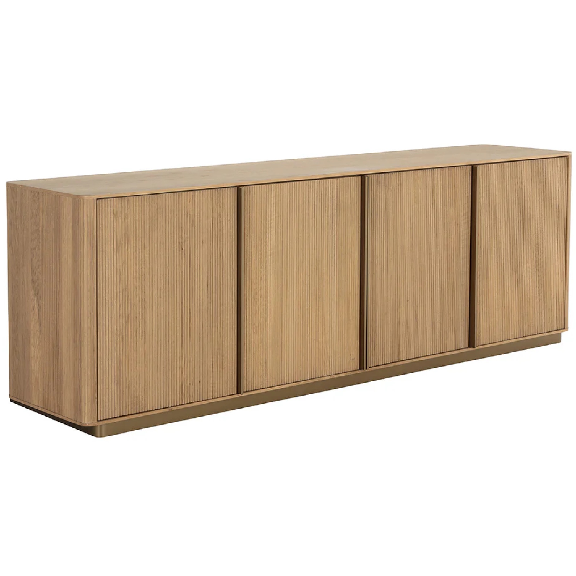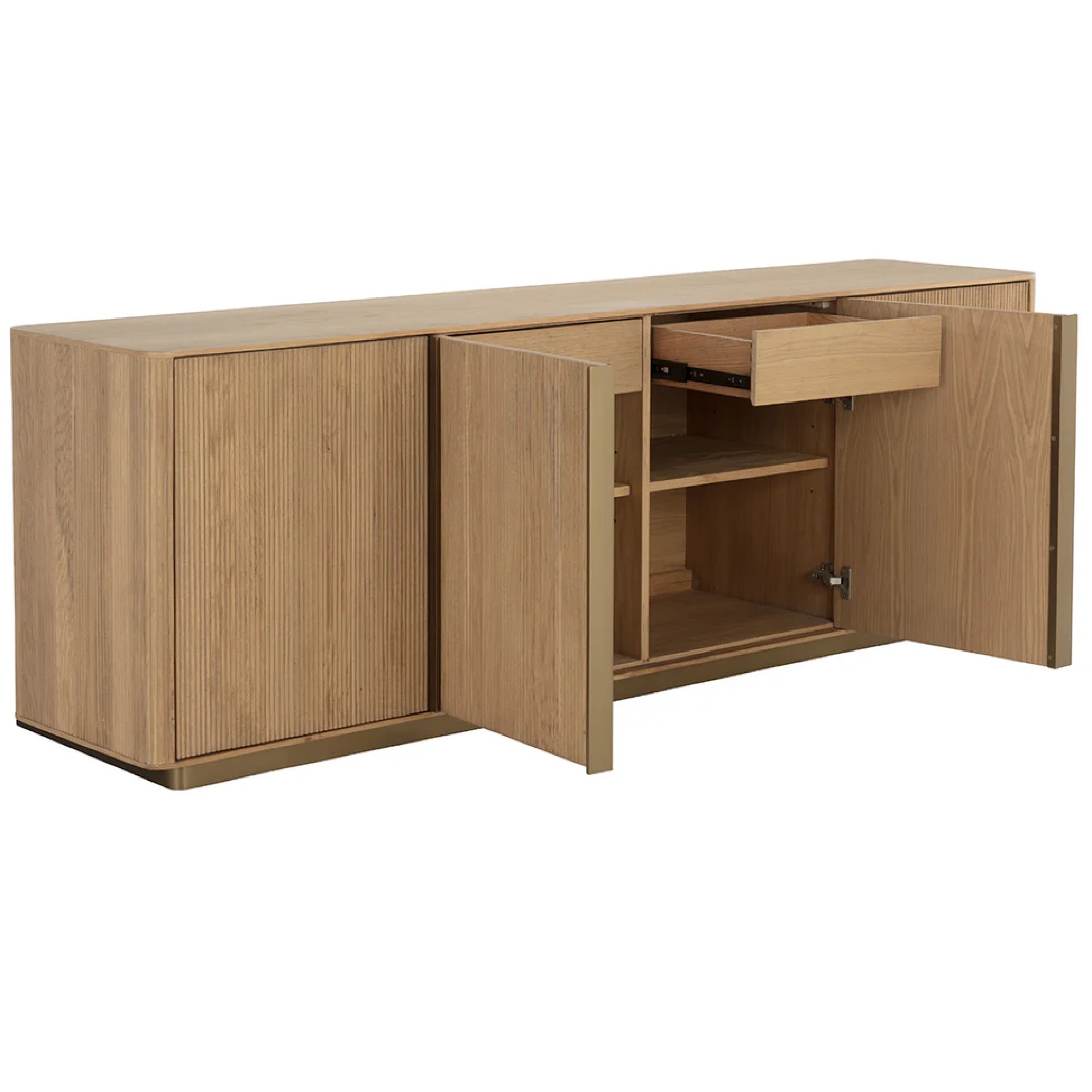 La commode Kalla allie forme et fonction. Elle est fabriquée avec un placage de chêne rustique et des cannelures verticales. Une base en acier doré complète l’ensemble. Le bois étant un matériau organique et poreux, ces pièces présentent des variations naturelles de texture et peuvent également présenter de fines indentations et fissures. Les pièces de bois présentent également une disparité de couleur et de grain, ainsi que des nœuds et des loupes visibles qui ajoutent au caractère de chaque pièce.