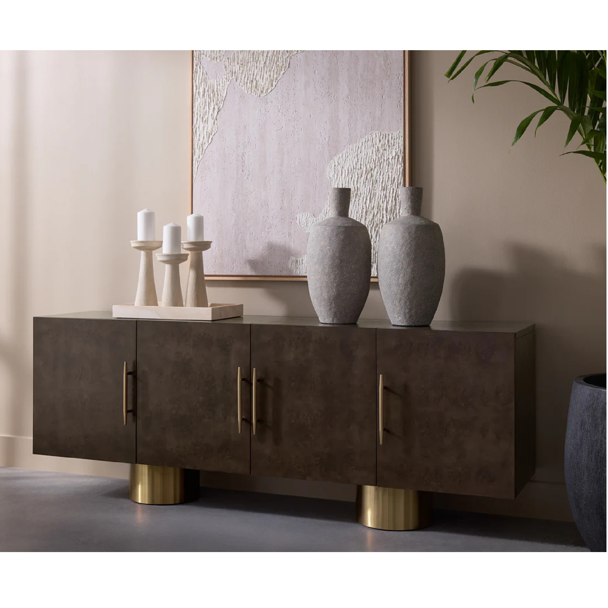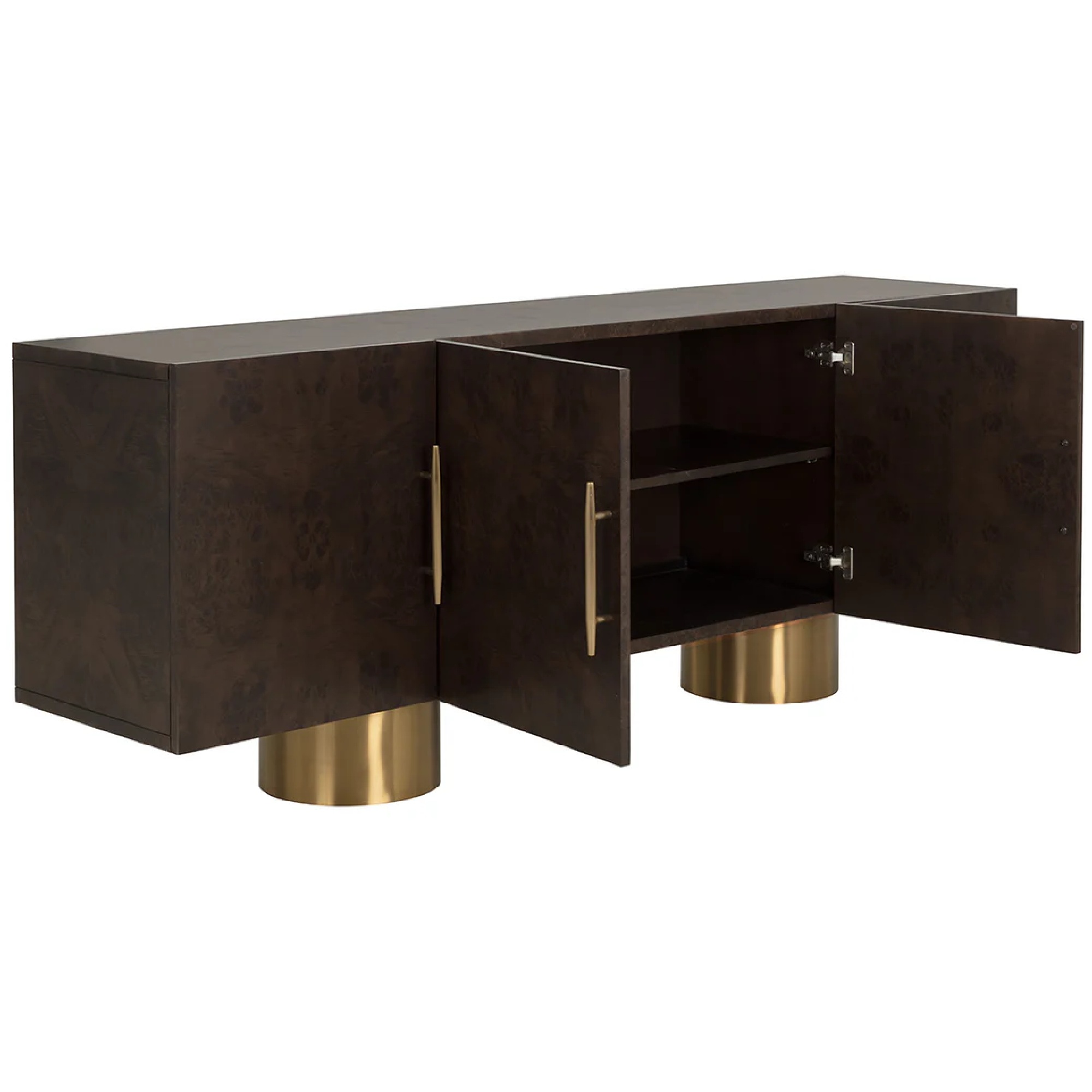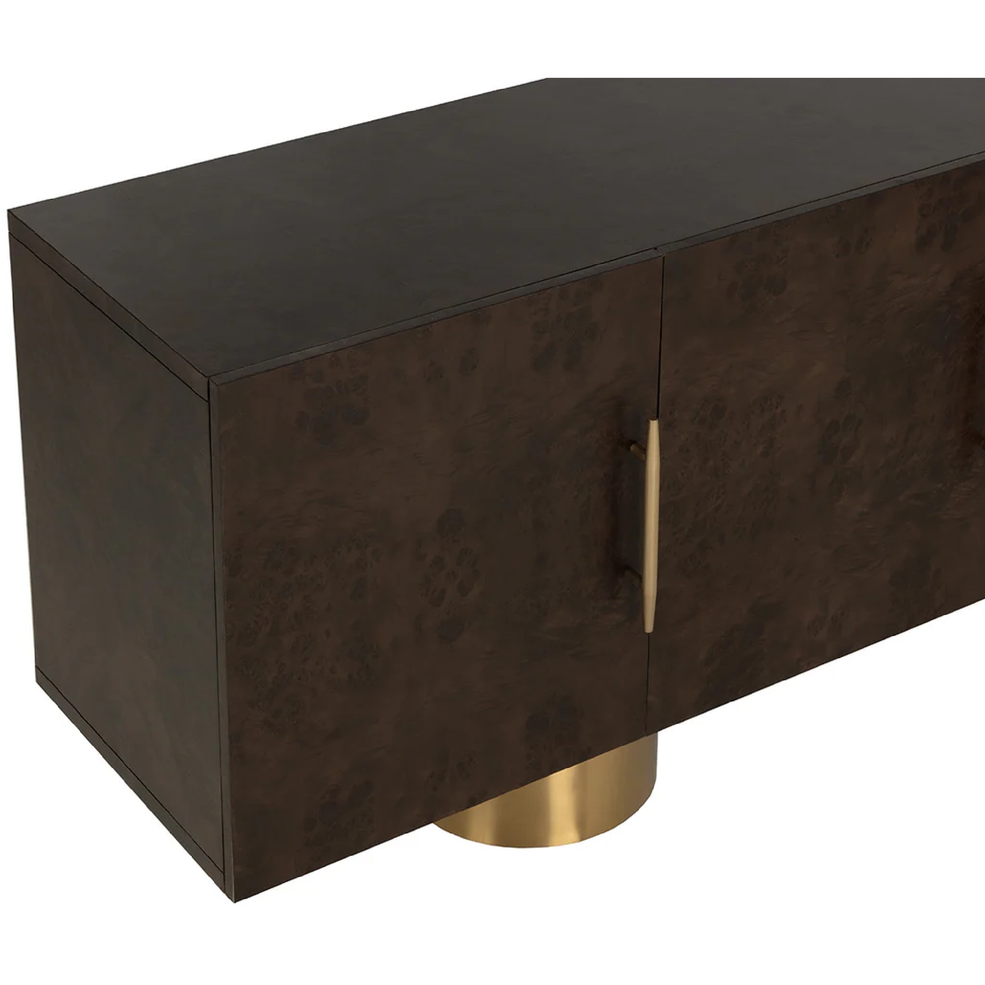 Avec ses riches teintes brunes et ses touches d’acier inoxydable doré, le buffet Kresteven confère à tout espace un air de luxe discret. Les motifs tourbillonnants complexes et les nuances marbrées du placage en ronce d’érable soulignent la qualité de l’artisanat et la modernité du design.