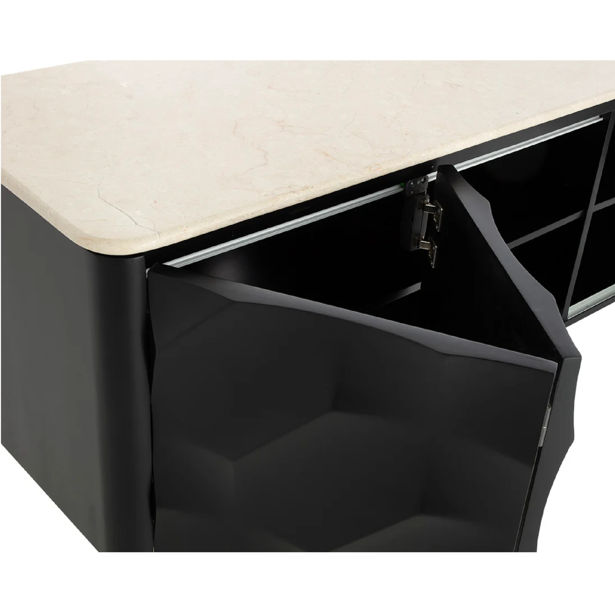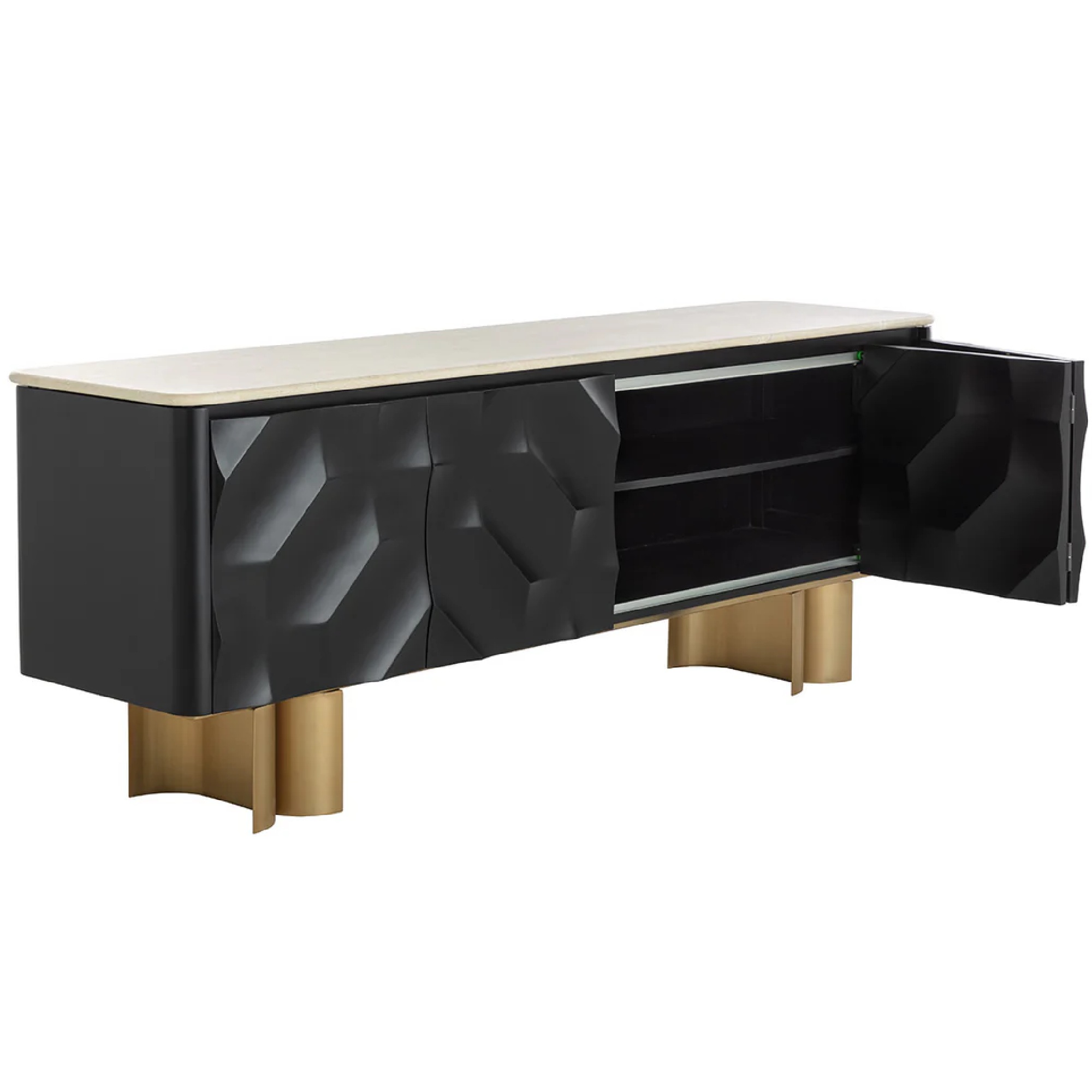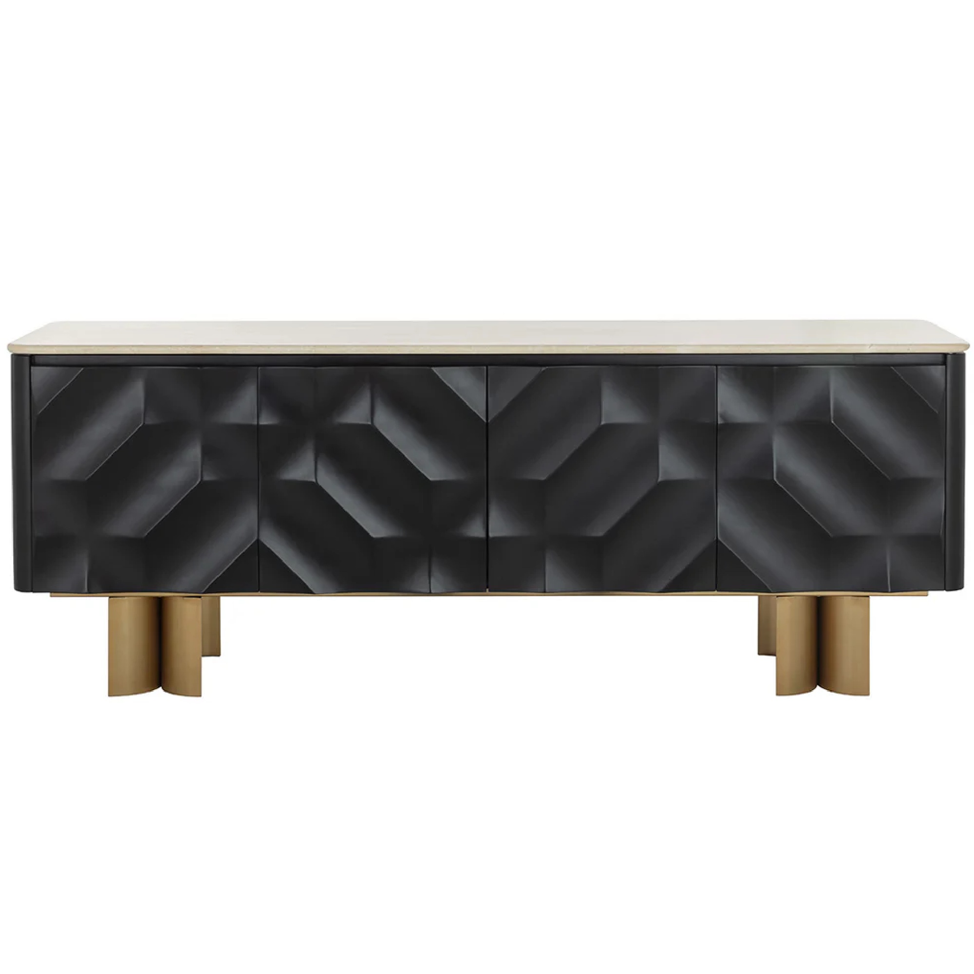 Un design audacieux et des matériaux mixtes confèrent une présence moderne au buffet Lautrec. Fabriqué en acier inoxydable et doté d’un superbe plateau en marbre crème, le buffet Lautrec présente des formes texturées captivantes sur les portes coulissantes avant. Il est soutenu par des pieds incurvés en finition laiton antique.