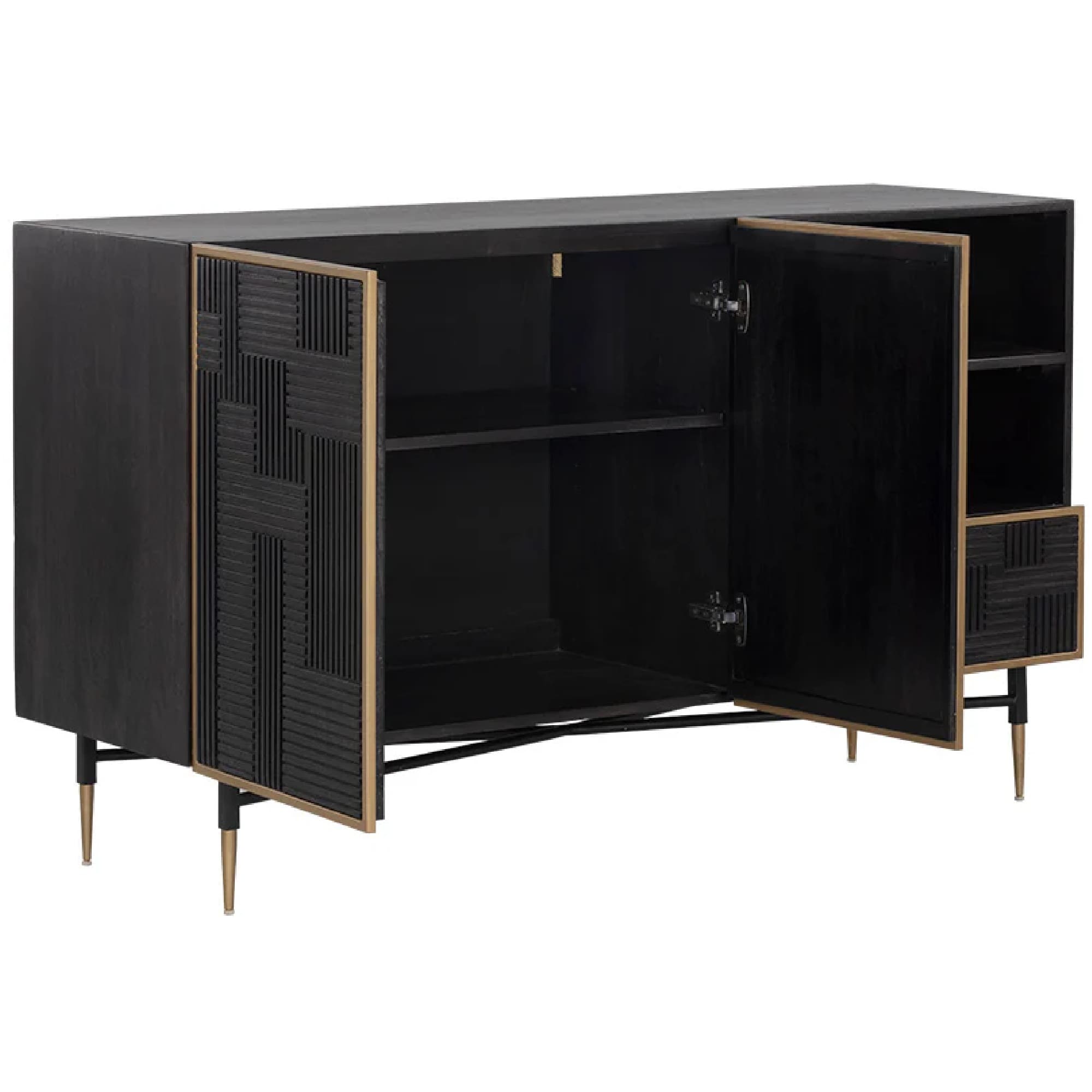 Le bois de manguier brun foncé et le cadre en laiton antique créent un look moderne. Comprend deux cabinets, des tablettes et un tiroir offrant un vaste espace de rangement.