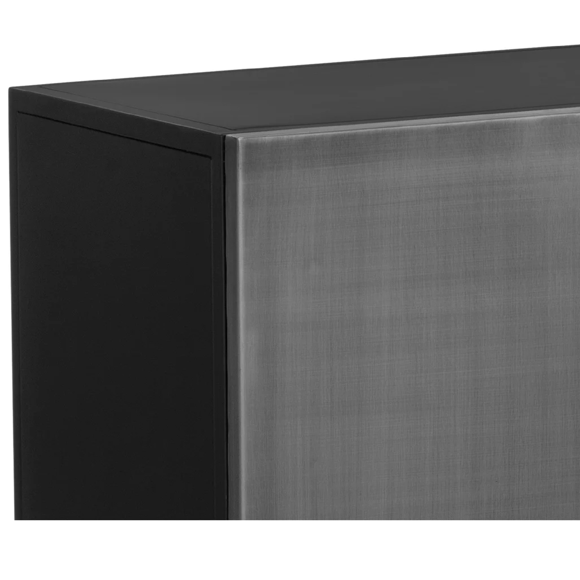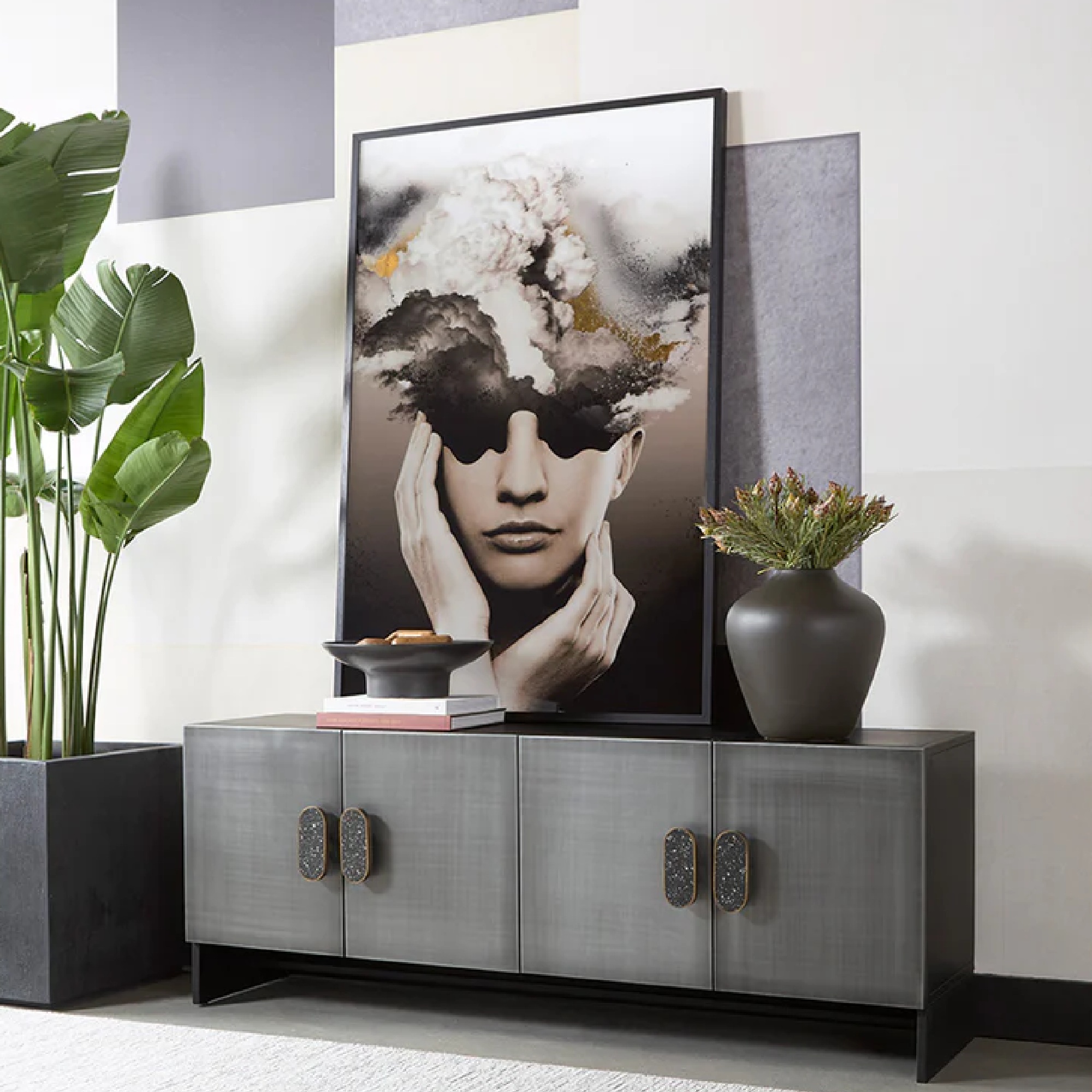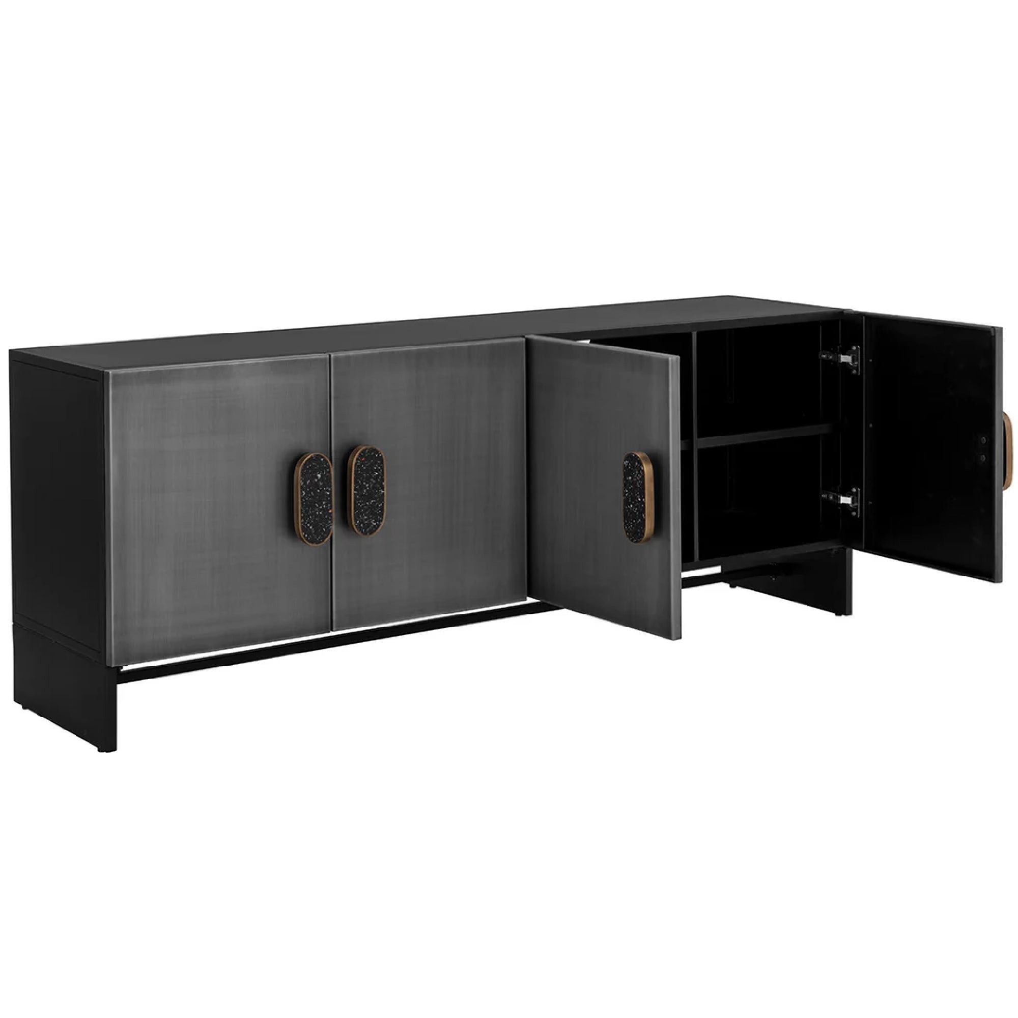 Créez une ambiance sombre et sophistiquée avec le buffet Viserys, doté d’un cadre revêtu de poudre noire, de poignées en marbre terrazzo noir et de portes en fer zingué antique pour un aspect vivant et élégant. Fabriquée en Inde par des artisans qualifiés, chaque pièce présente des variations artisanales uniques qui en font une pièce unique.