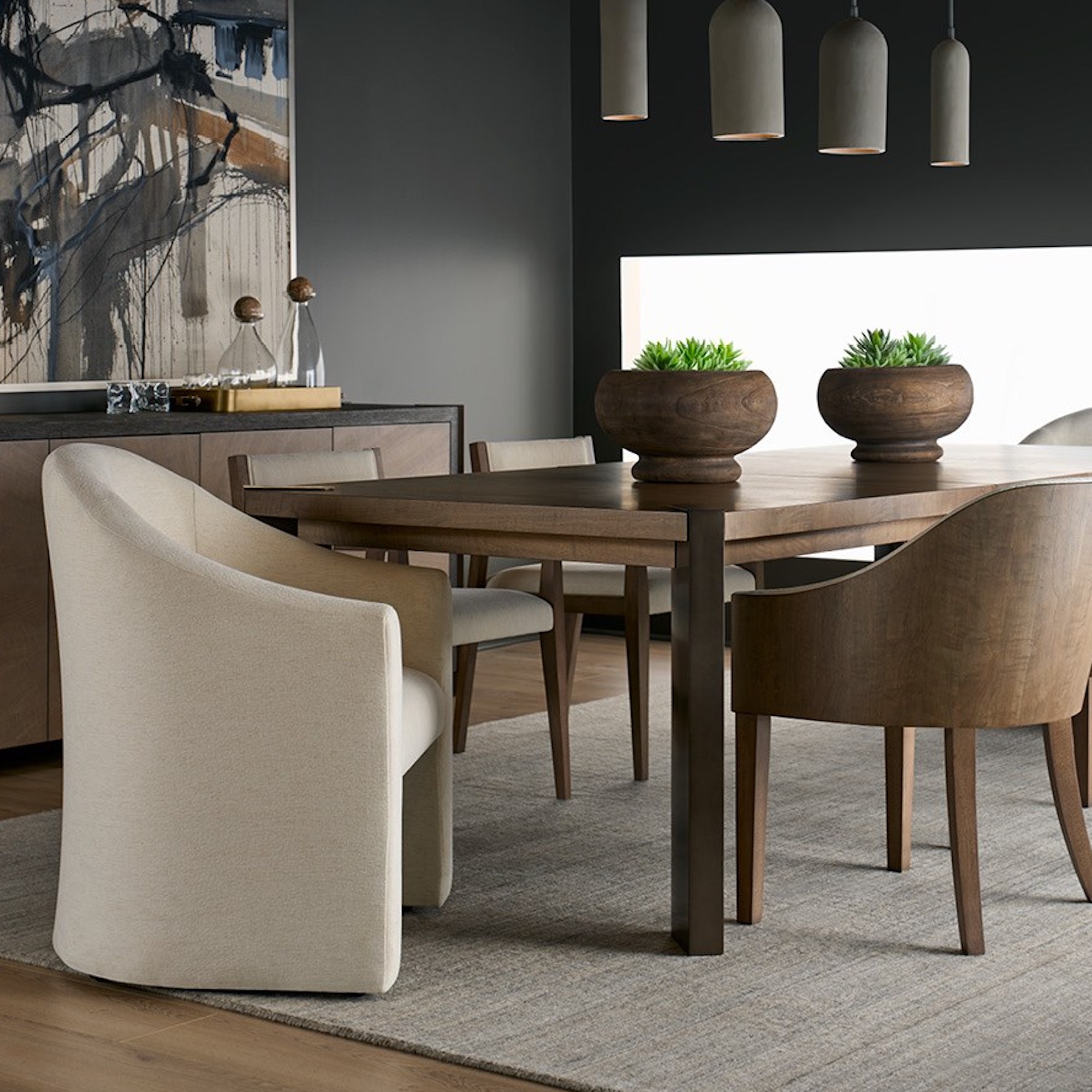 La chaise Lumen est une chaise de salle à manger confortable, au dossier en forme de tonneau, dotée de roulettes subtiles pour faciliter les déplacements. Rembourrée en tissu Levi Oyster, la chaise Lumen allie le confort traditionnel à la mobilité moderne.