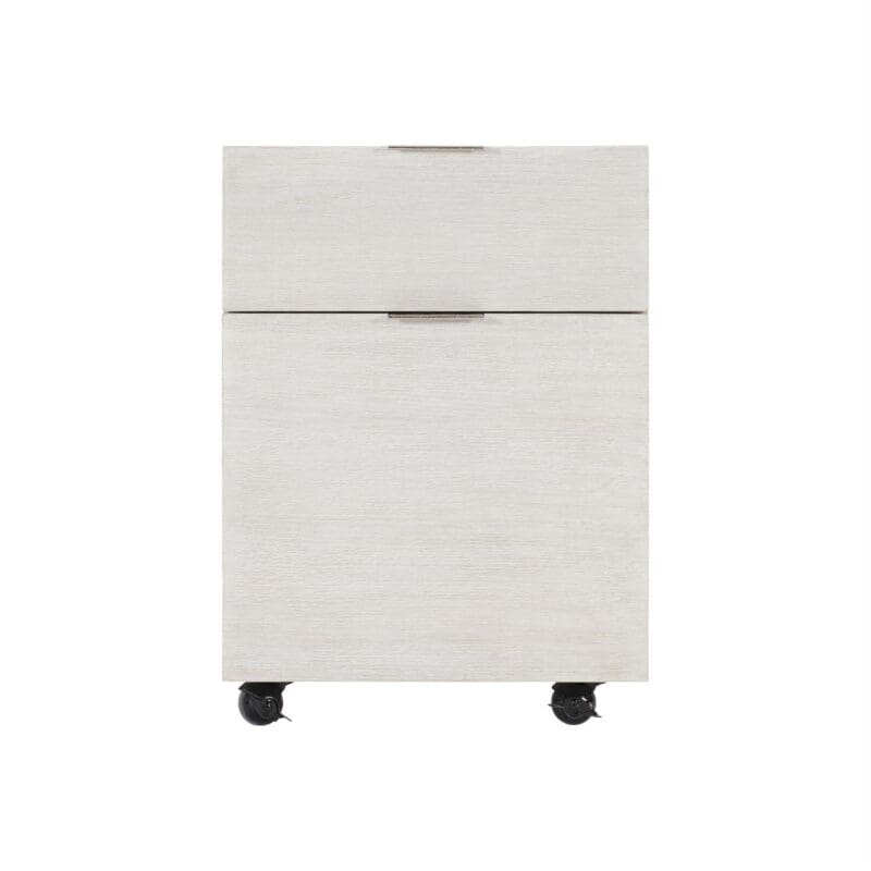 Le classeur Solaria est épuré, simple et essentiel. Doté de placages de chêne blanc dans une finition Weathered Bone, le meuble abrite deux tiroirs de bureau avec une quincaillerie en métal élégant dans une finition nickel brillant. Le tiroir du bas comprend des barres de suspension amovibles pour les dossiers de type lettre ou légal. Les roulettes permettent la mobilité.