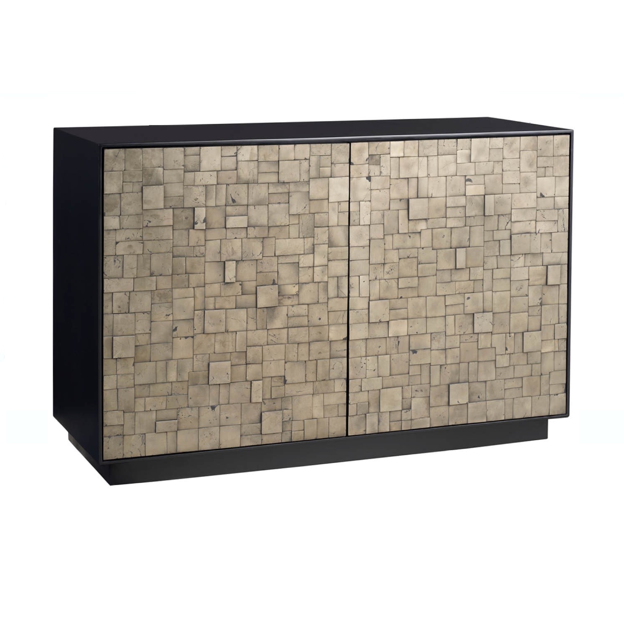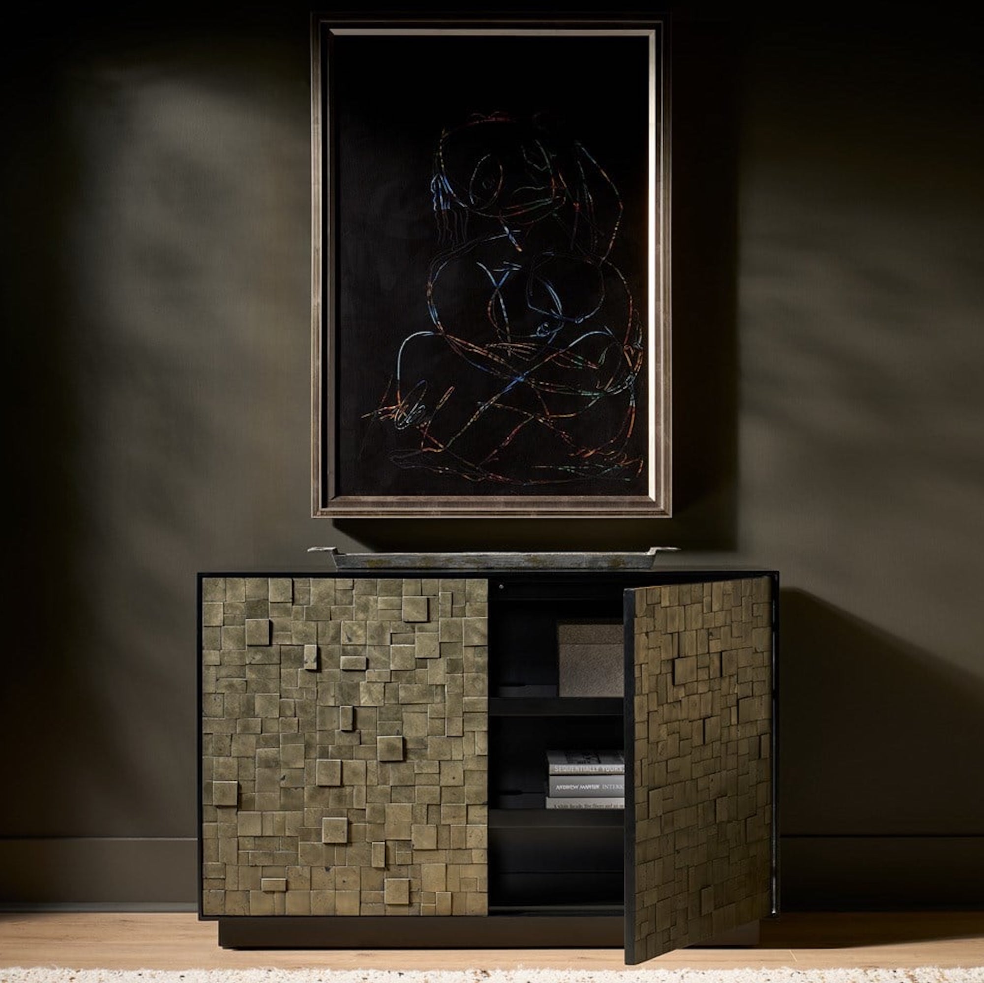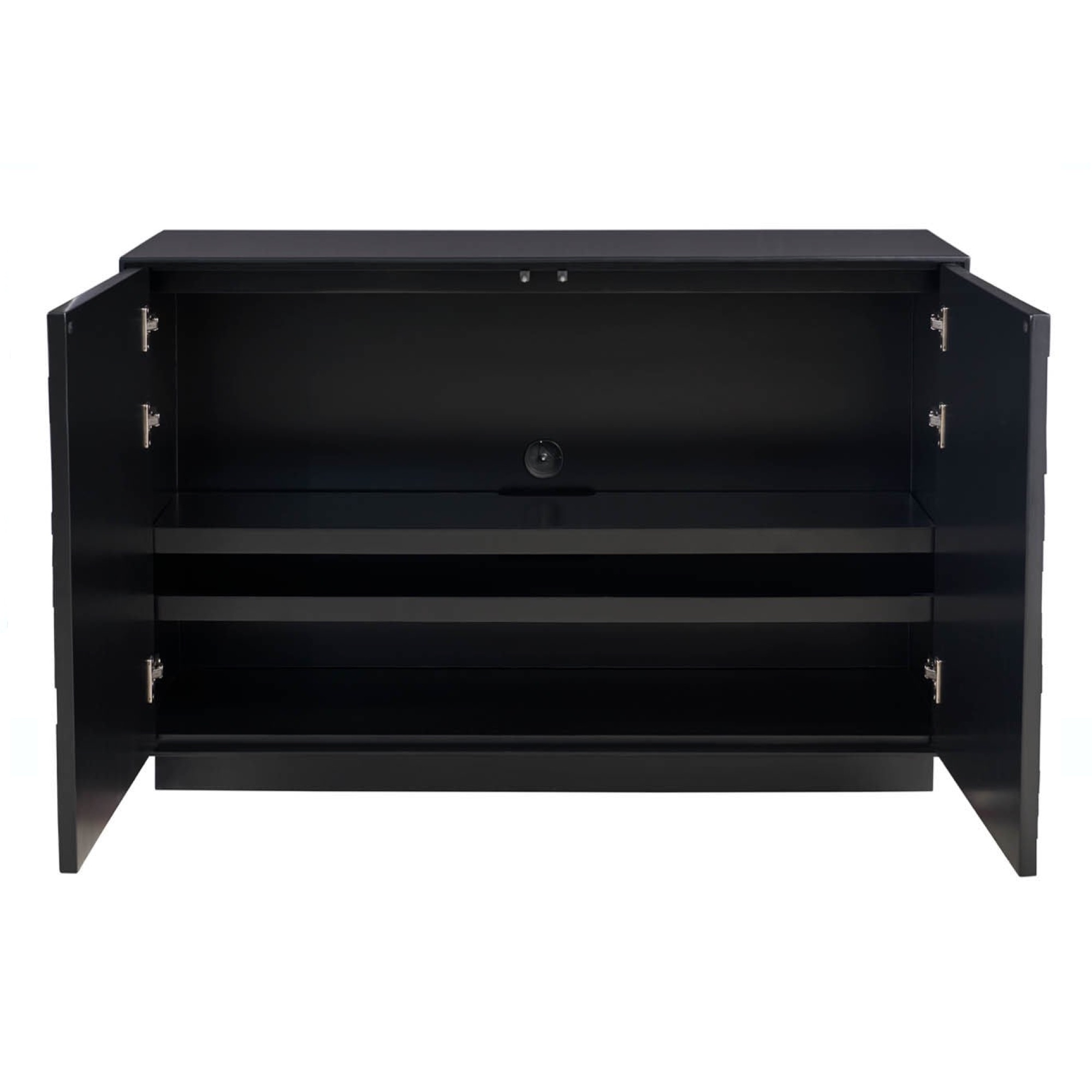 La commode Cosmo est une commode spectaculaire à deux portes dont le corps et les portes sont peints en noir mat et recouverts d’une texture de pyrite scintillante. Le coffre Cosmo comporte des découpes pour la gestion des câbles, ce qui en fait une pièce fonctionnelle pour le rangement des médias.