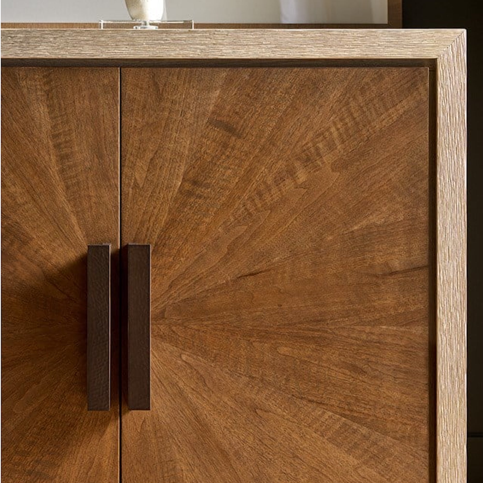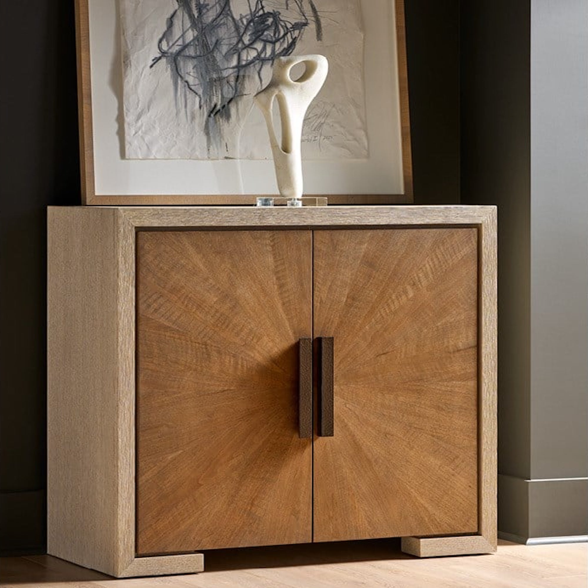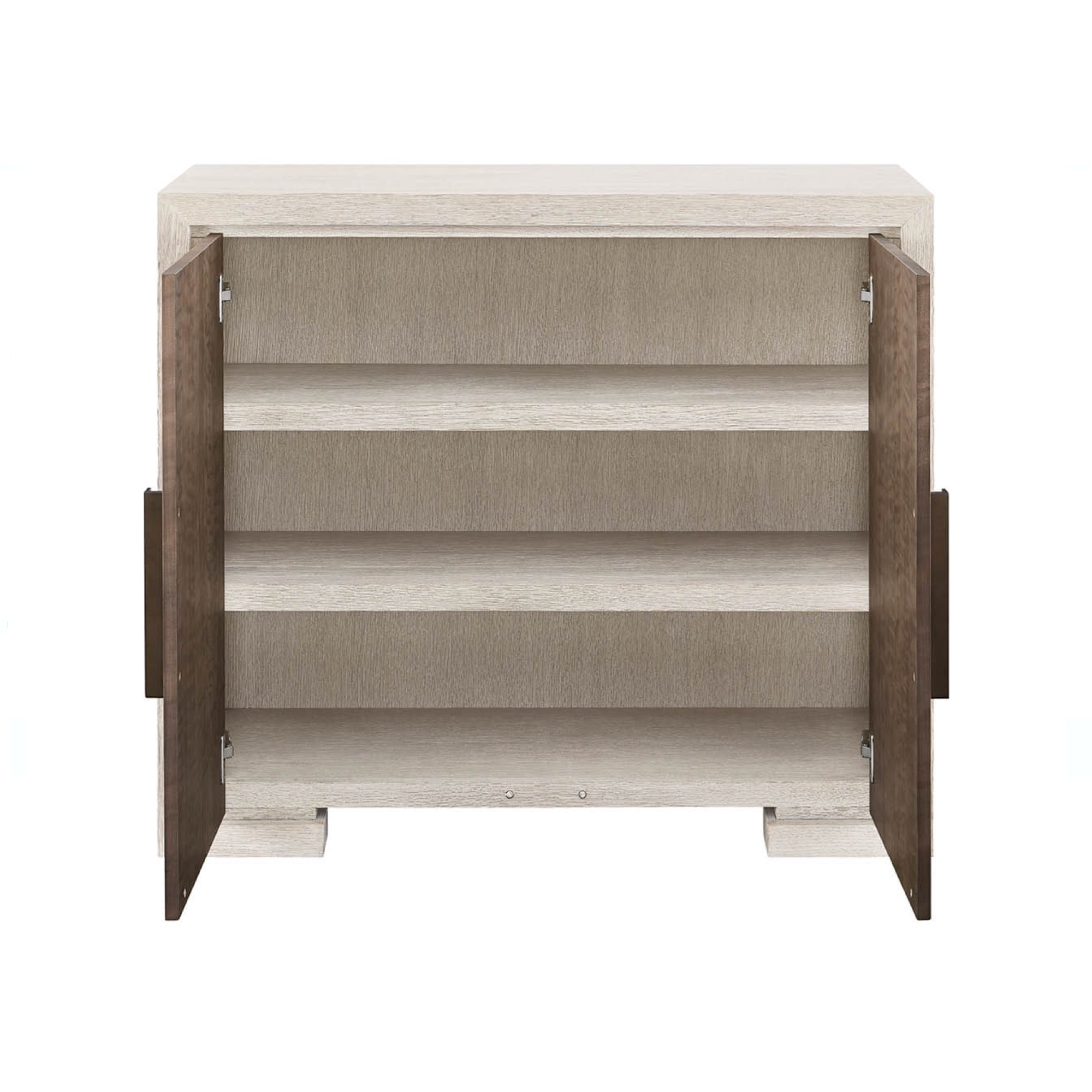 La commode Mist Hall est une armoire à deux portes finie en chêne Mist clair avec des façades de portes en noyer Haze contrasté. Cette pièce offre un rangement compact et élégant et constitue un accent vertical raffiné.