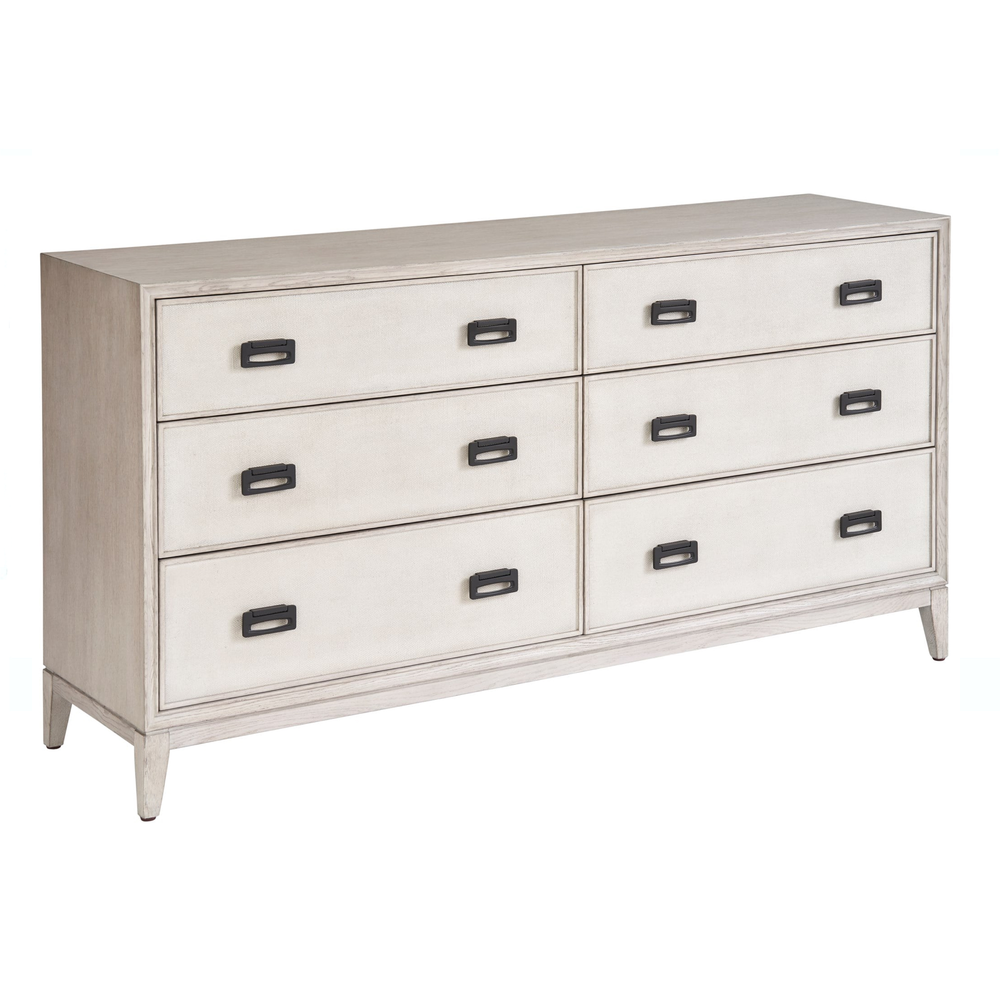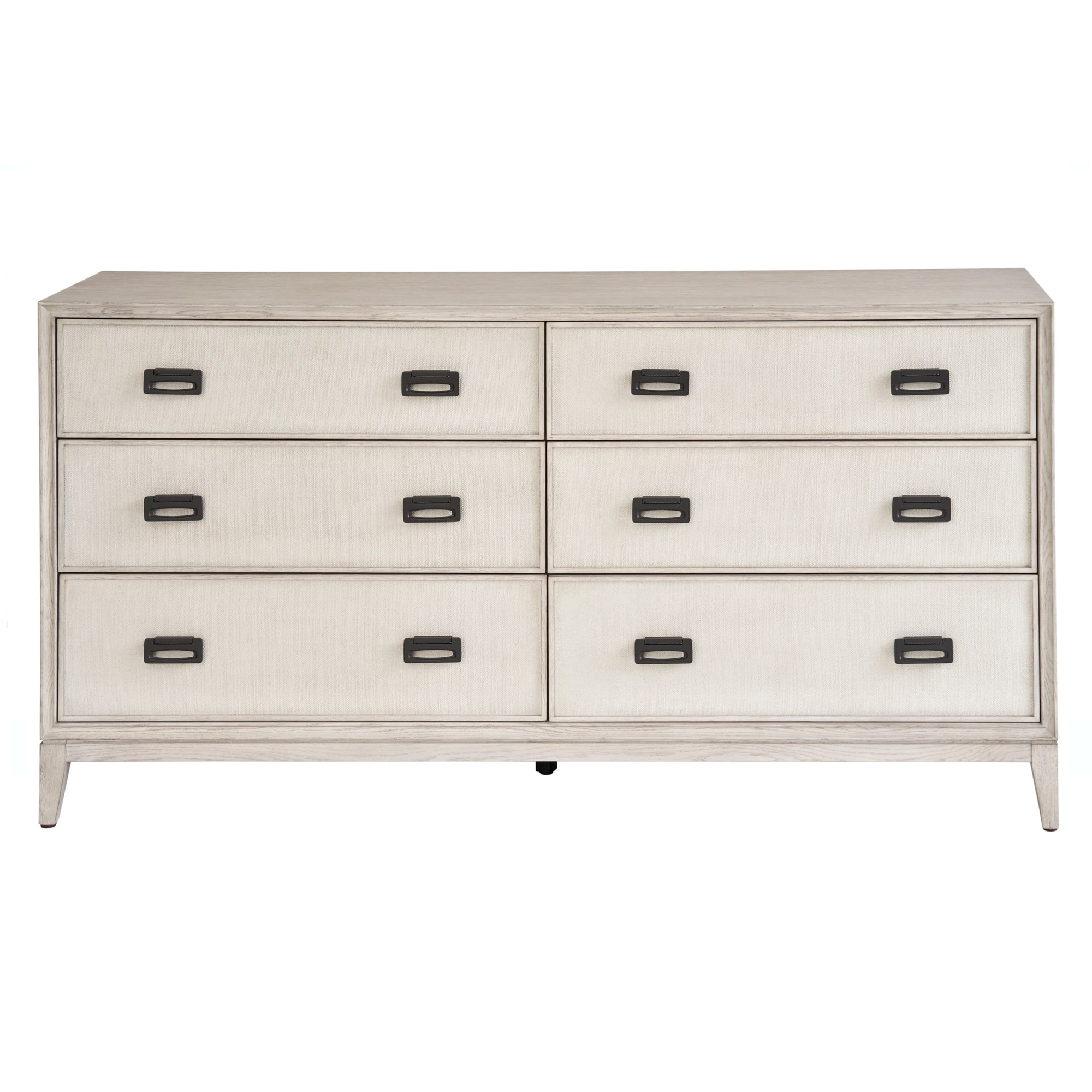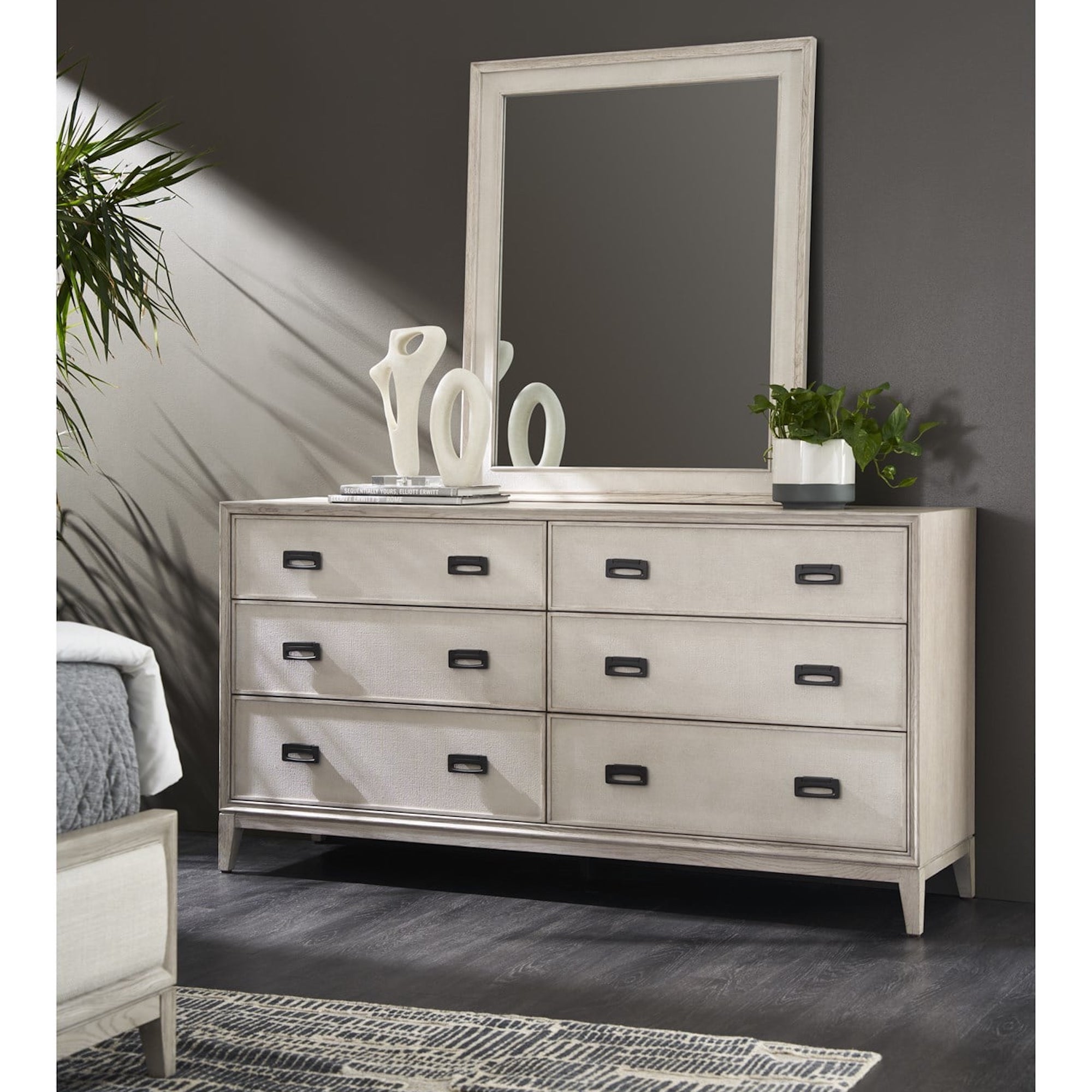 La commode Estelle, ornée du serein fini Rolling Fog, abrite élégamment six tiroirs aux façades texturées en faux lin, offrant une solution de rangement sophistiquée qui fait écho à la tranquillité raffinée de la collection Coalesce.