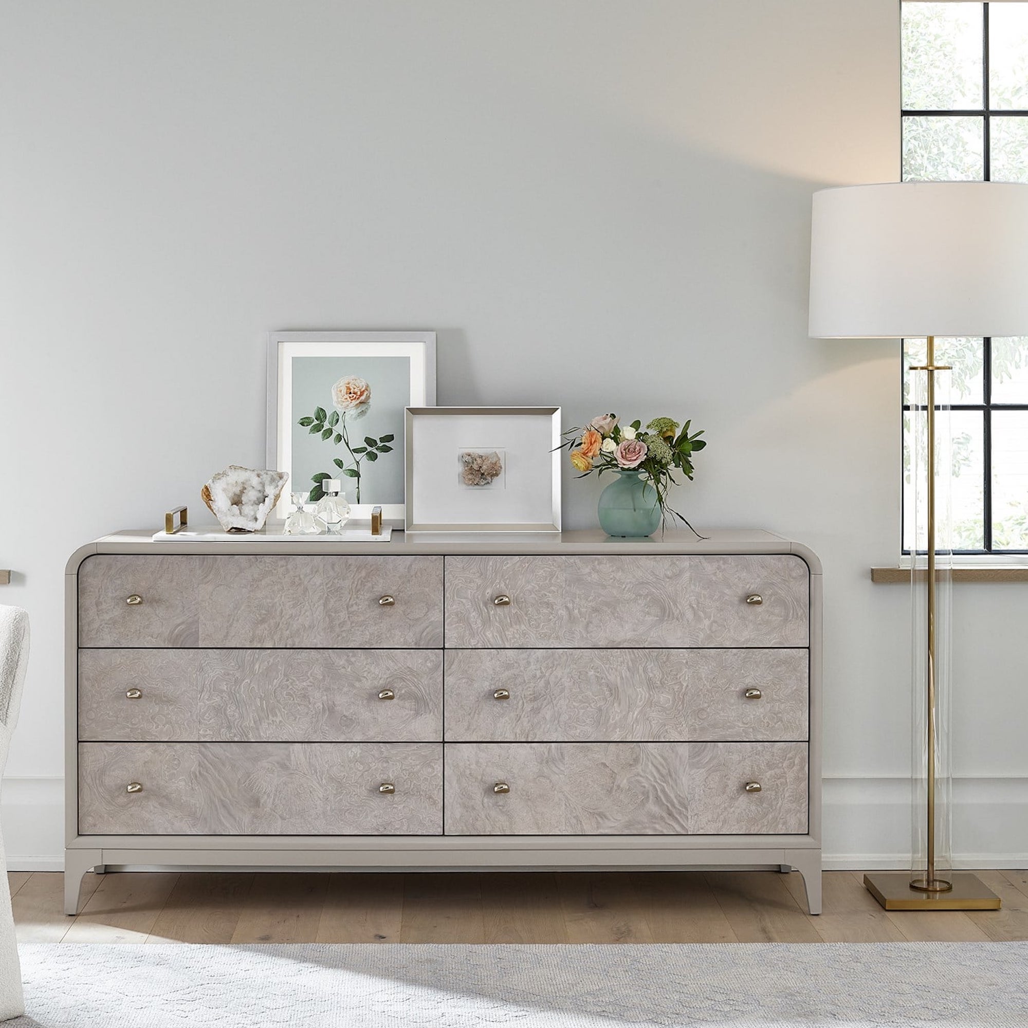 Apportez une sophistication essentielle à votre chambre à coucher avec la commode Immersion, une pièce d’apparat royale aux accents de ronce luxueux complétée par une quincaillerie à tirettes de rêve.