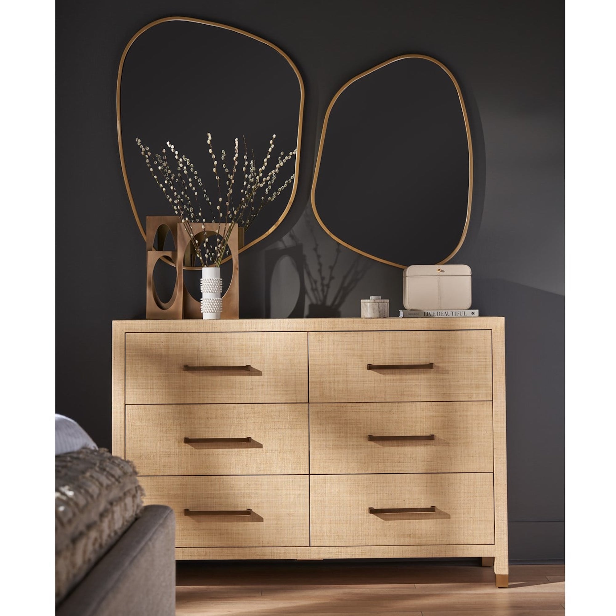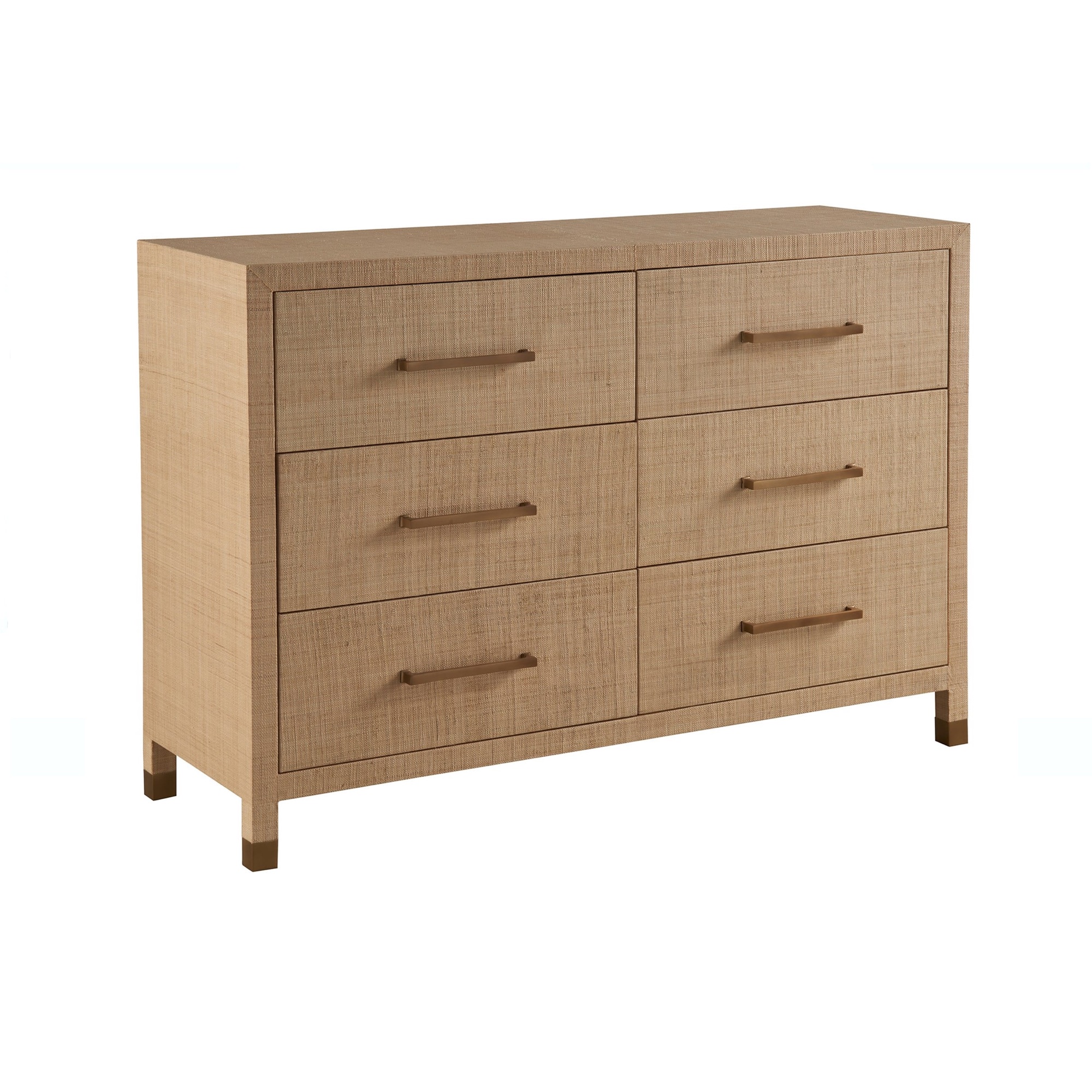 La commode Leah, dotée de six tiroirs, est élégamment enveloppée de raphia, ce qui lui confère un aspect texturé et sophistiqué. Complétée par une quincaillerie à barre bronzée et des accents de pieds, cette pièce rehausse tout espace grâce à son charme raffiné et distinctif, s’intégrant parfaitement dans les intérieurs modernes et classiques.