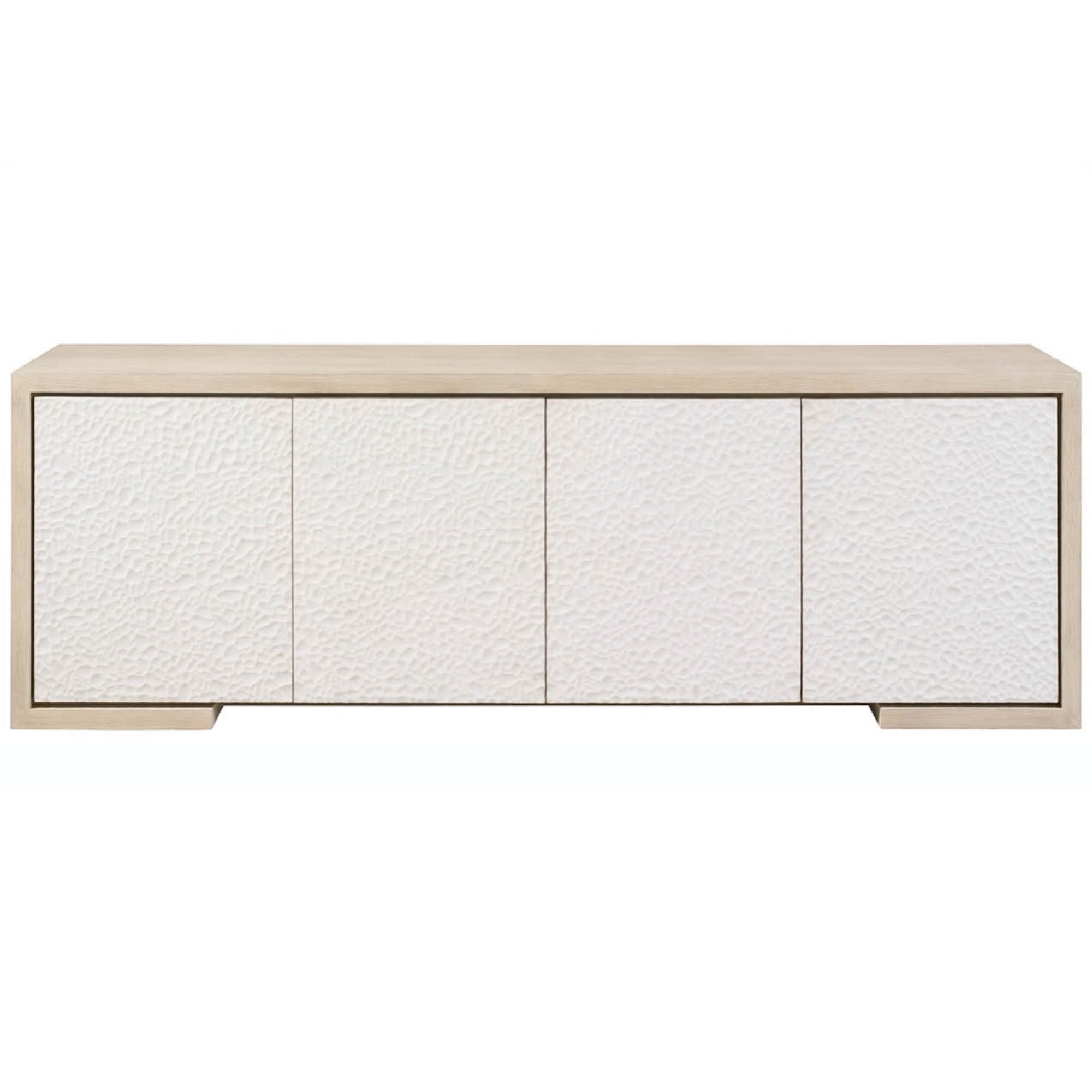 La crédence Aurora présente un élément texturé à couper le souffle avec ses façades de portes en béton sculpté, qui contrastent magnifiquement avec le meuble en chêne brumeux. Cette pièce importante offre un grand espace de rangement tout en mettant en valeur un jeu de matériaux organiques et architecturaux.
