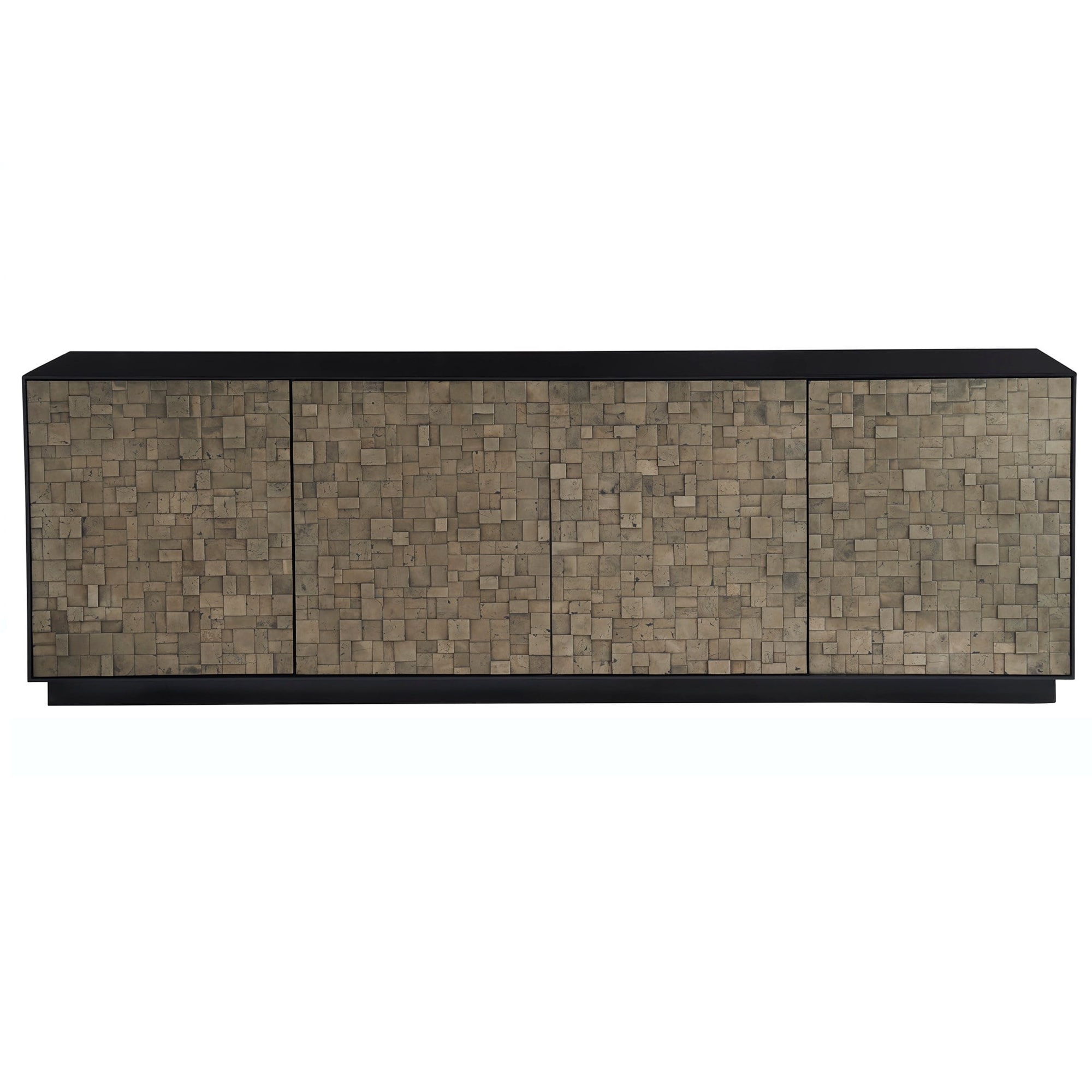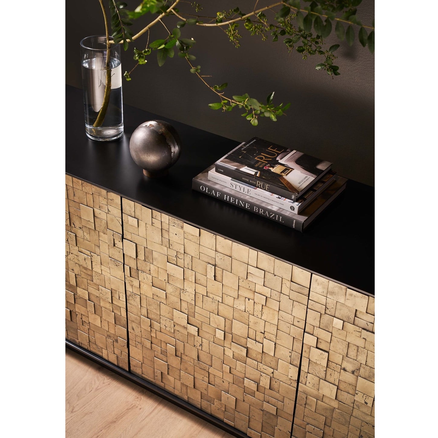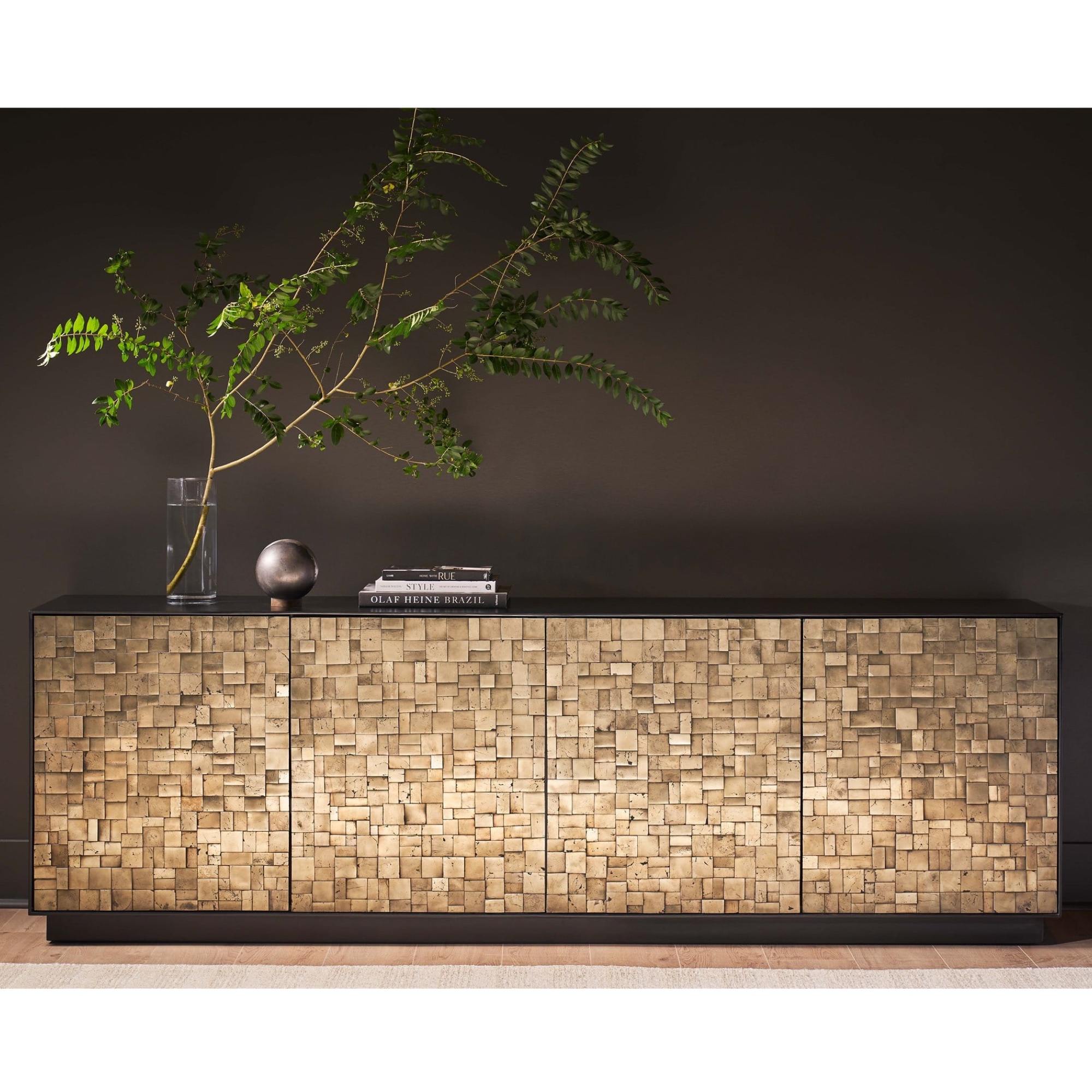 La crédence Cosmo, fabriquée en pyrite et finie en noir mat, présente une façade frappante avec ses quatre portes, rappelant une mosaïque sophistiquée. Cette pièce dégage de l’assurance grâce à ses teintes audacieuses et à sa silhouette définie, ce qui en fait une déclaration d’art et d’élégance dans tous les espaces qu’elle orne.