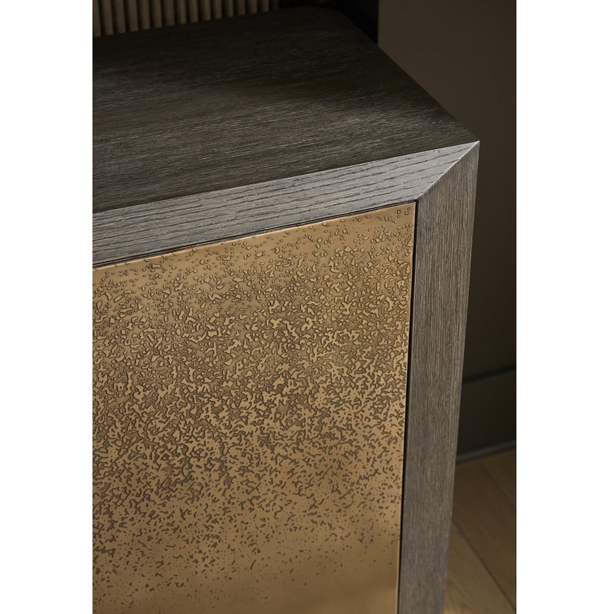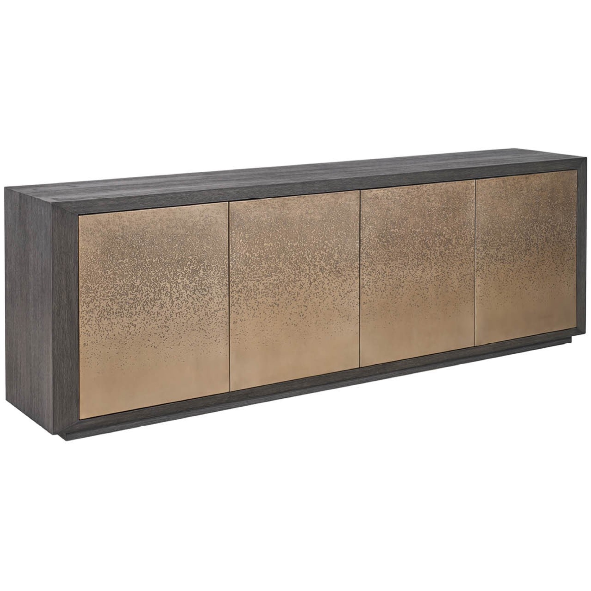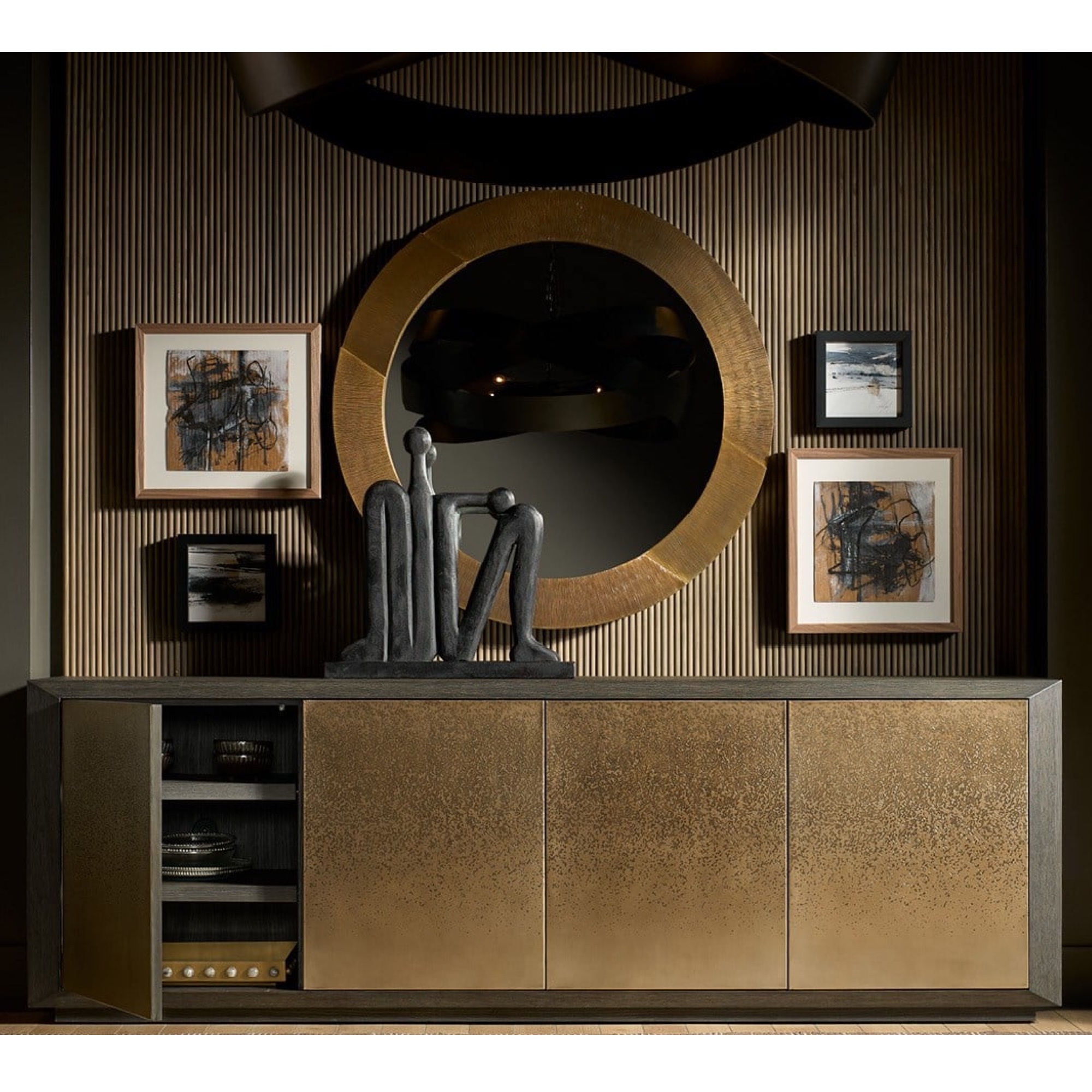 La vaste crédence Nova est définie par ses façades de porte artistiquement gravées à l’acide qui créent un motif linéaire dramatique et continu sur l’ensemble de la caisse. Finie en riche chêne foncé, cette pièce offre un équilibre exceptionnel entre une présence puissante et un rangement élégant pour les médias ou les éléments essentiels de la salle à manger.