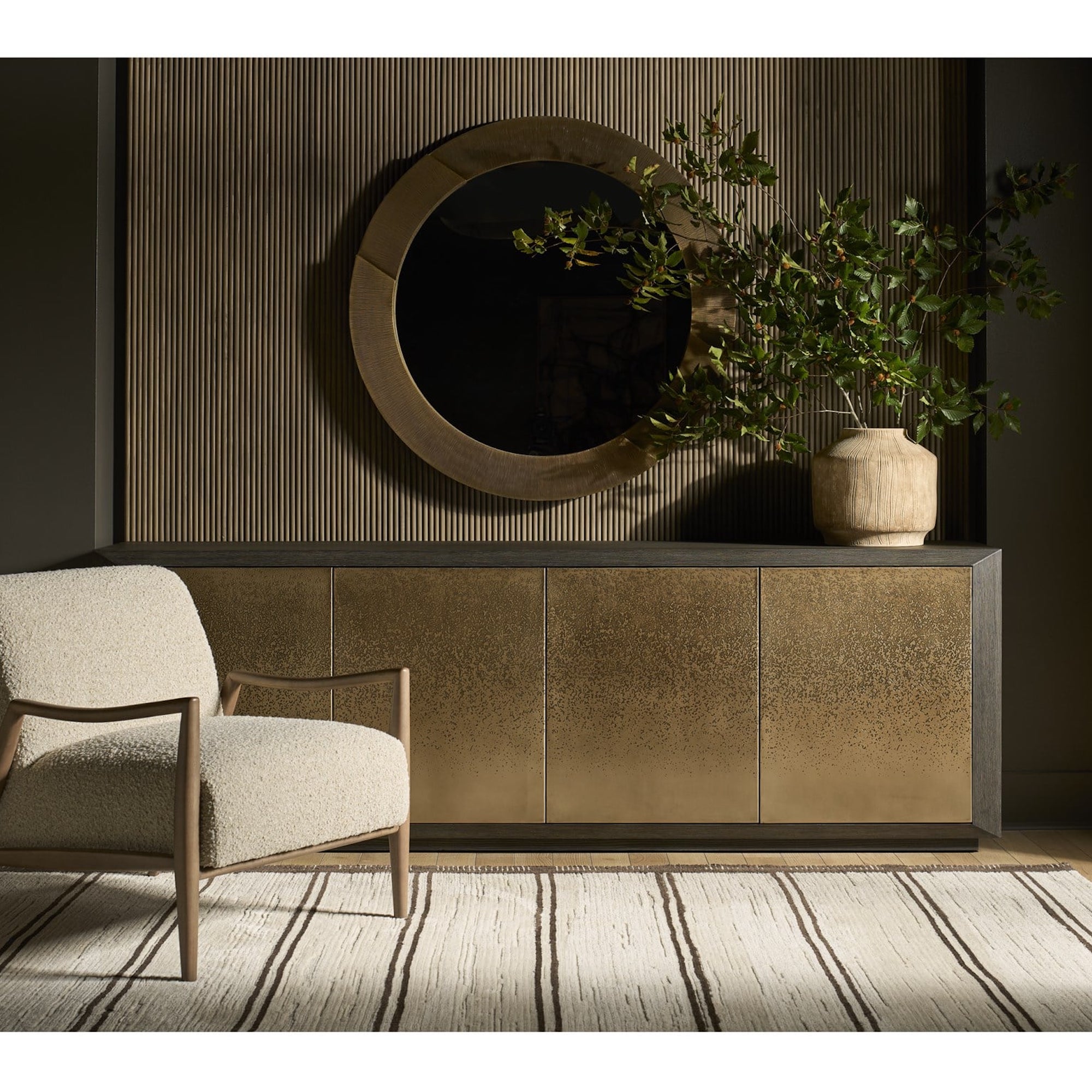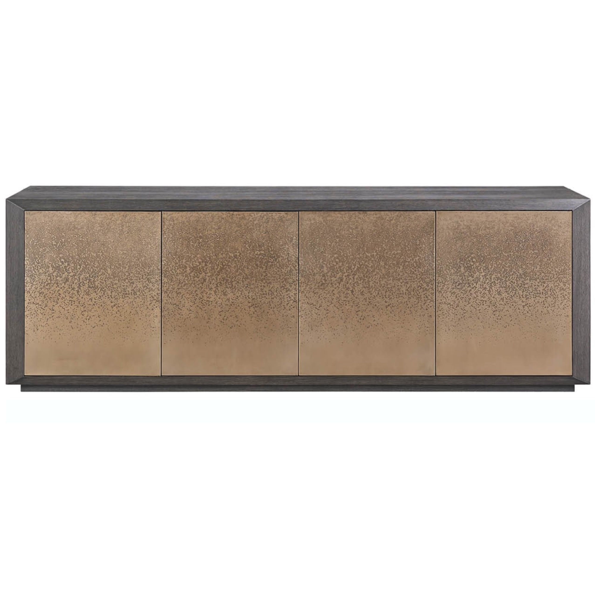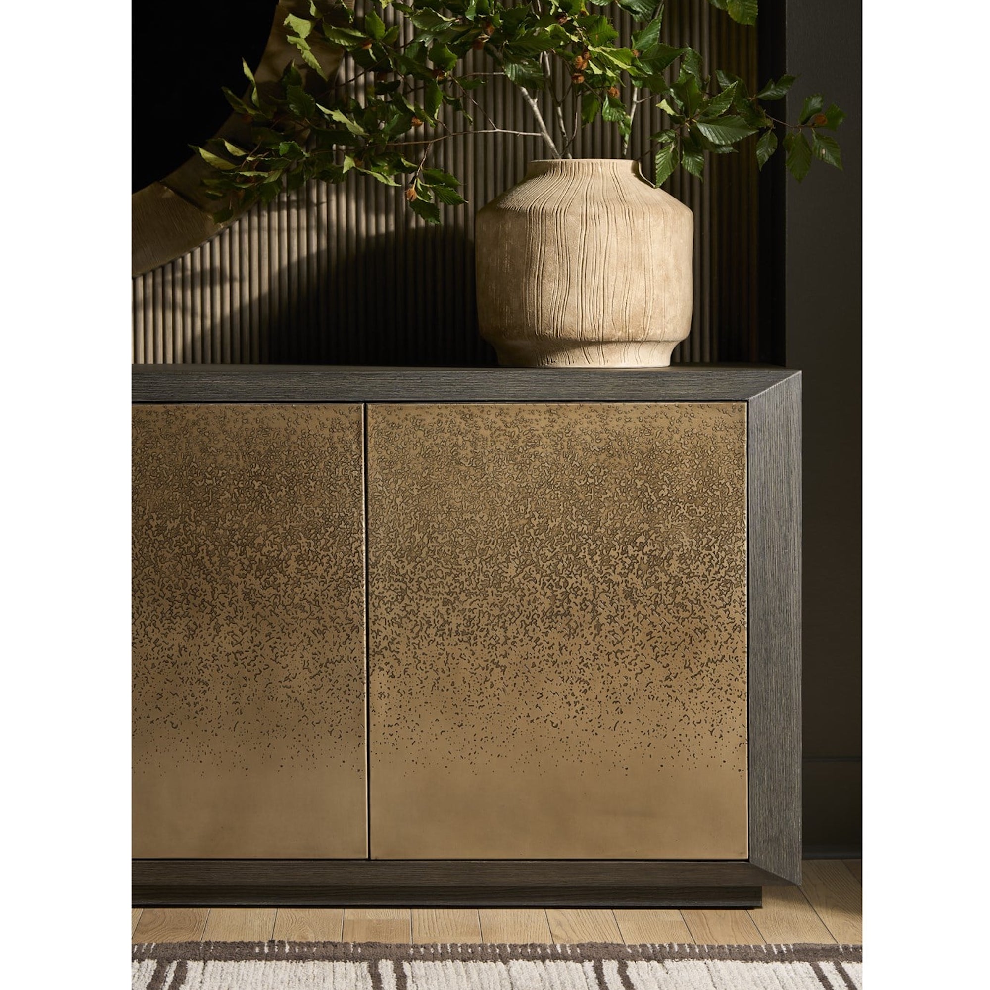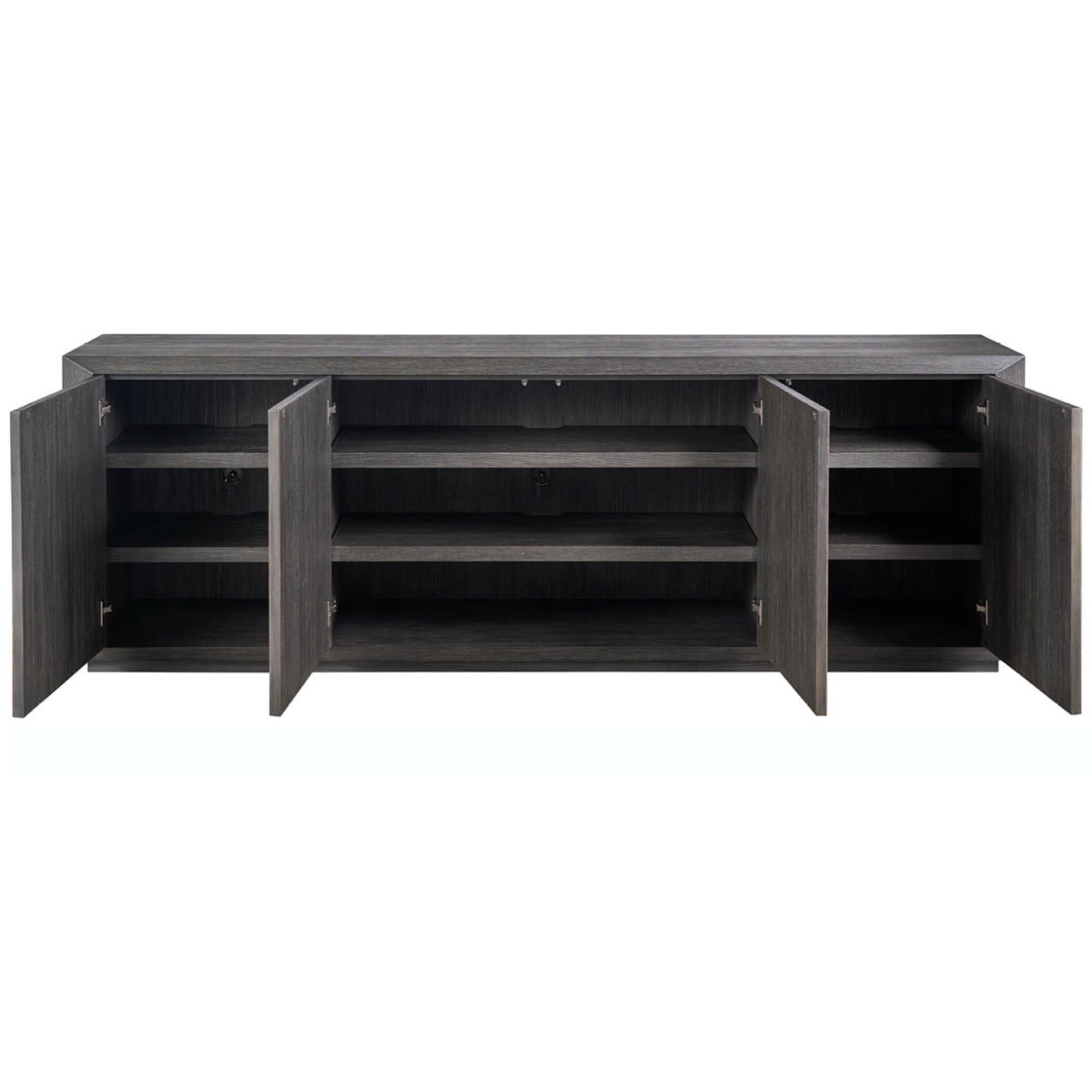 La vaste crédence Nova est définie par ses façades de porte artistiquement gravées à l’acide qui créent un motif linéaire dramatique et continu sur l’ensemble de la caisse. Finie en riche chêne foncé, cette pièce offre un équilibre exceptionnel entre une présence puissante et un rangement élégant pour les médias ou les éléments essentiels de la salle à manger.