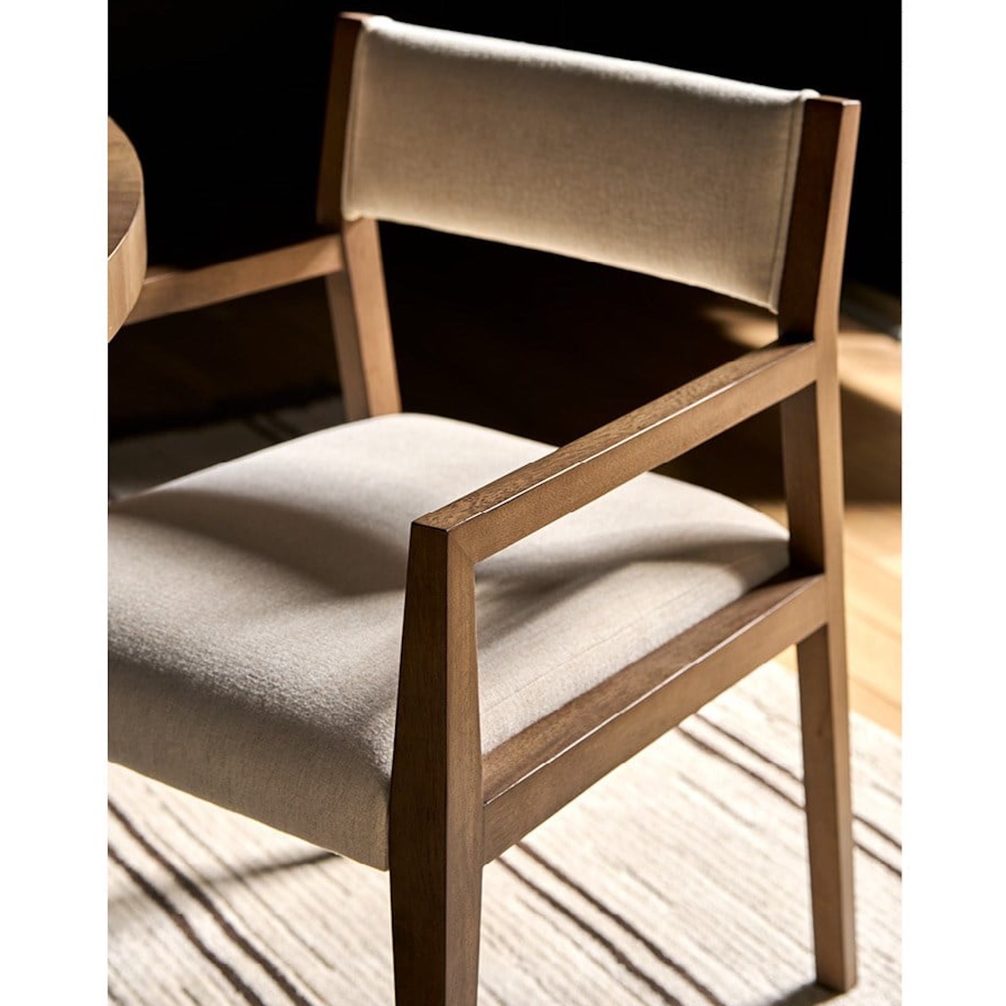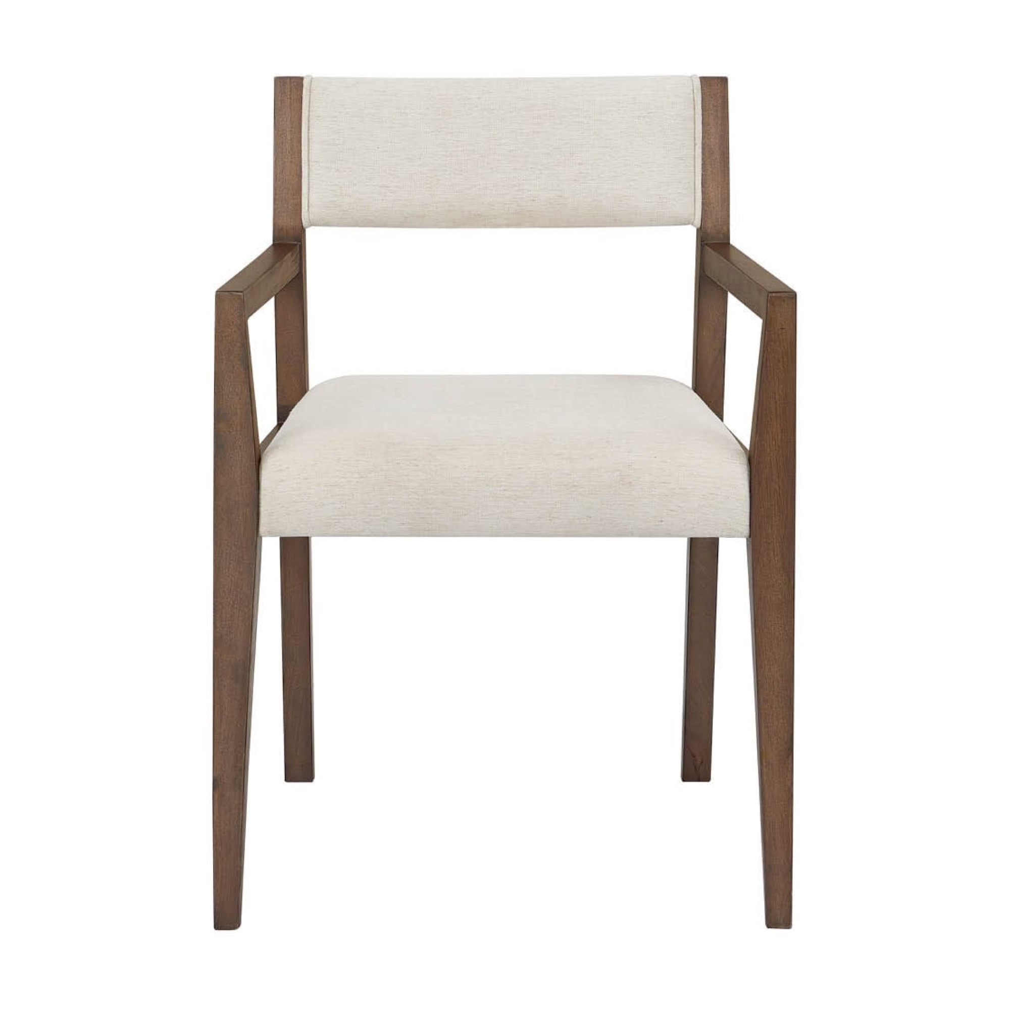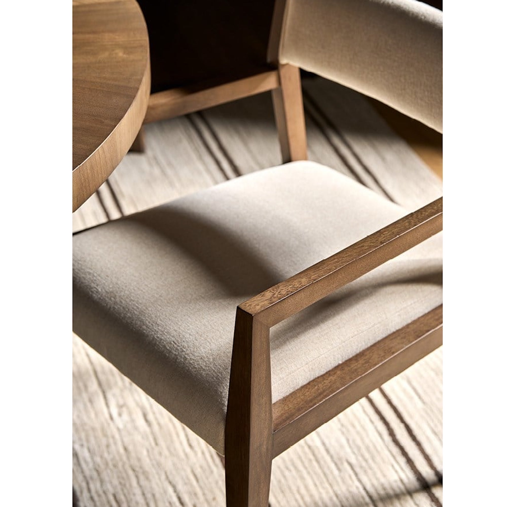 La chaise à accoudoir Haze est une élégante chaise de salle à manger à structure en bois, en noyer Haze, avec une assise confortablement rembourrée en tissu Levi Oyster. Ses lignes simples et architecturales et sa finition élégante font de la chaise Haze un complément raffiné à toute table de salle à manger.