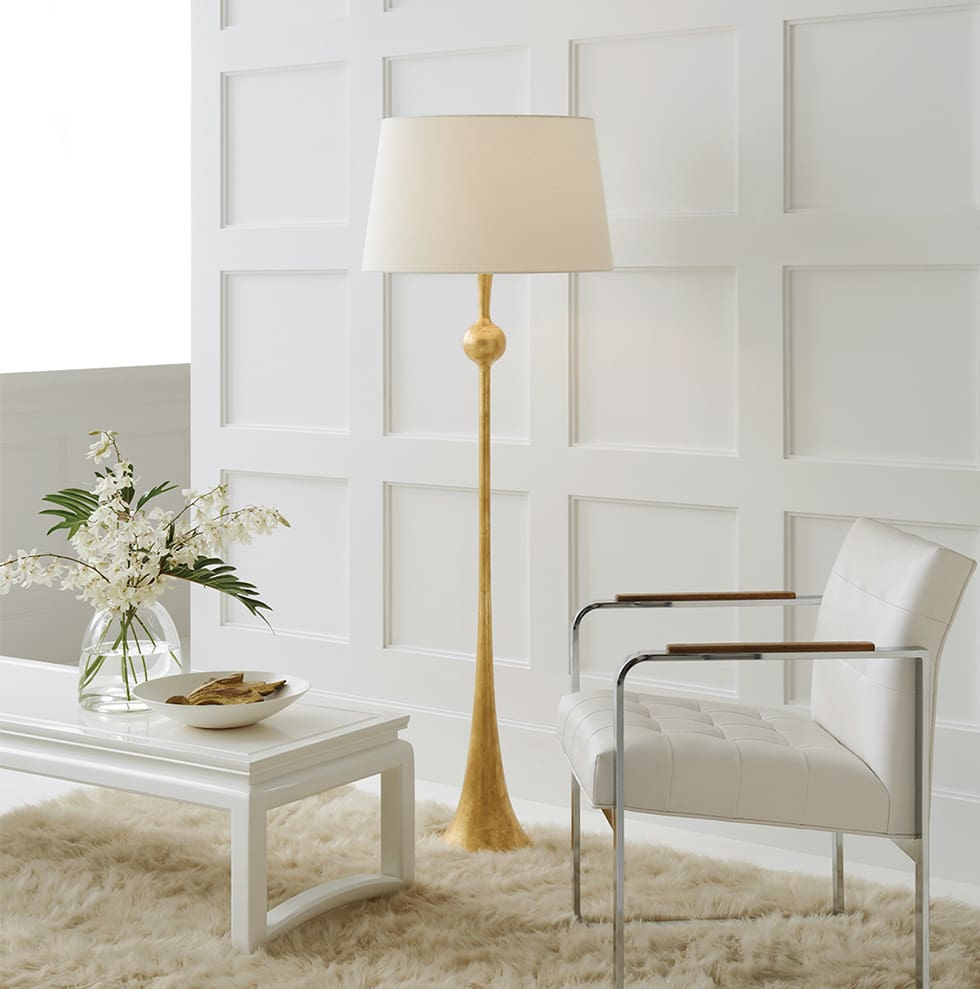 L’élégant Dover d’AERIN recadre les designs intemporels avec des formes classiques mais inattendues. Une silhouette en trompette pour les lampes de table et les appliques confère un raffinement unique à une variété d’espaces et est proposée dans une gamme de finitions telles que le fer doré, vieilli ou la feuille d’argent brunie, le tout surmonté d’un élégant abat-jour en lin.