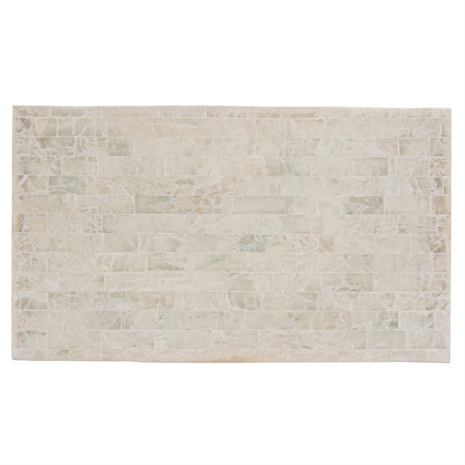 Simple et élégante, la table basse Levine se distingue par sa luminosité et sa forme architecturale épurée. Les placages de gypse albâtre sont méticuleusement collés à la main selon un motif de carreaux, ce qui donne une douce brillance ivoire. Chaque côté de la table repose sur un socle en acier avec une finition étain.