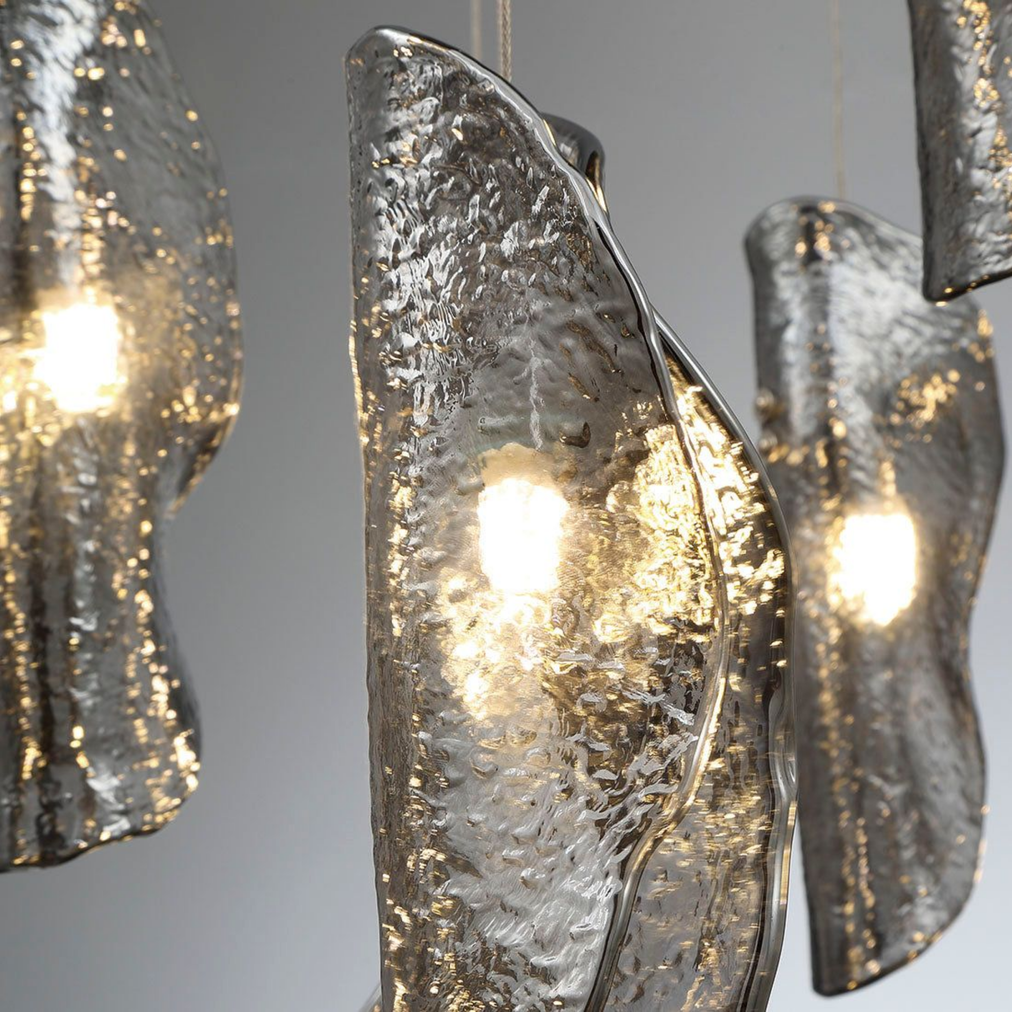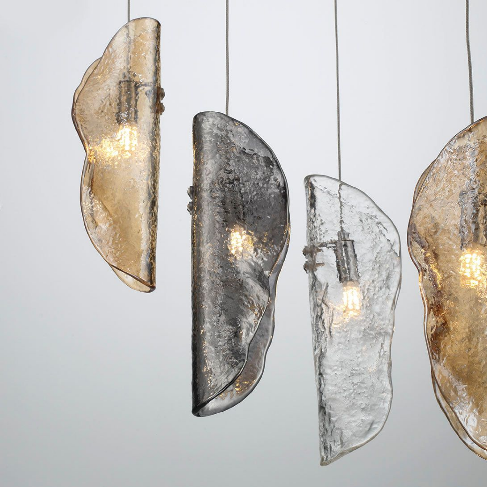 Le verre Piastra est soigneusement sculpté dans des options de verre clair, ambré et fumé ; en outre, des feuilles de métal forgées à la main donnent un effet de cascade hypnotique à n’importe quel espace.