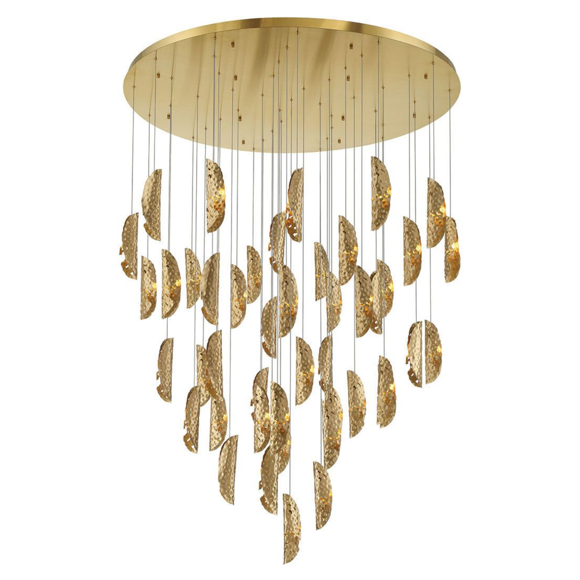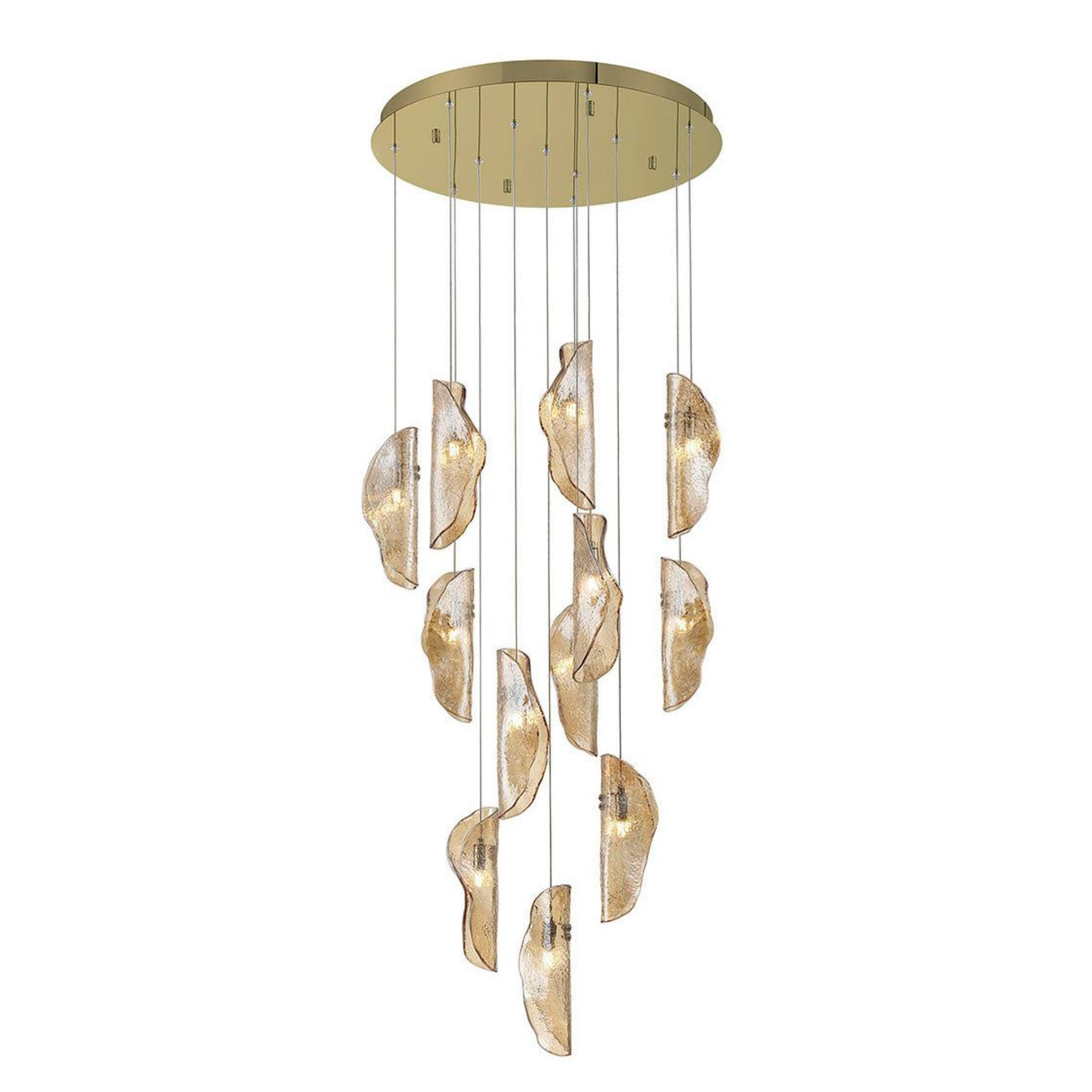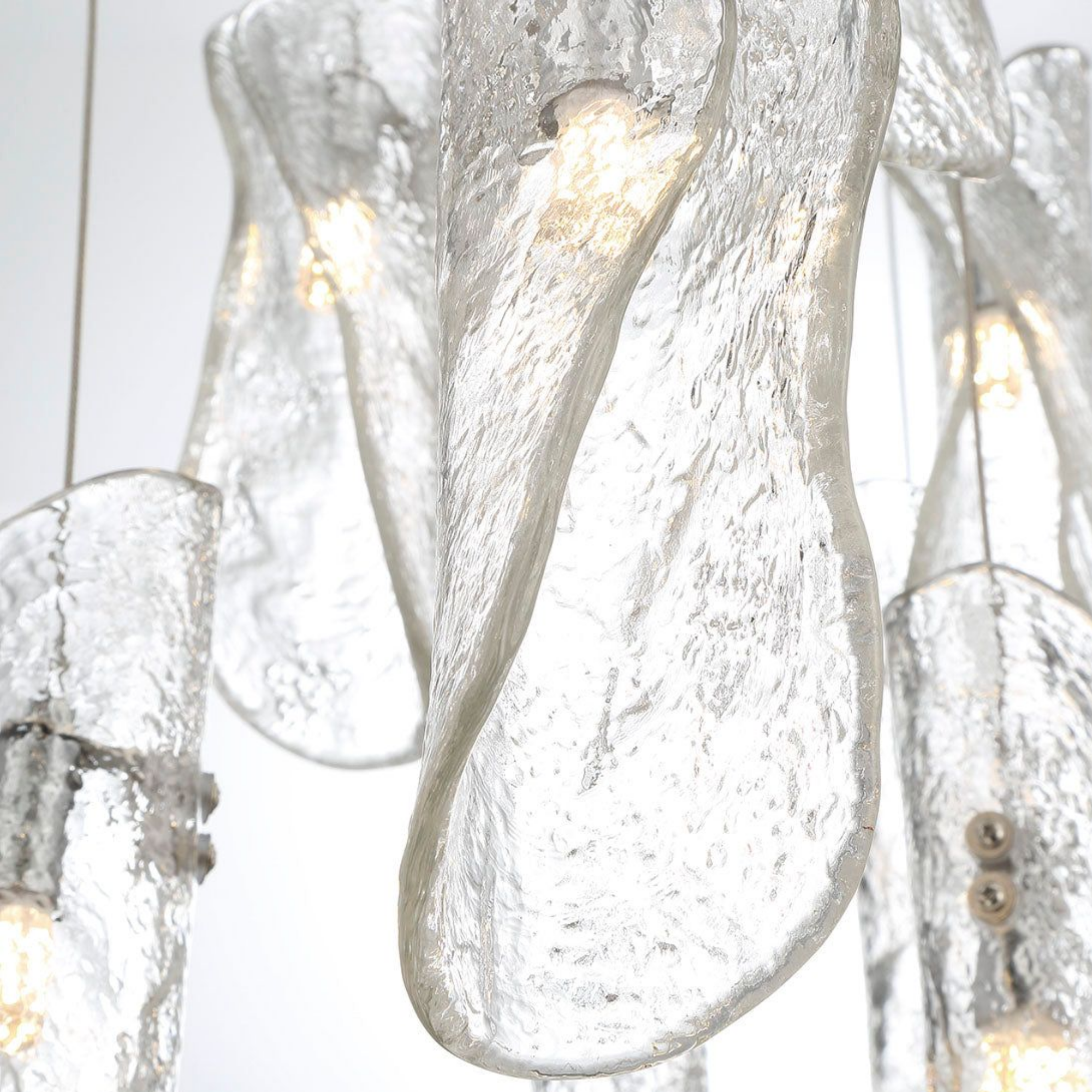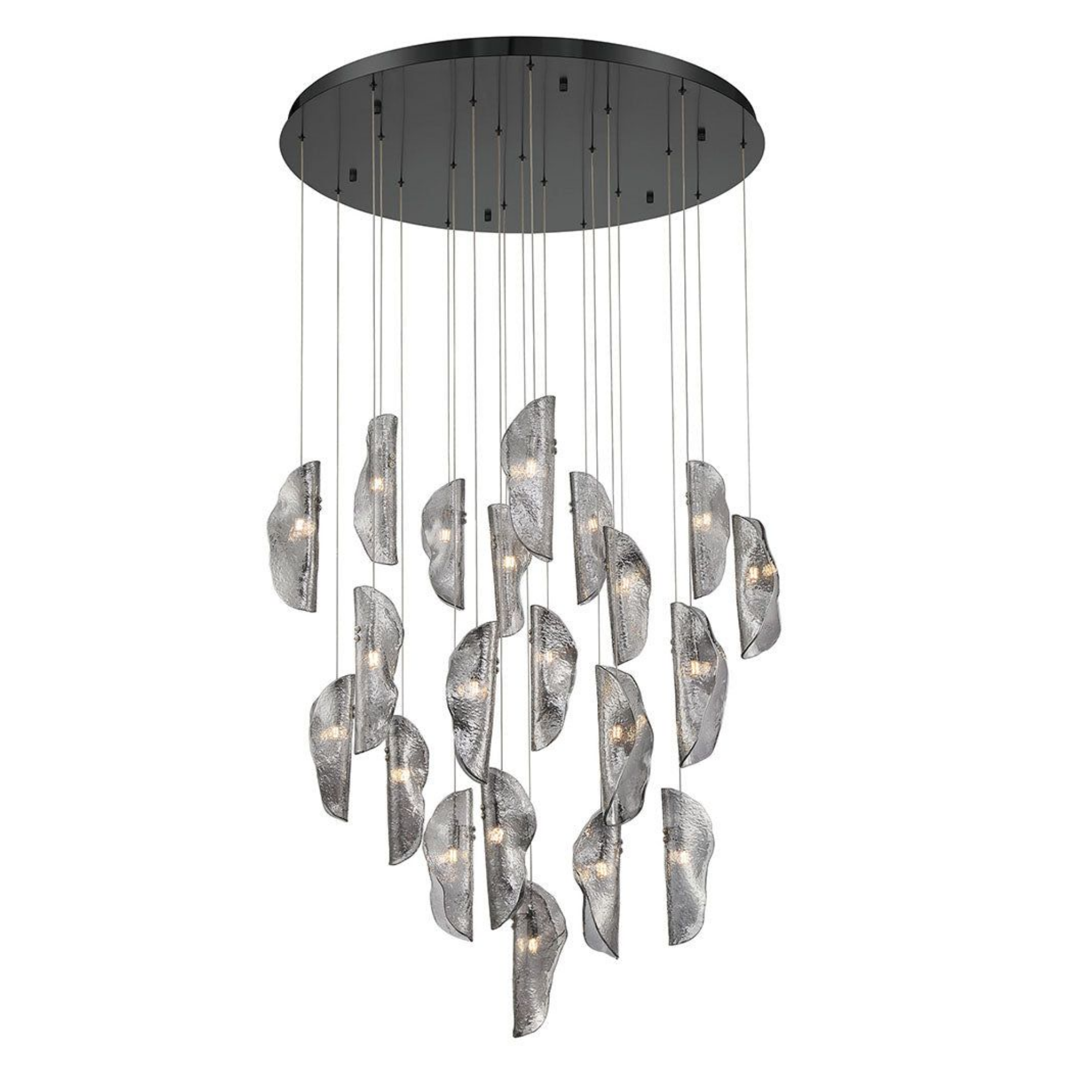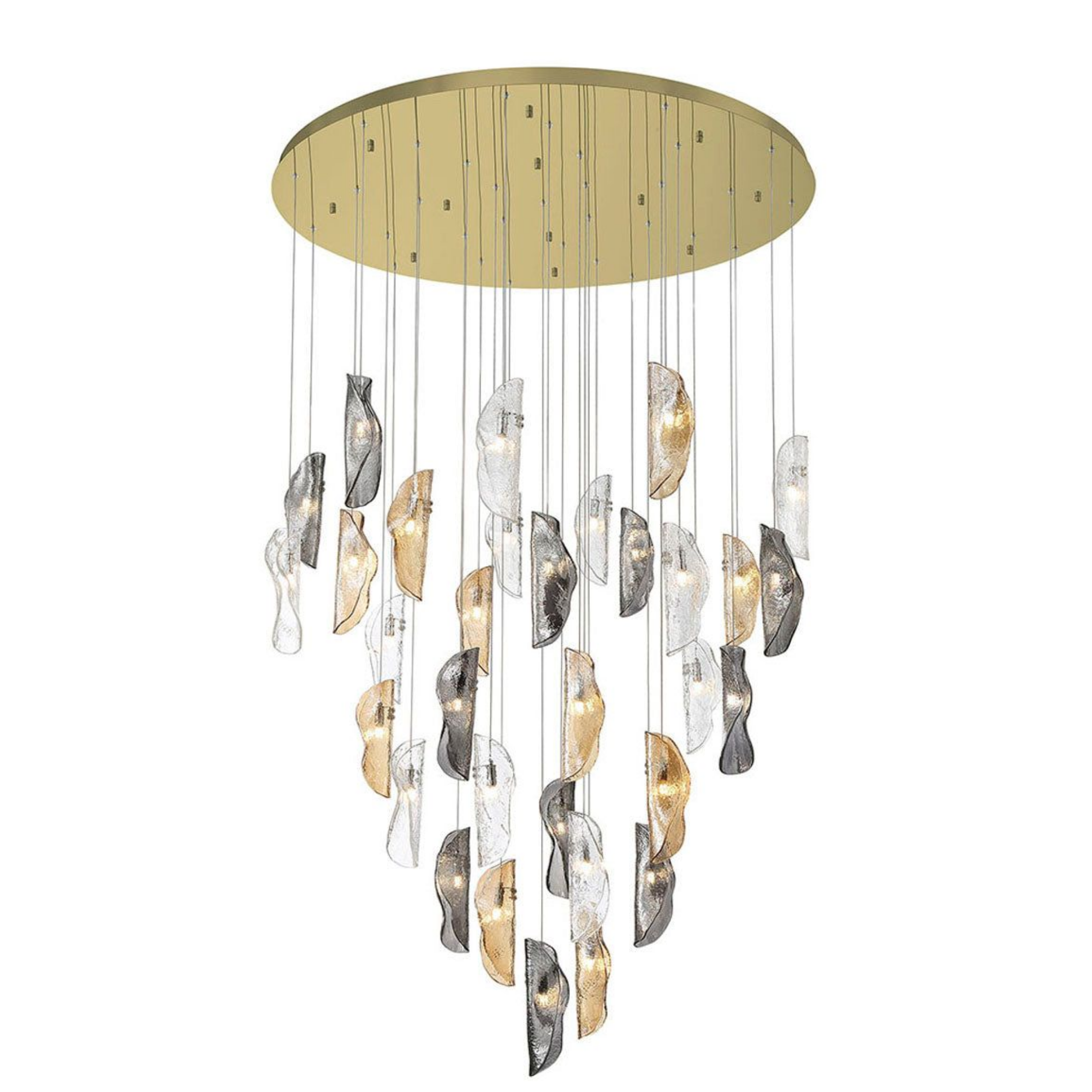 Le verre Piastra est soigneusement sculpté dans des options de verre clair, ambré et fumé ; en outre, des feuilles de métal forgées à la main donnent un effet de cascade hypnotique à n’importe quel espace.