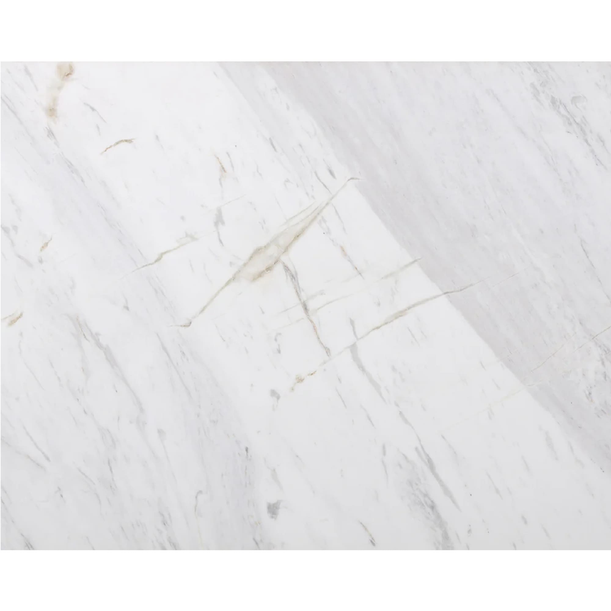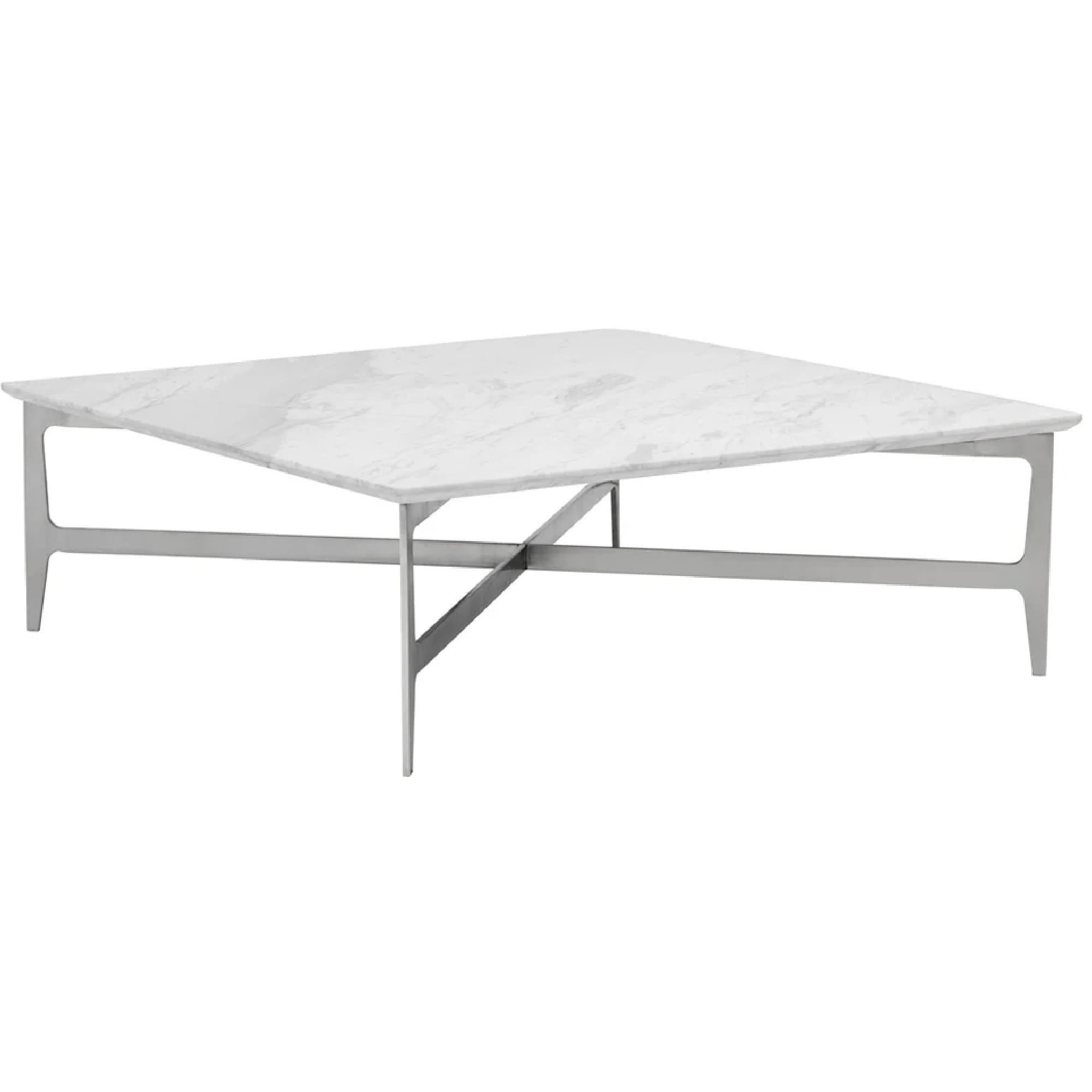 Cette table à café est dotée d’une base en acier inoxydable brossé et d’un dessus en marbre blanc avec un bord biseauté.