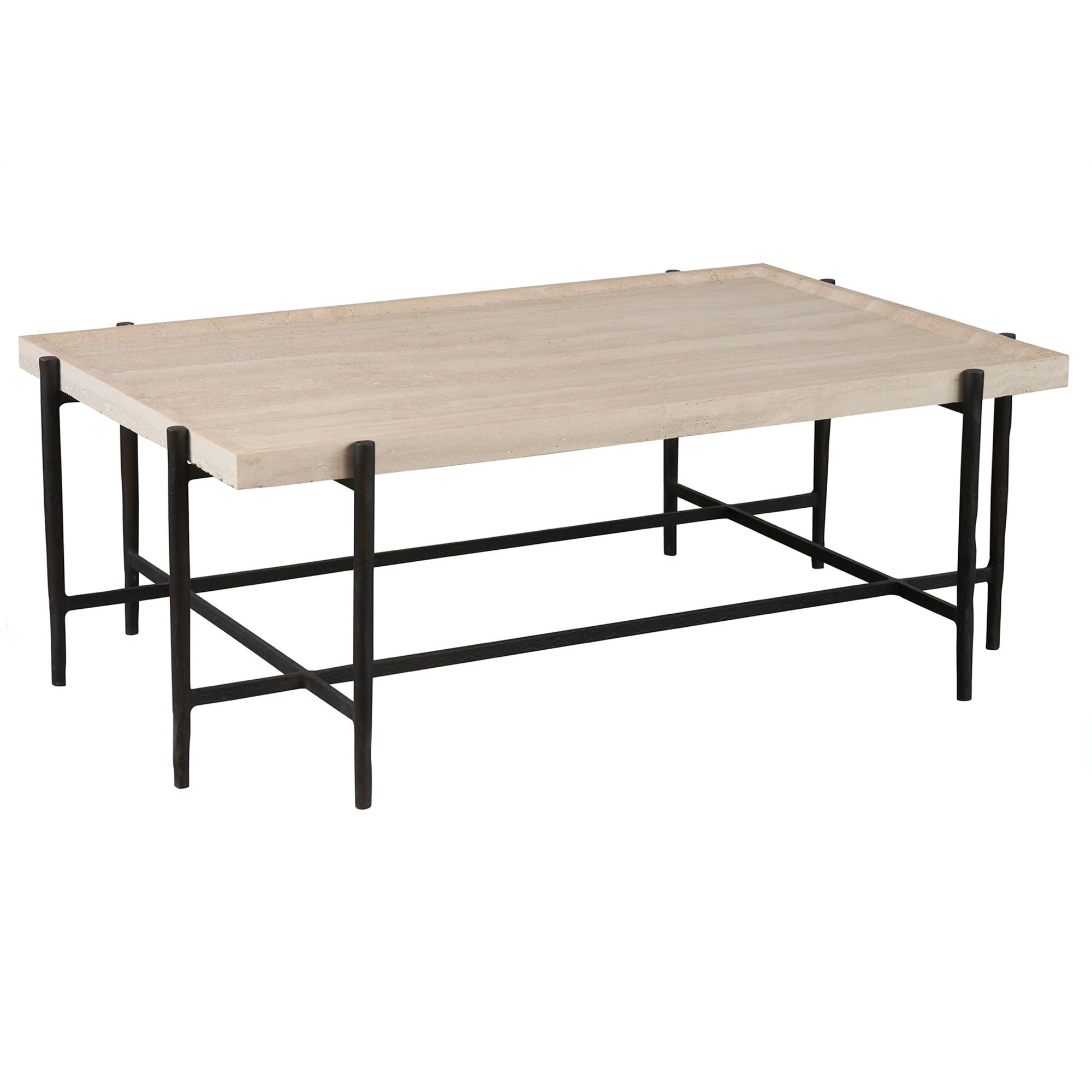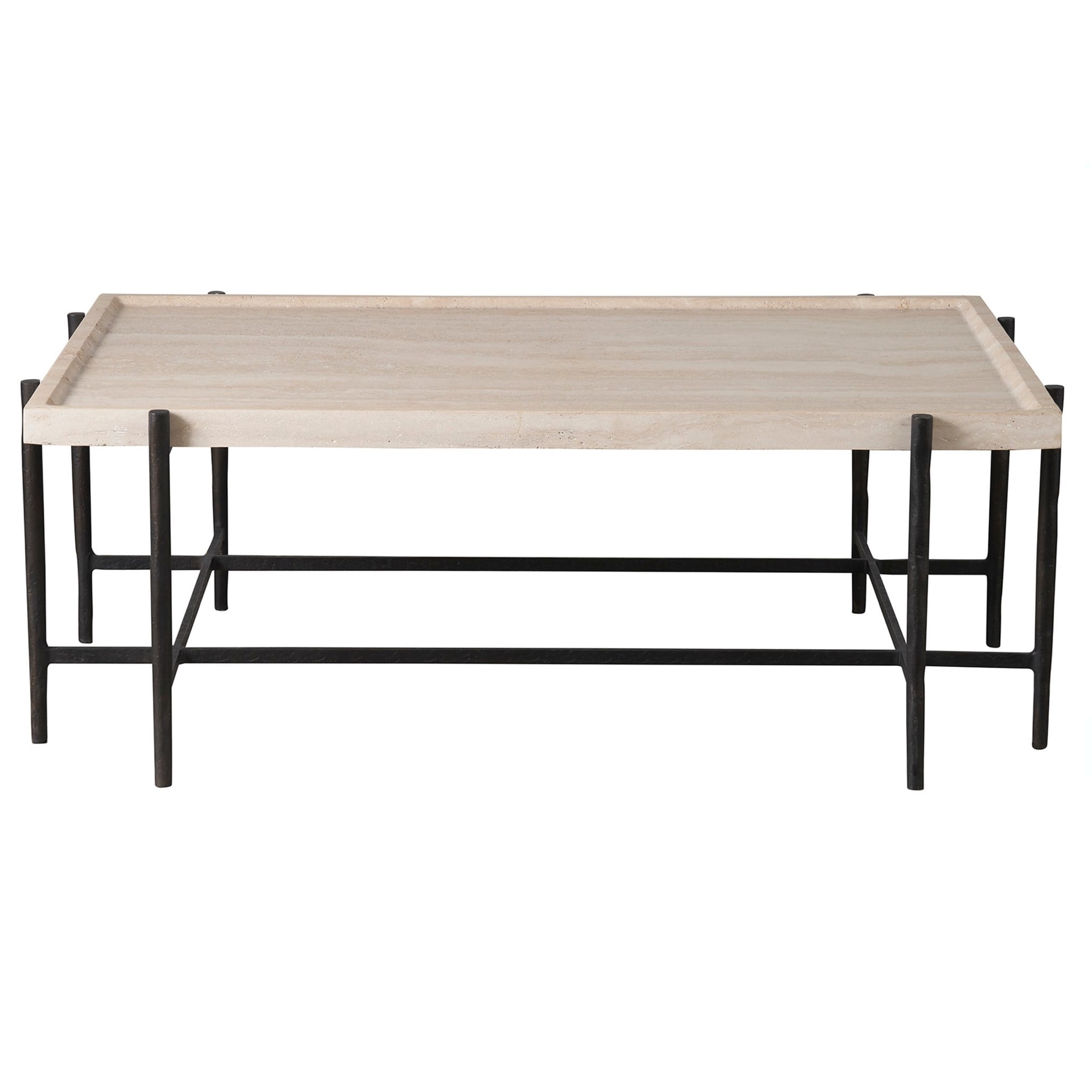 La table à cocktail Theron juxtapose avec art la lumière et l’obscurité, avec un plateau rectangulaire en travertin clair et serein qui contraste gracieusement avec une base en métal bronze aux lignes épurées. Cet ensemble moderne séduit par son design visuellement attrayant, alliant la simplicité à un jeu de teintes saisissant, pour une pièce maîtresse convaincante dans tout espace contemporain.