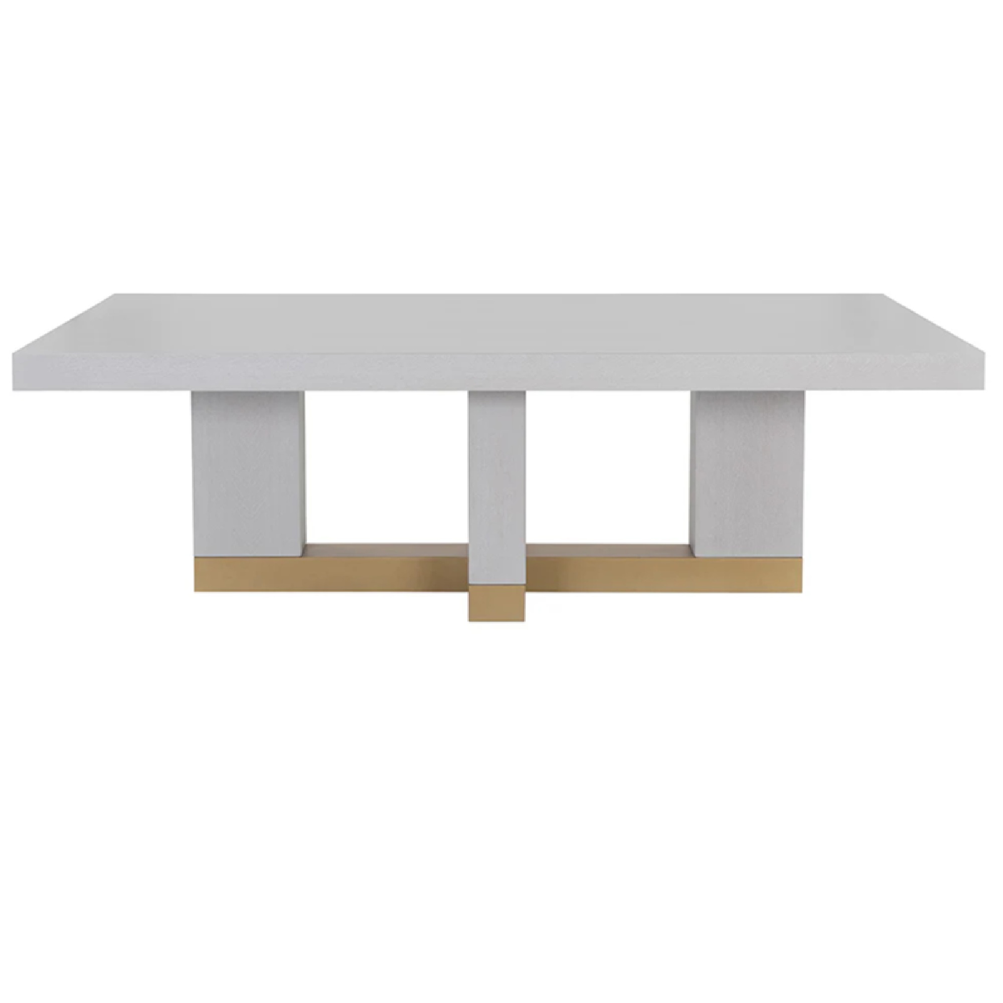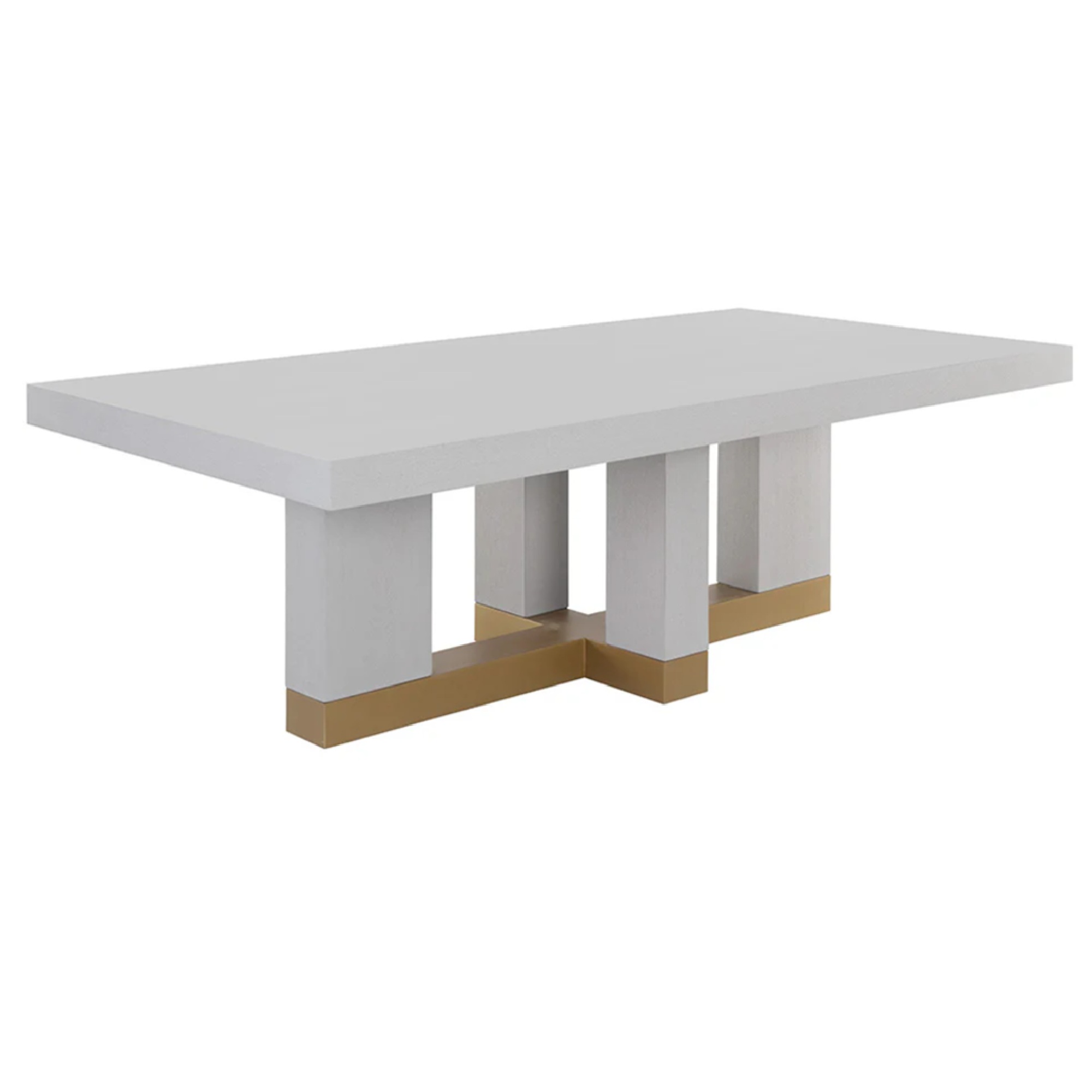 Plateau de table en placage de bois gris Gaunlet, pieds en peuplier massif et base métallique en bronze rustique.