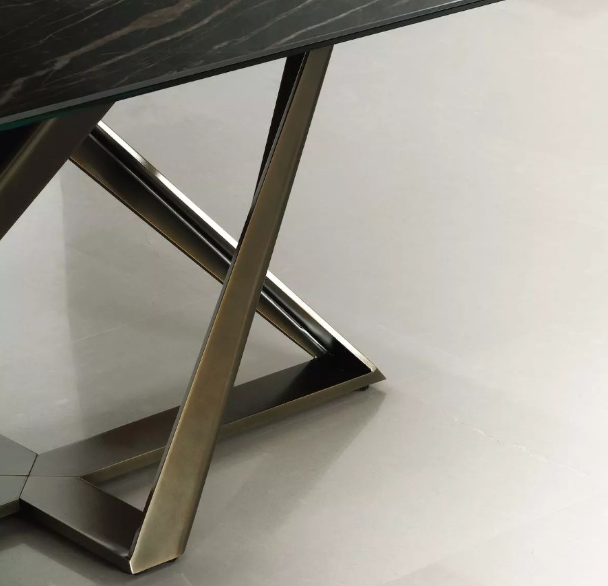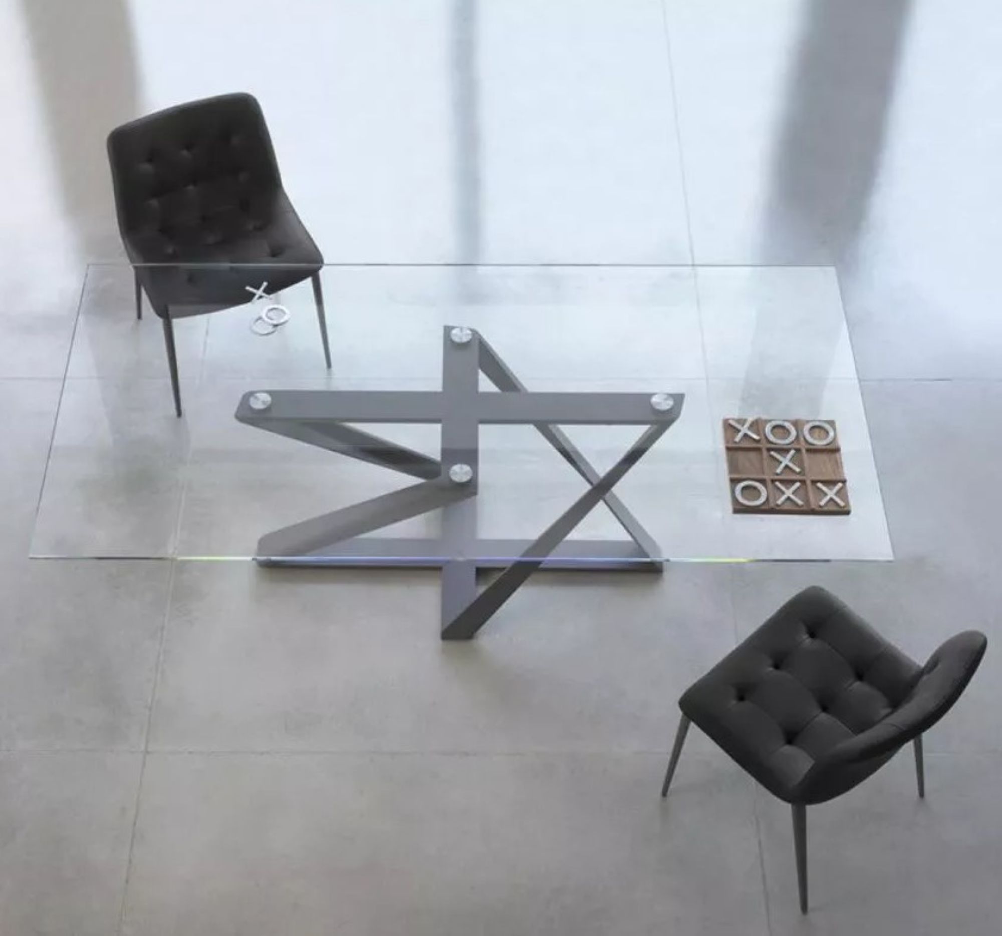 Base en métal avec plateau en bois plaqué, bois massif, verre brillant, verre laqué velouté mat anti-rayures SuperMarble ou SuperCeramic.