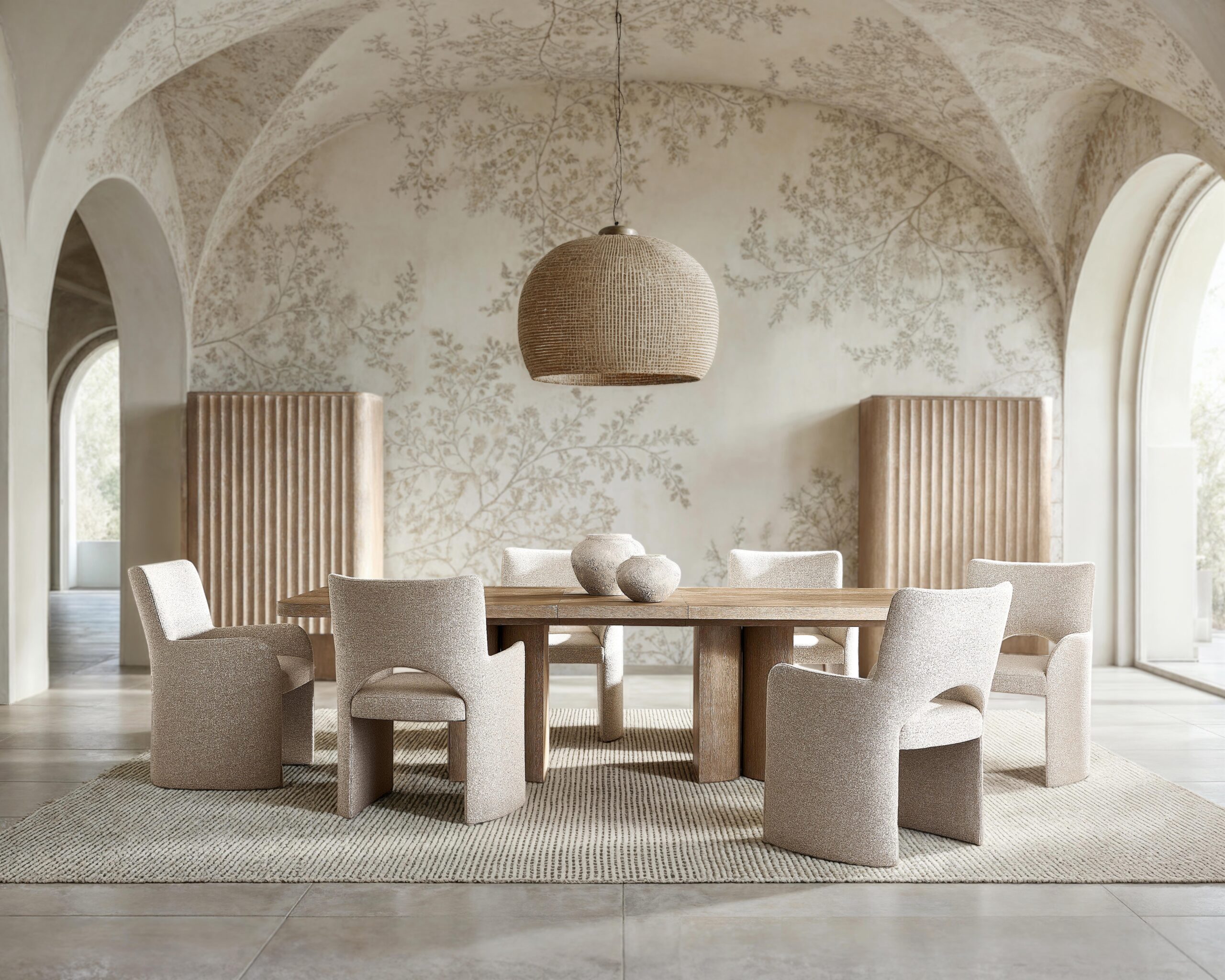 La table de salle à manger Loggia place les côtés incurvés des pilastres architecturaux l’un à côté de l’autre pour former une base unique. Ils équilibrent un plateau rectangulaire aux coins arrondis pour un profil moderne. Le bois magnifiquement texturé est fini en Aria.