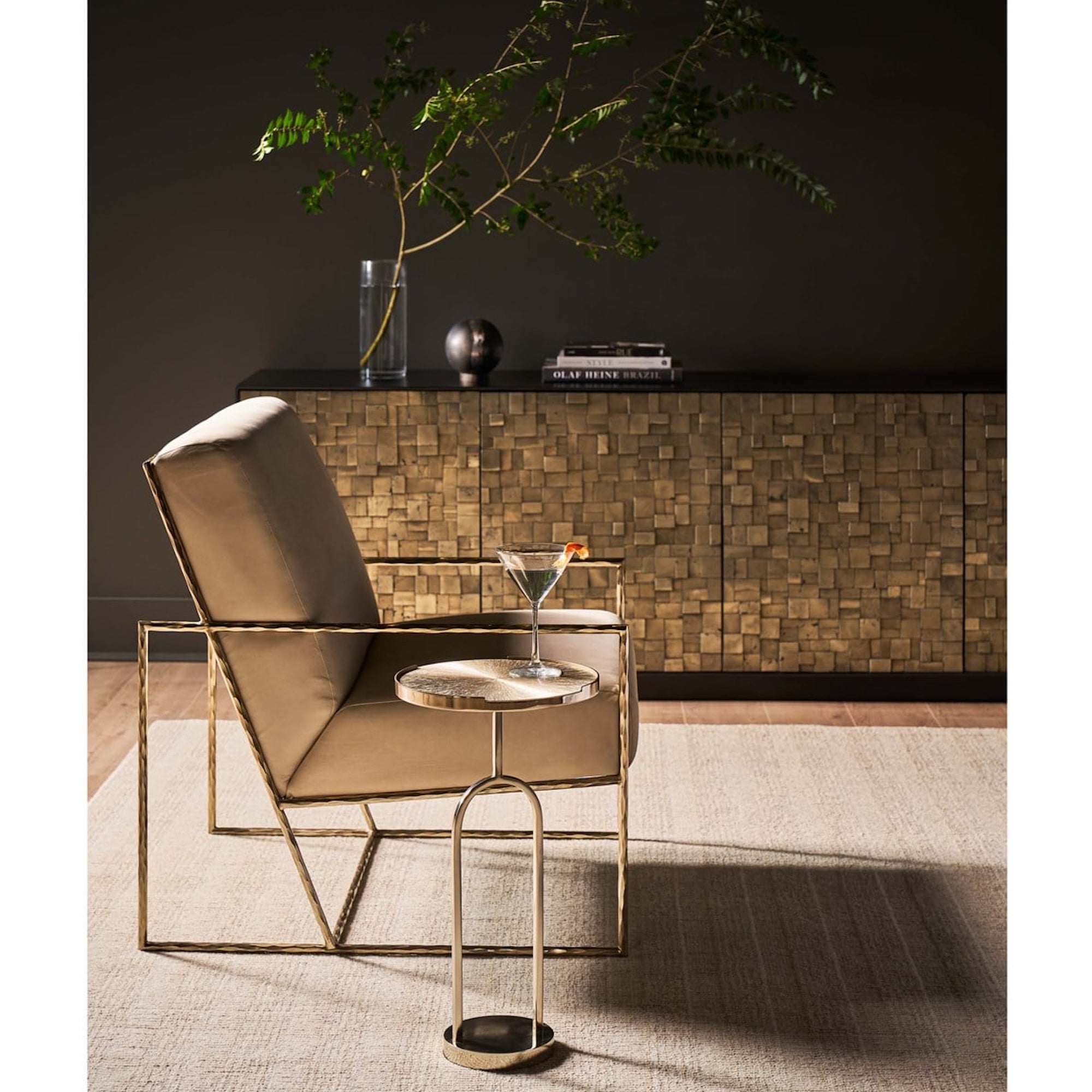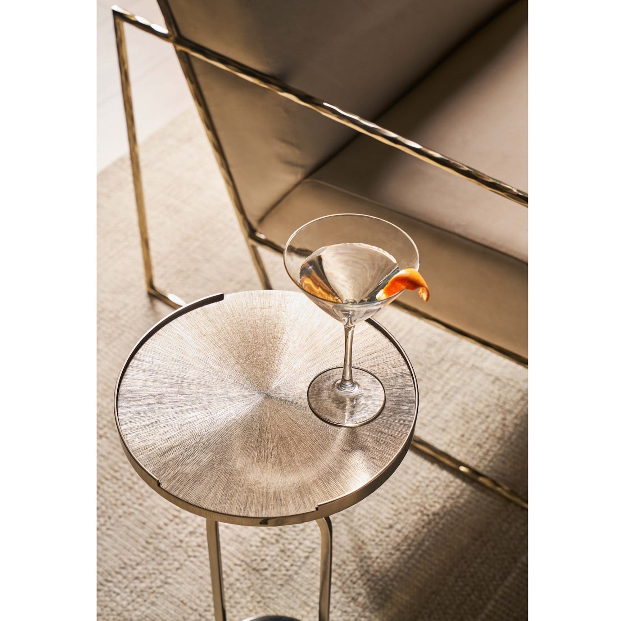 La table à martini Fawn exsude le glamour et le luxe avec sa finition métallique lustrée Champagne Gold. Dotée d’un plateau rond succinct posé élégamment sur une base mince et courbée, cette table apporte un éclat radieux et un flair sophistiqué à n’importe quel décor, incarnant l’essence du charme haut de gamme.