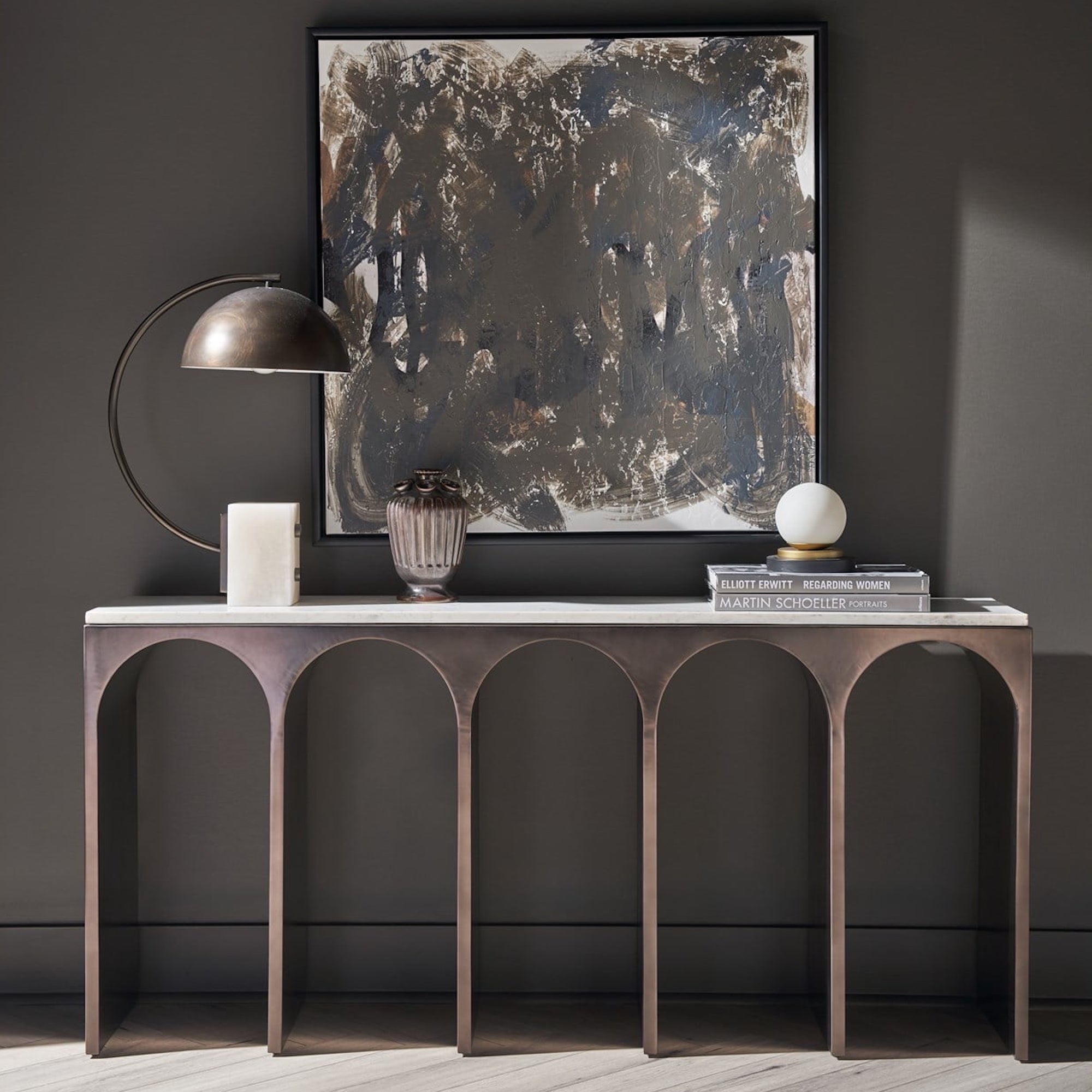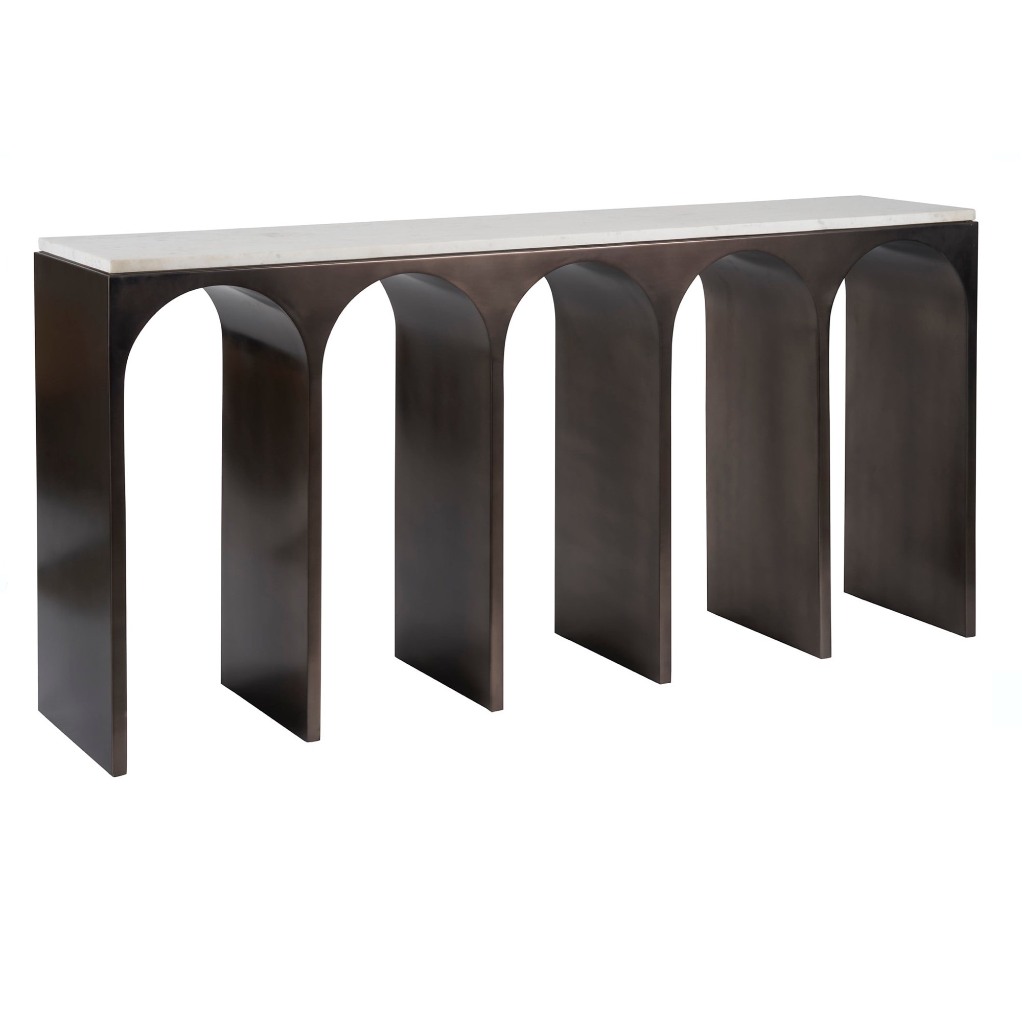 La table console Moda est à l’avant-garde du design moderne, associant un élégant plateau en Banswara blanc à un corps en étain satiné vieilli. Son design se caractérise par des courbes exagérées, des pieds fins et un jeu astucieux d’espaces négatifs et positifs, créant ainsi une pièce aussi attrayante visuellement qu’élégamment fonctionnelle. Cette table incarne la sophistication contemporaine, parfaite pour rehausser un intérieur avant-gardiste.