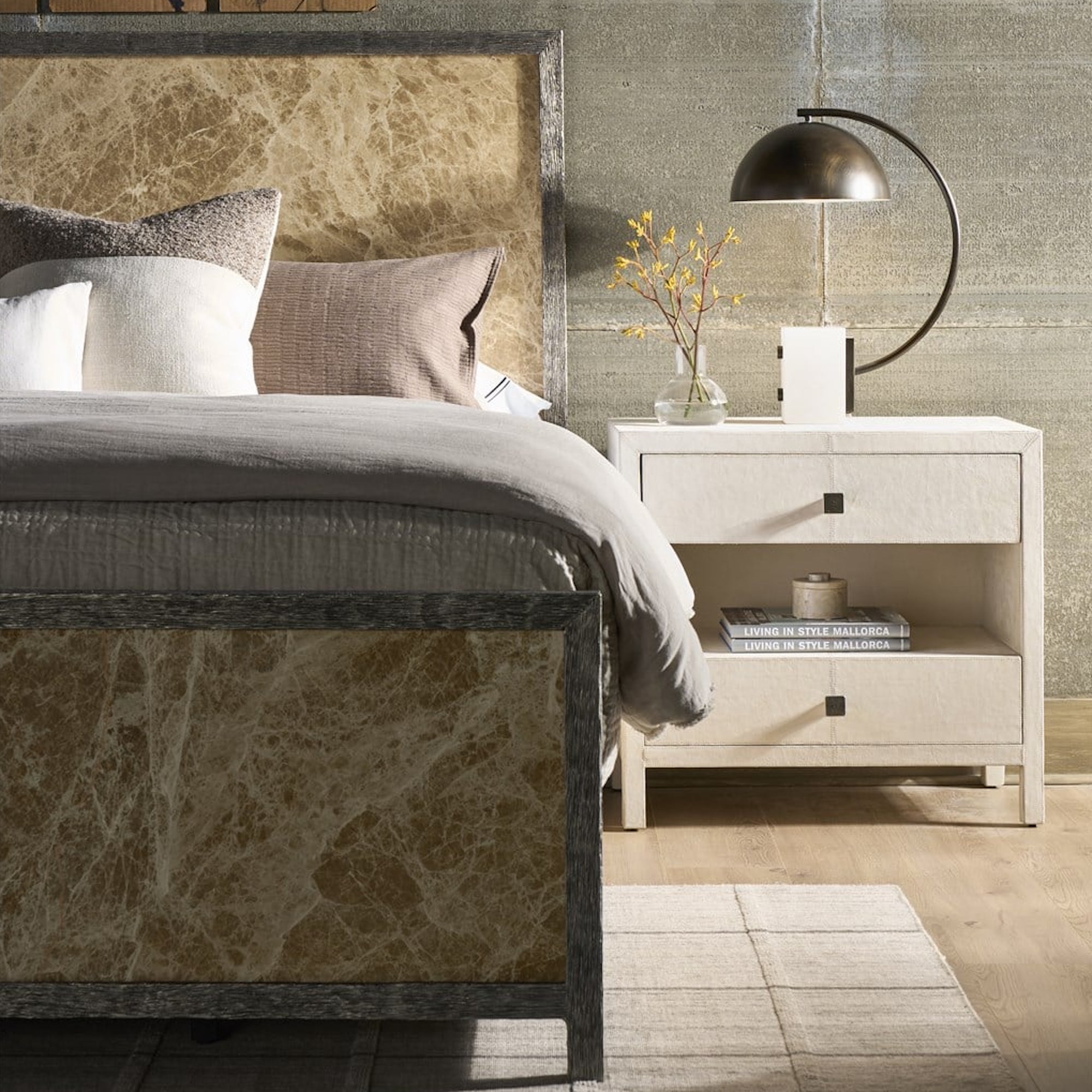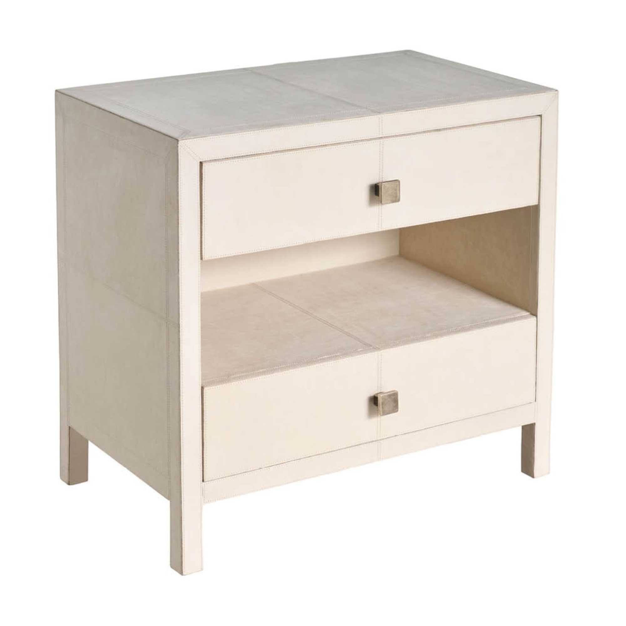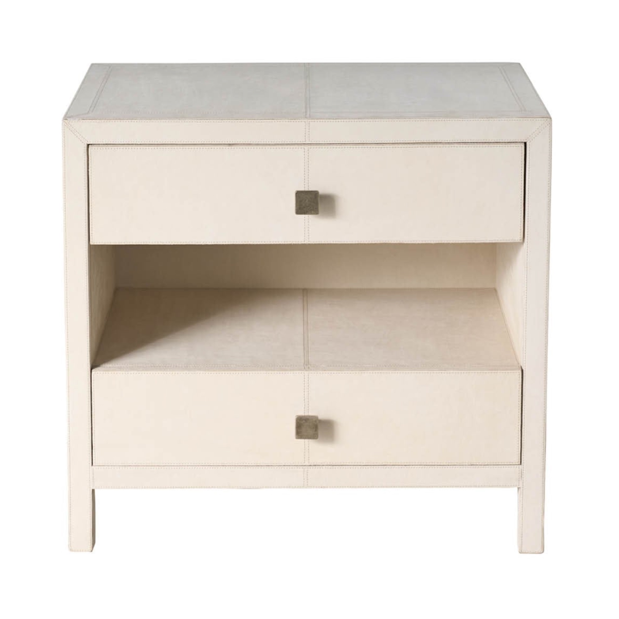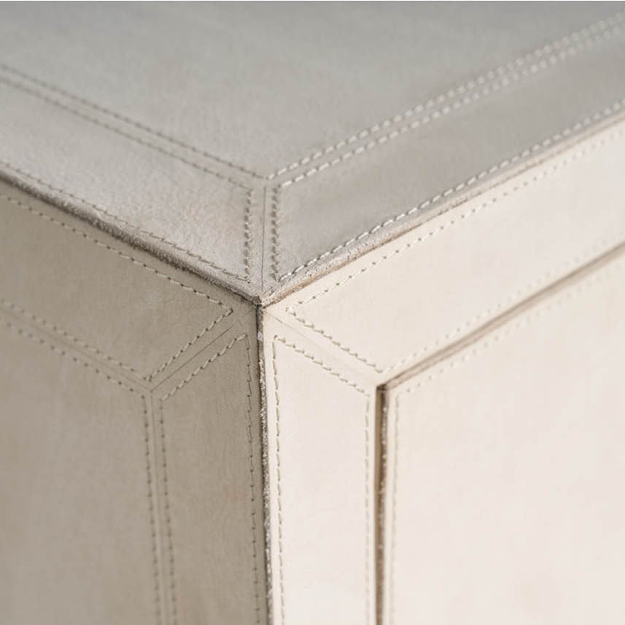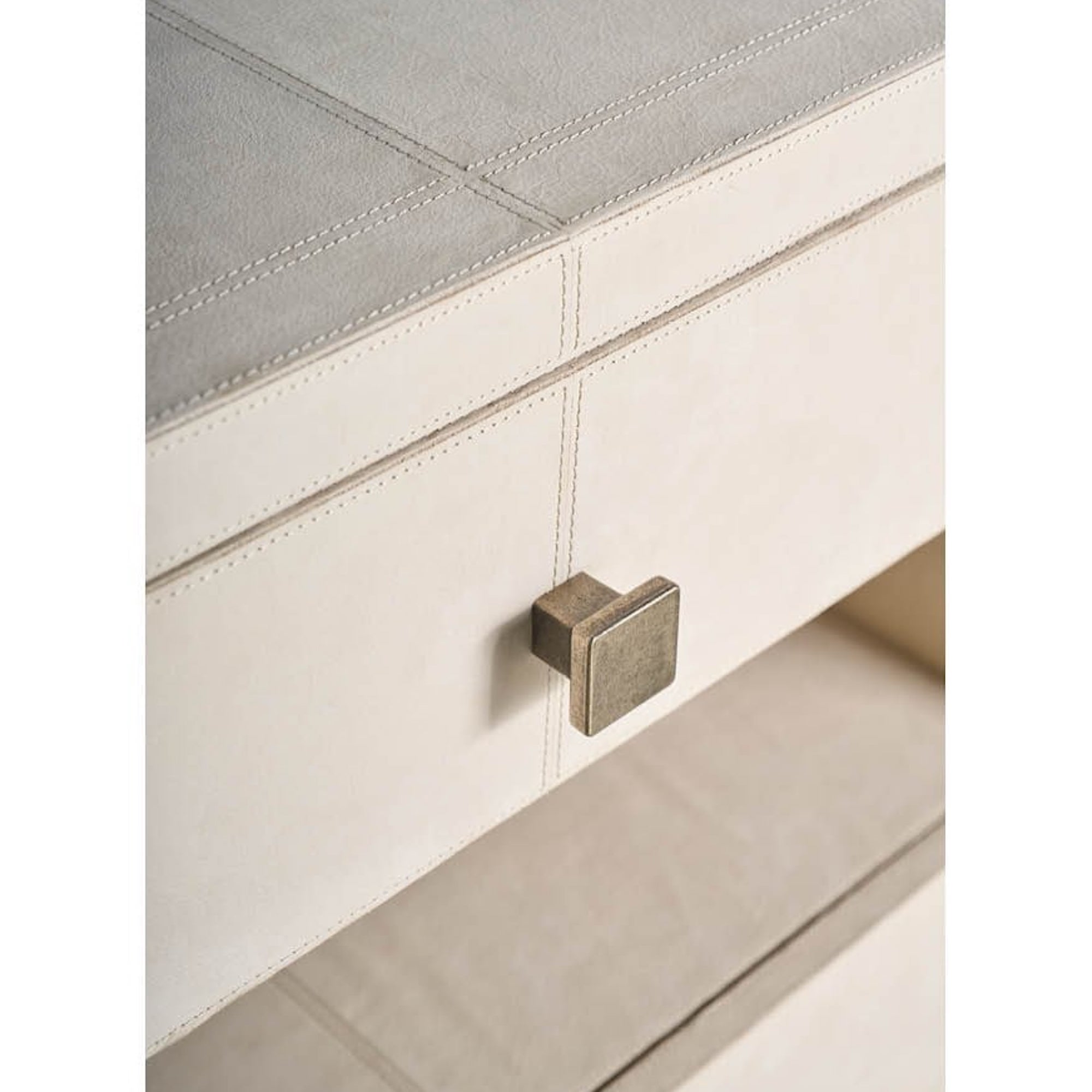 La table de nuit Lira est un meuble de chevet à deux tiroirs qui atteint le luxe dimensionnel en étant entièrement enveloppé de cuir Universal Grey. Le tiroir supérieur est revêtu de micro-suède, ce qui souligne l’engagement de la pièce à offrir un rangement sophistiqué.