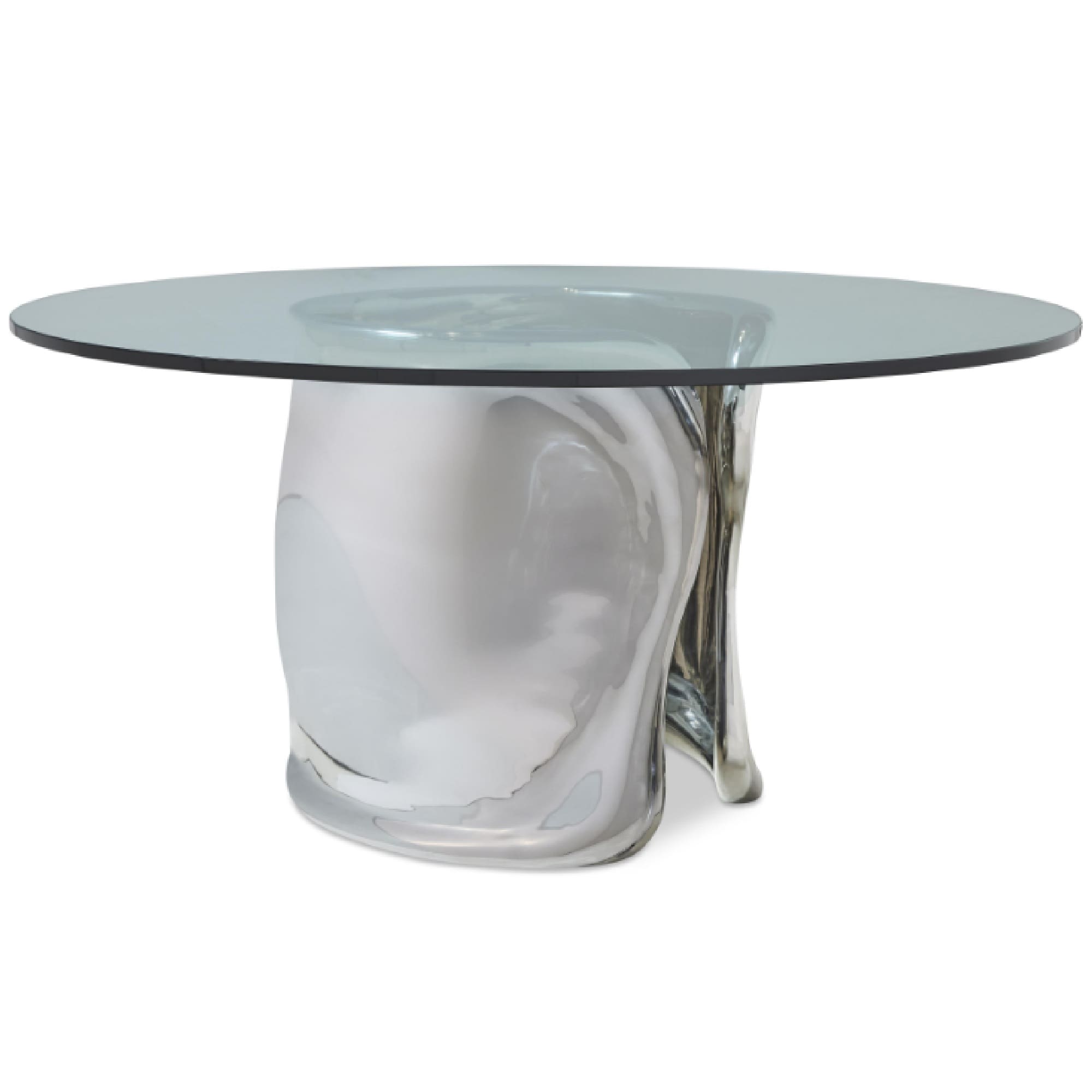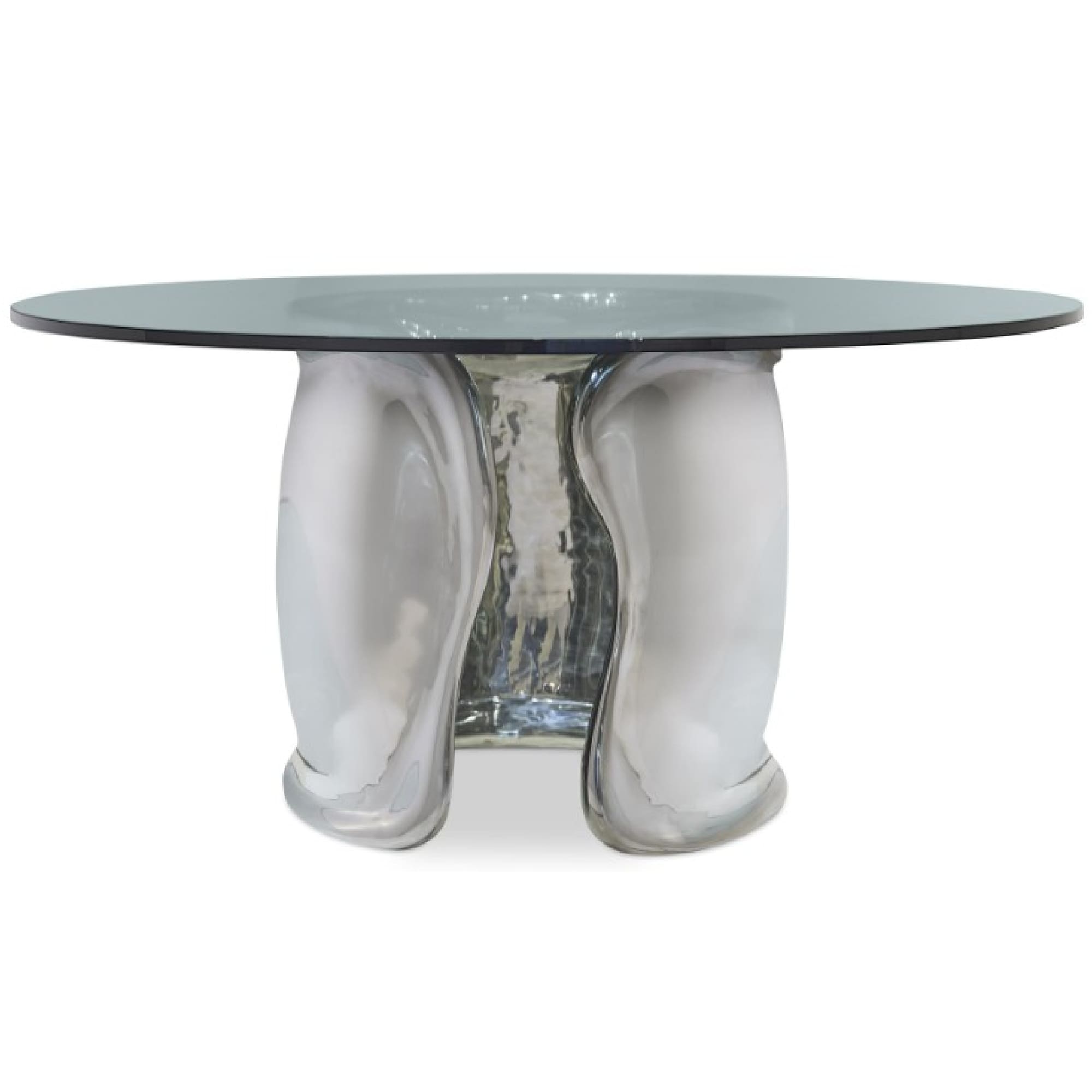 Plateau rond en verre de 60 po sur base sculptée en métal moulé avec finition en acier inoxydable poli.