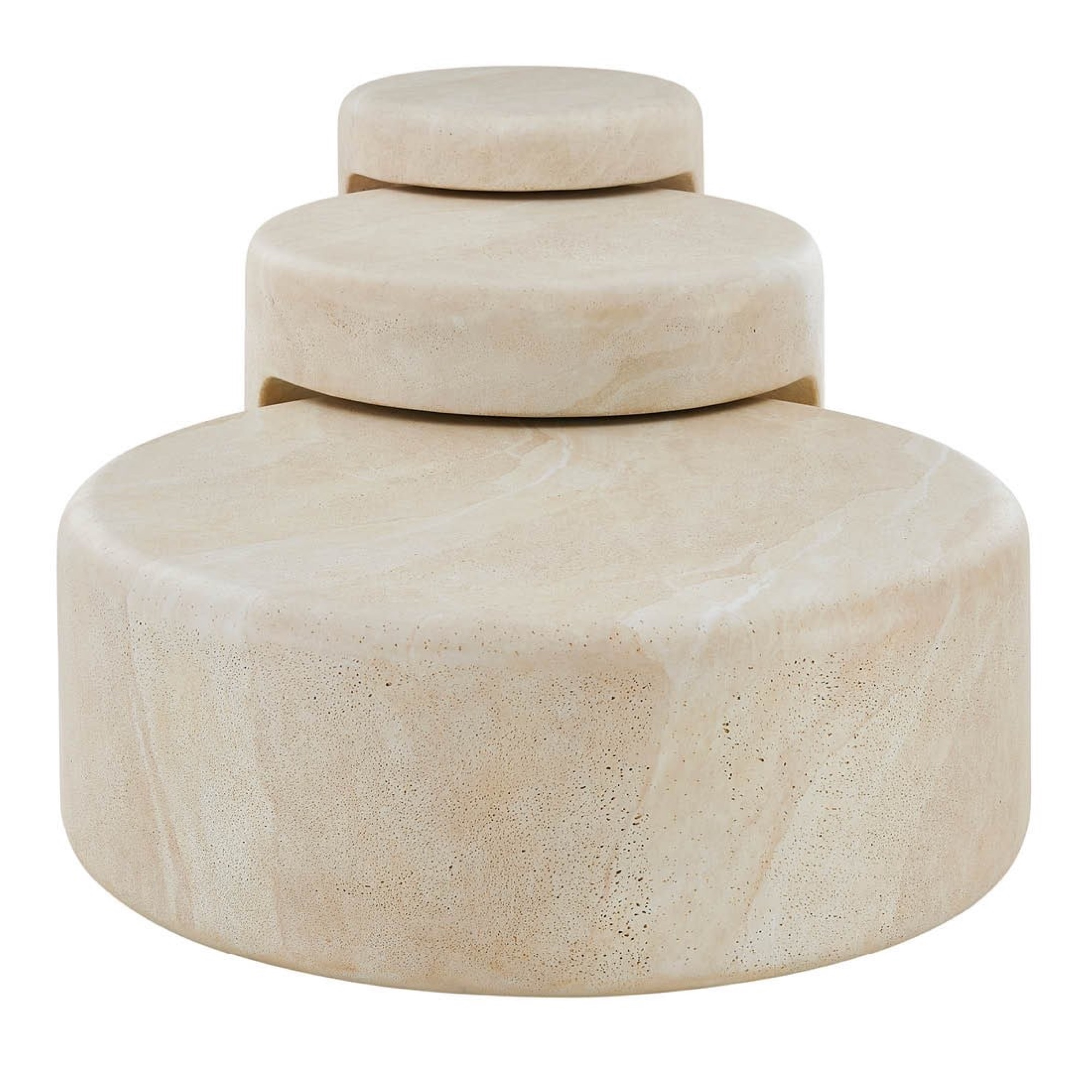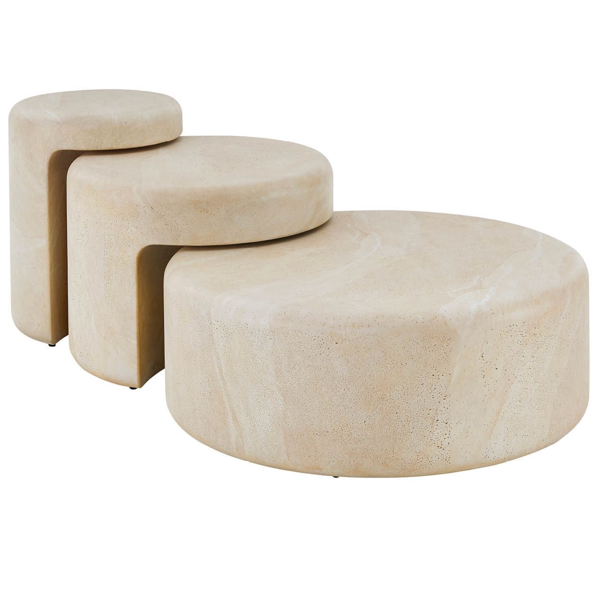 Les tables gigognes Nimbus sont un trio de hauteurs et de tailles variées, offrant une flexibilité ultime pour les espaces de vie dans une finition Faux Travertin saisissante. Leur capacité à se ranger parfaitement les unes sous les autres en fait une solution sophistiquée et peu encombrante pour les réceptions.