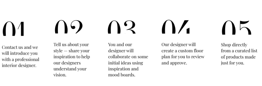 Our design team offers a customized and comprehensive approach to design. You’ll connect virtually with our professional designers for a one-on-one consultation, where we will discuss how to help you furnish your room, your entire home or just select an item.
