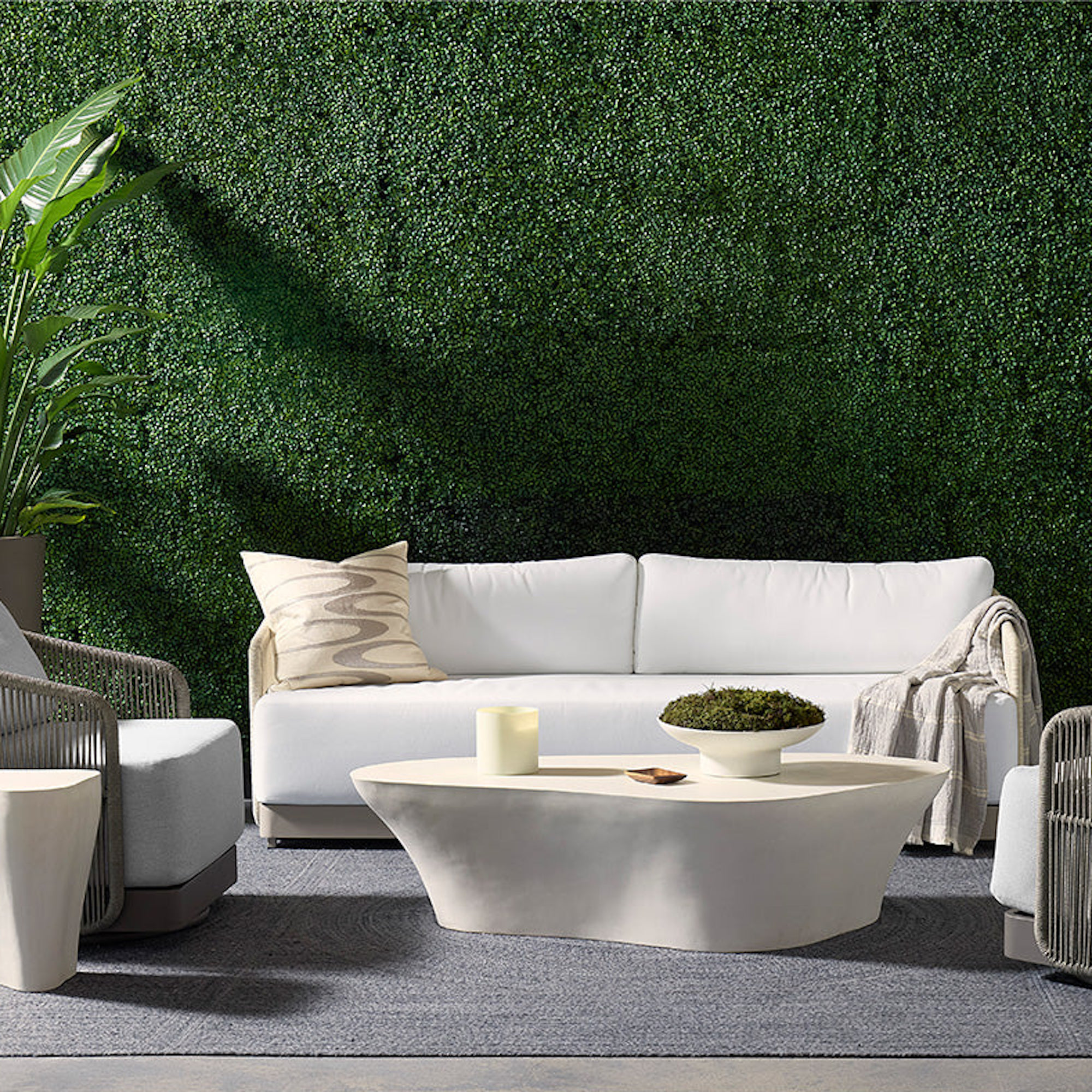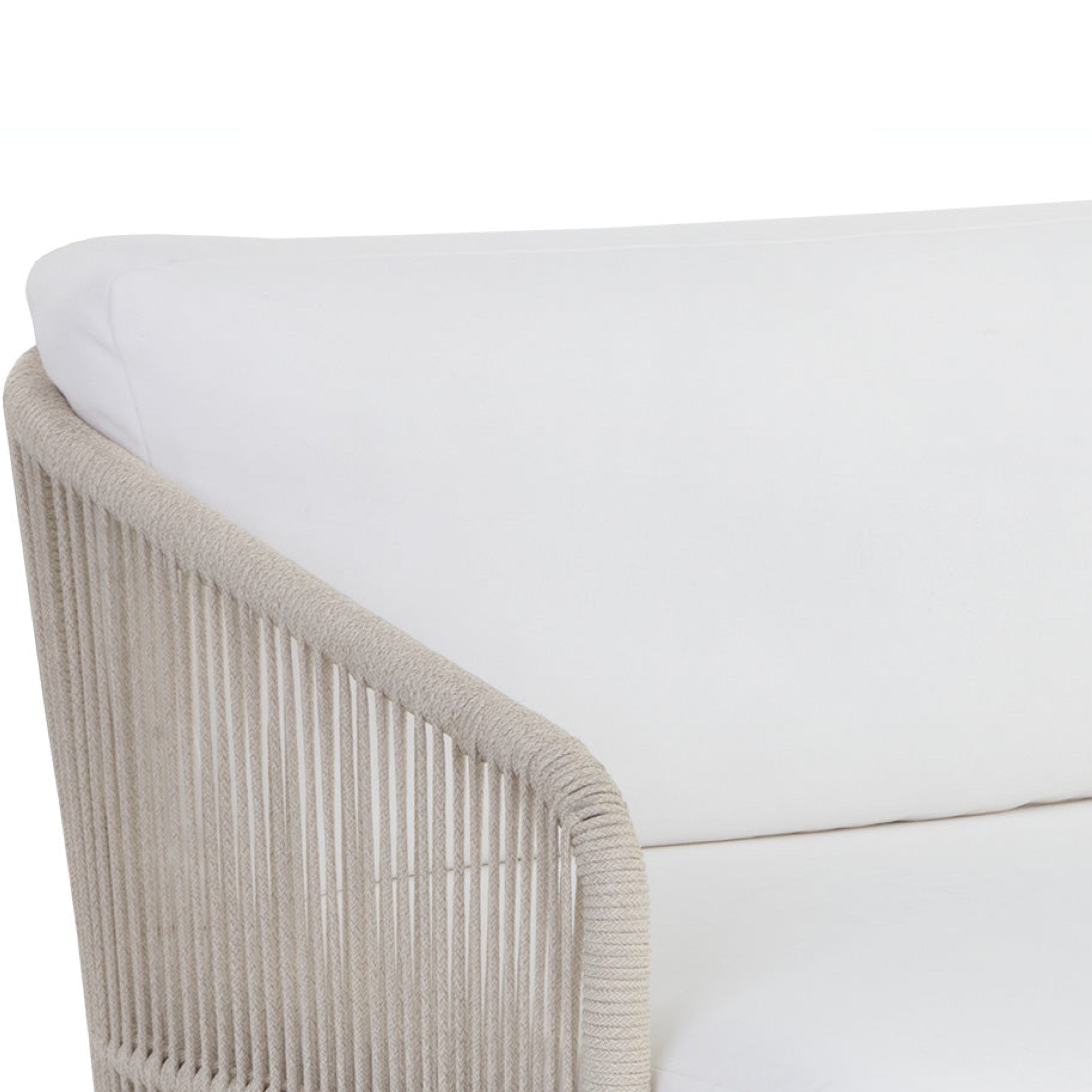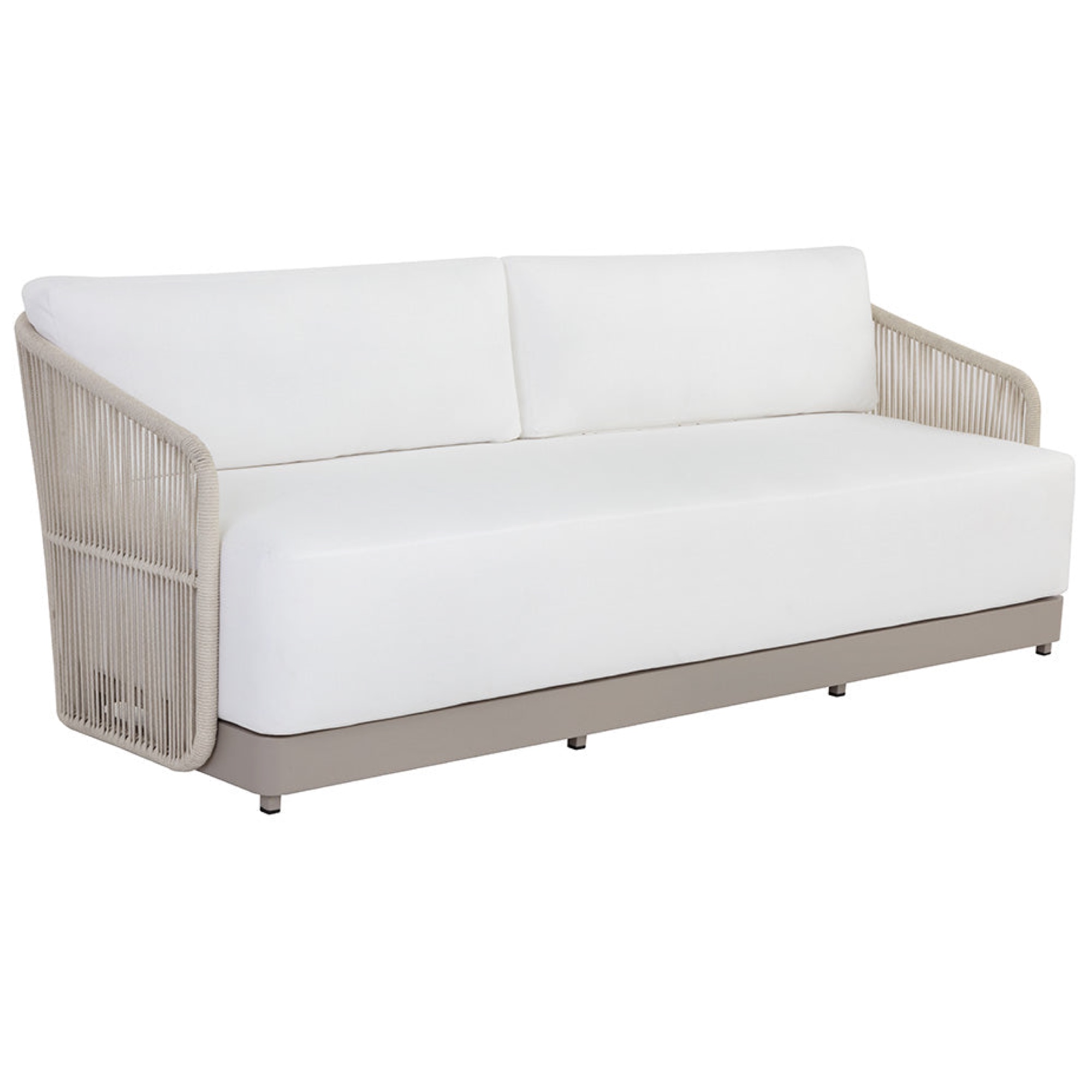 Introduce refined modern style outside with this impressive sofa from our Outdoor collection. Upholstered in stinston white fabric with a powder-coated greige aluminum frame. Completed with cream rope weaving on the seat exterior.