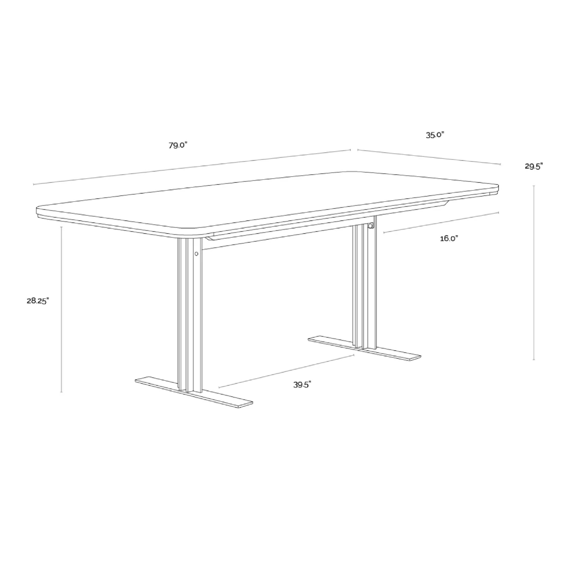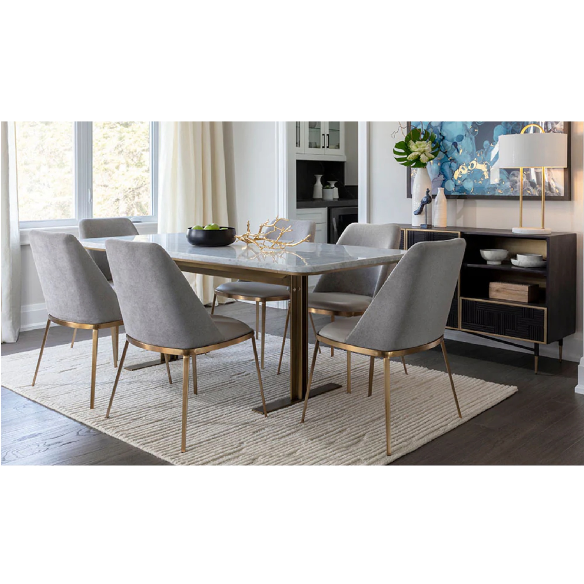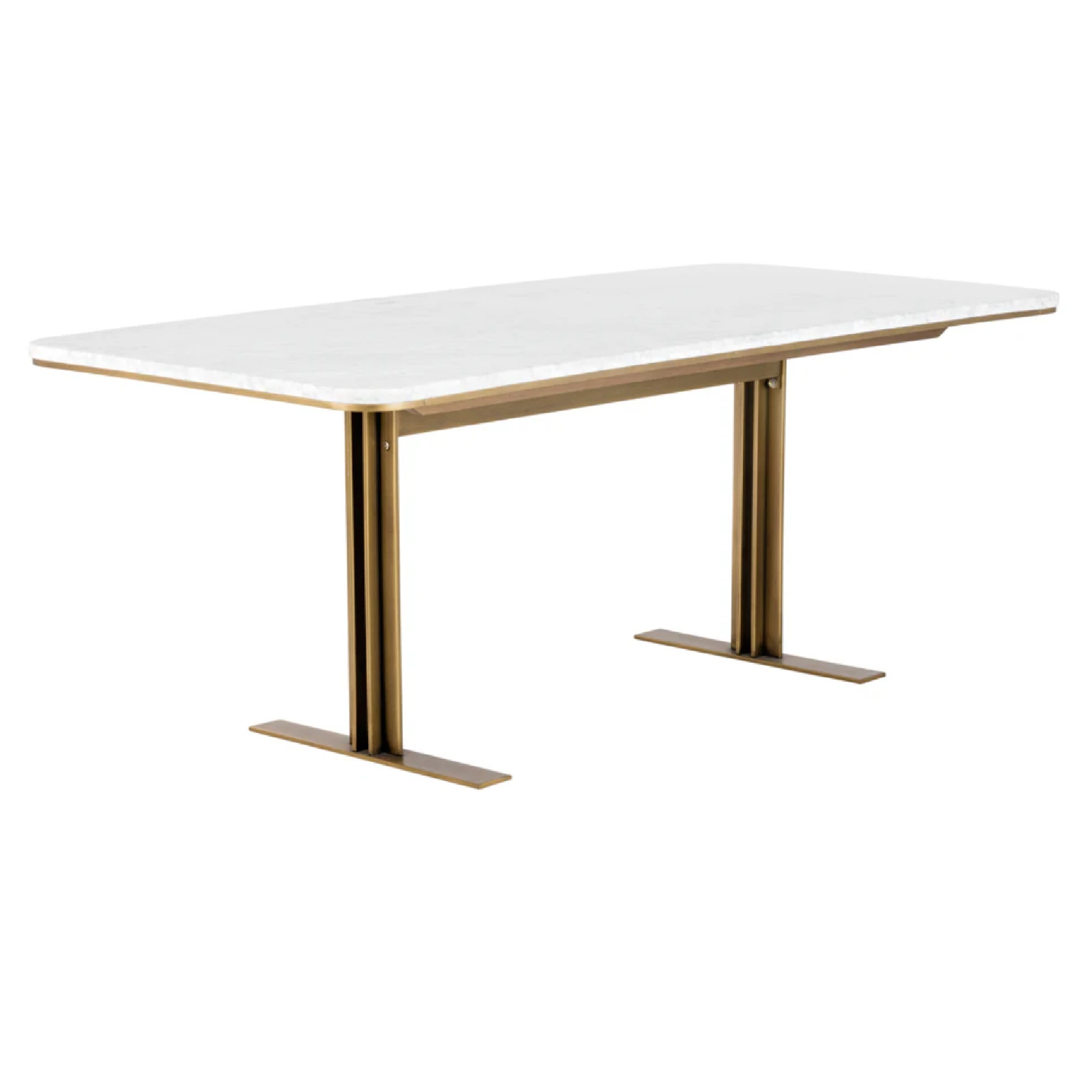 White marble top featuring rounded edges and a contemporary antique brass t-frame base.