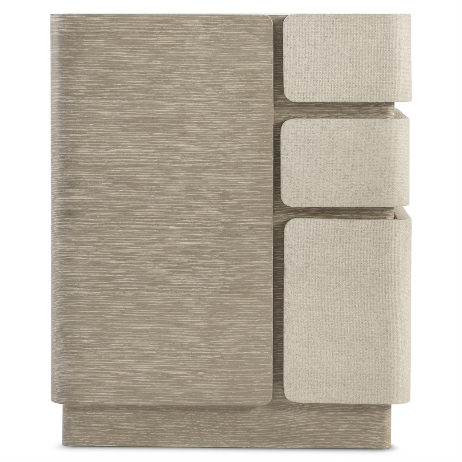 Oak solids and veneers in Clay finish with raffia-wrapped drawer fronts and end panel in Silt finish