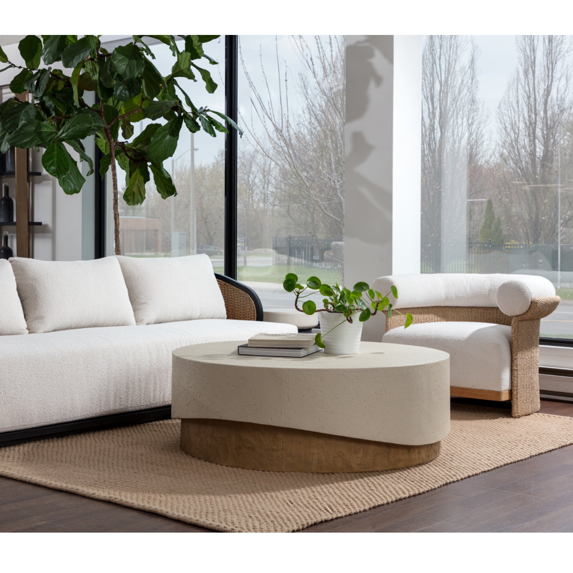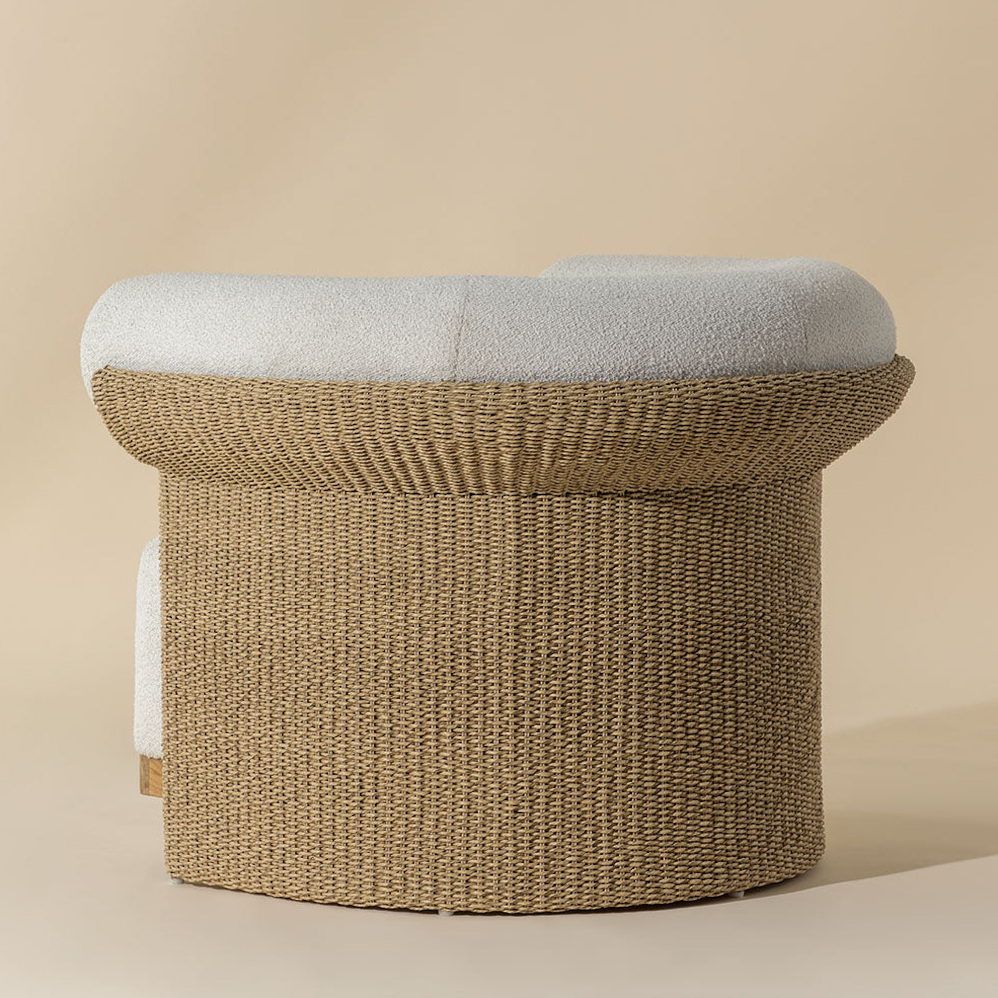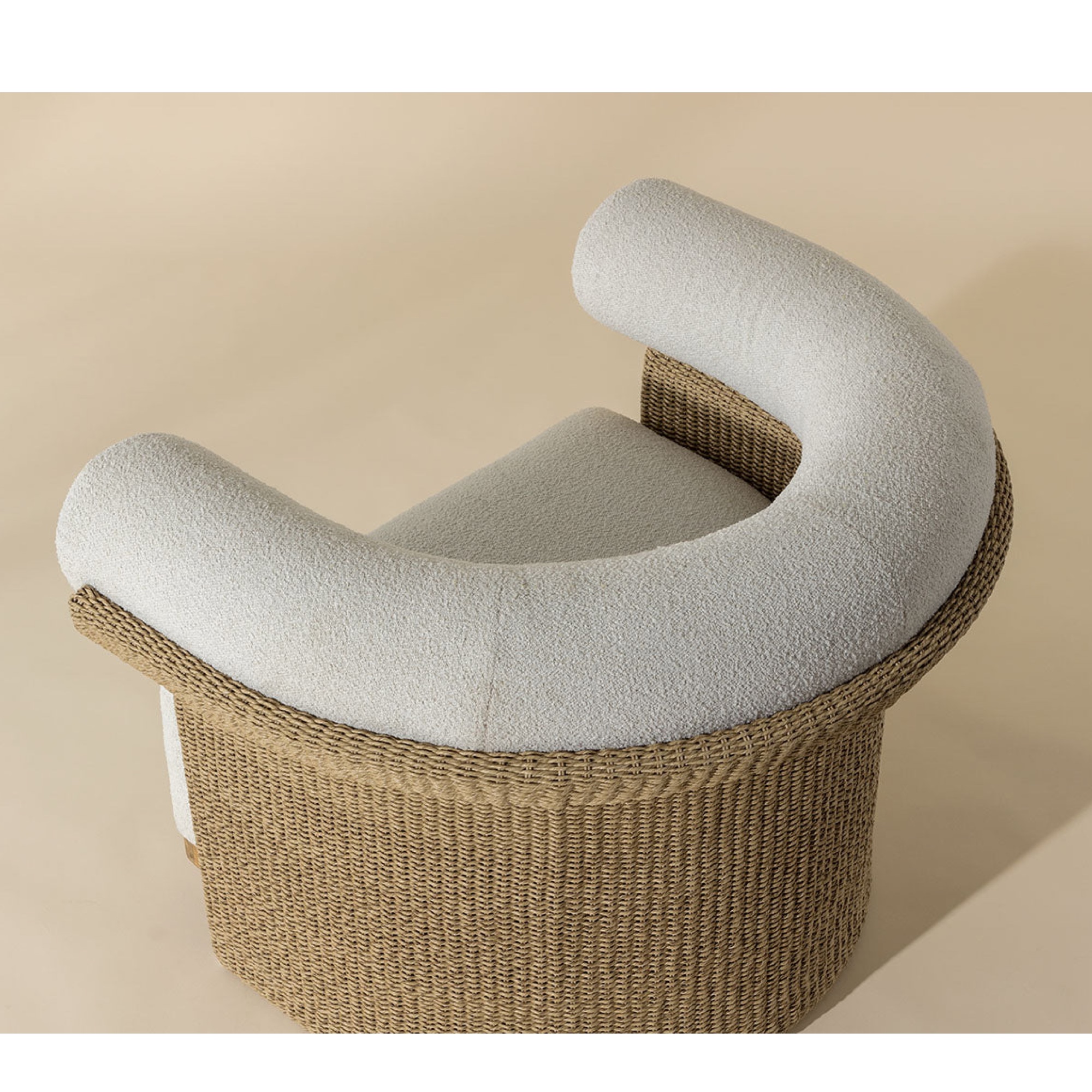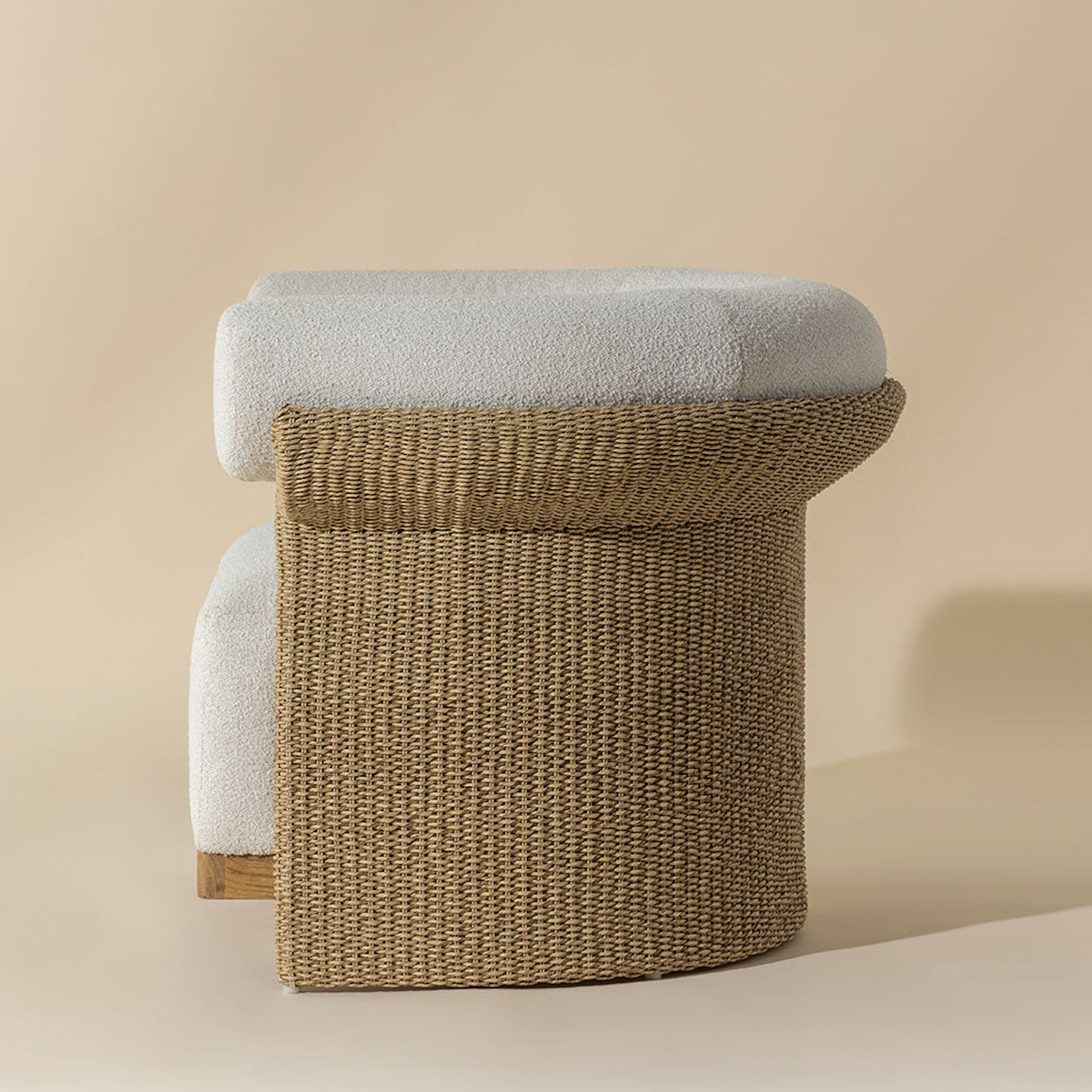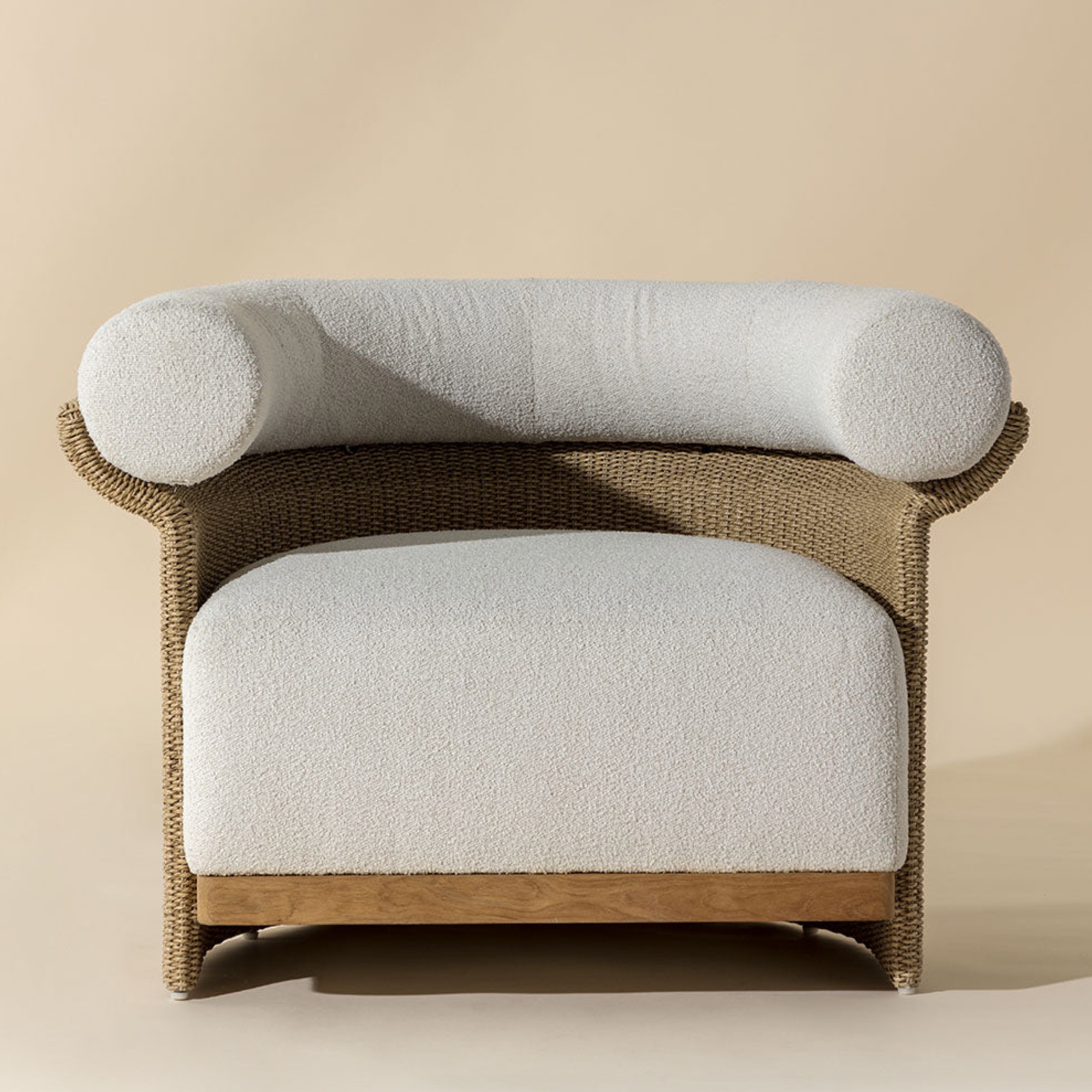 Artisan-crafted with shapely curves, the Asos Lounge Chair sits just right. Twisted all-weather wicker is weaved around a powder-coated aluminum frame designed to withstand the elements. Added comfort is found in the bolster back and seat cushion upholstered in louis cream boucle performance fabric. A teak wood seat base finishes the look. Suitable for indoor and covered outdoor spaces.