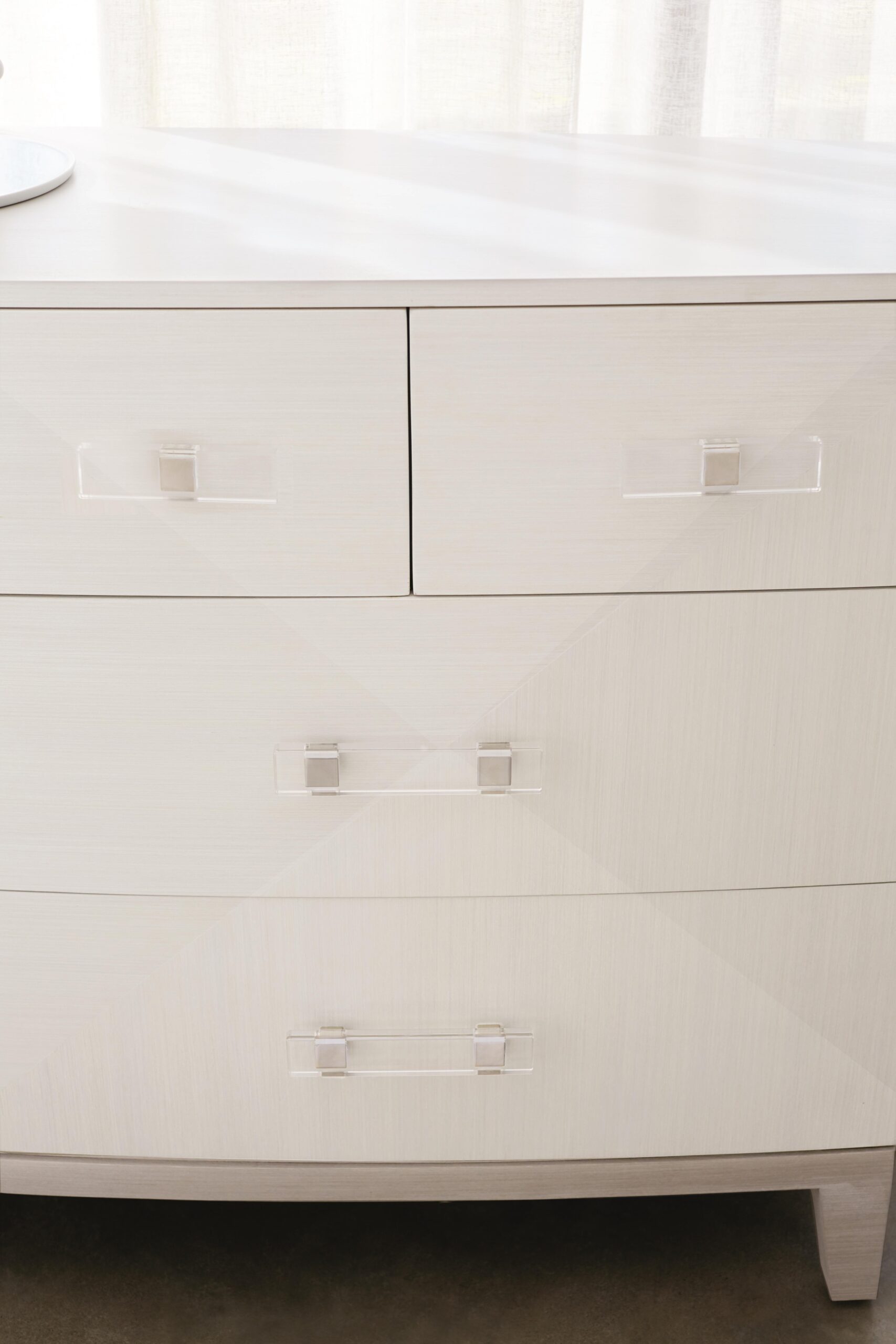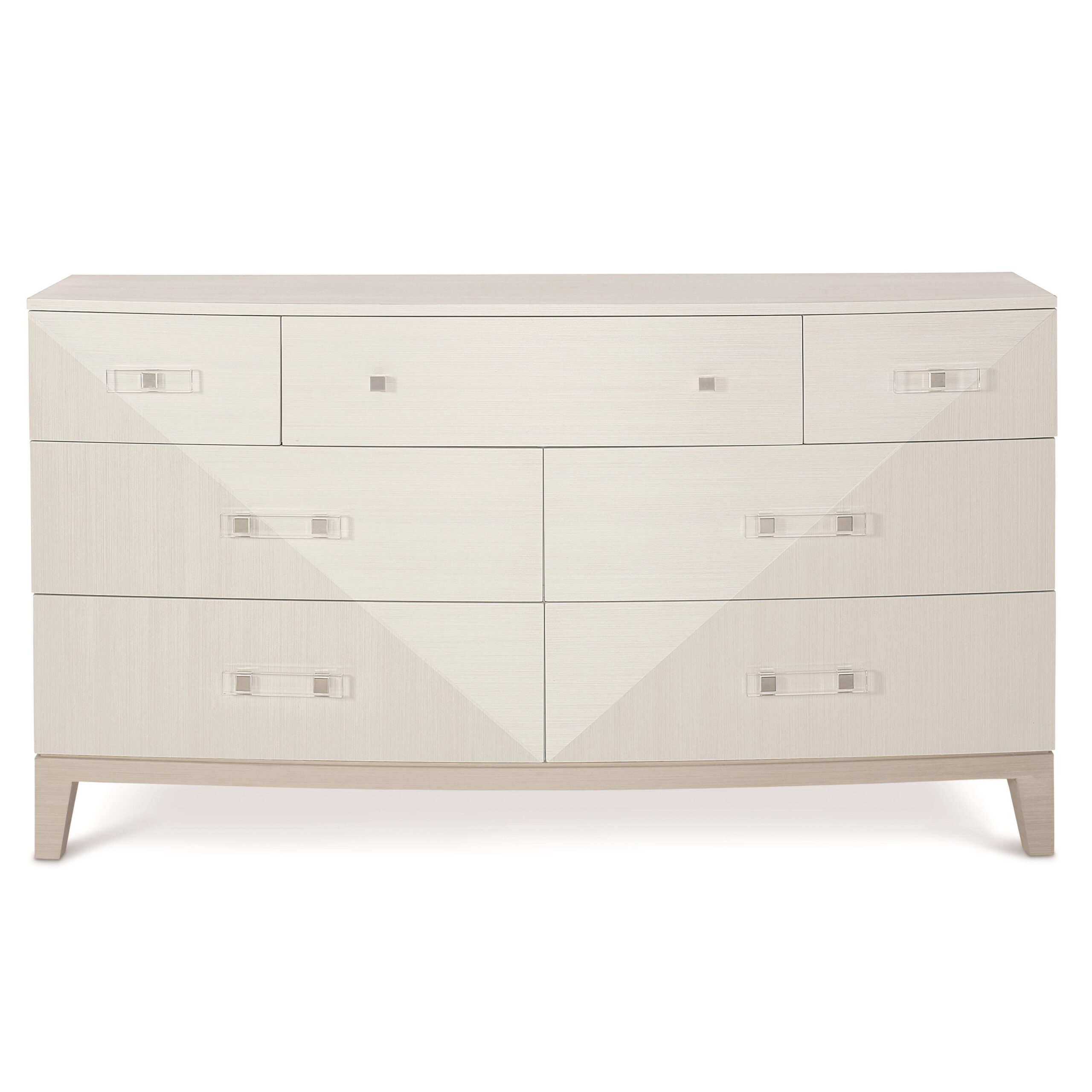 Crafted from poplar solids and engineered faux anigre veneers, the Axiom dresser features a softly curved front with a unique inverted pyramid design. Three silky yet low-sheen finishes form a subtle, sophisticated palette. Clear acrylic is combined with metal for hardware with a fresh and unique feel. With clean lines and a sleek form, this seven-drawer dresser remains a warm and inviting staple for the bedroom.