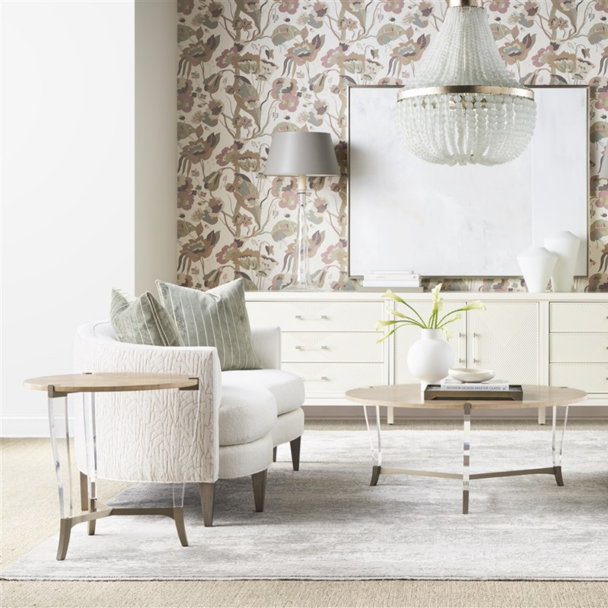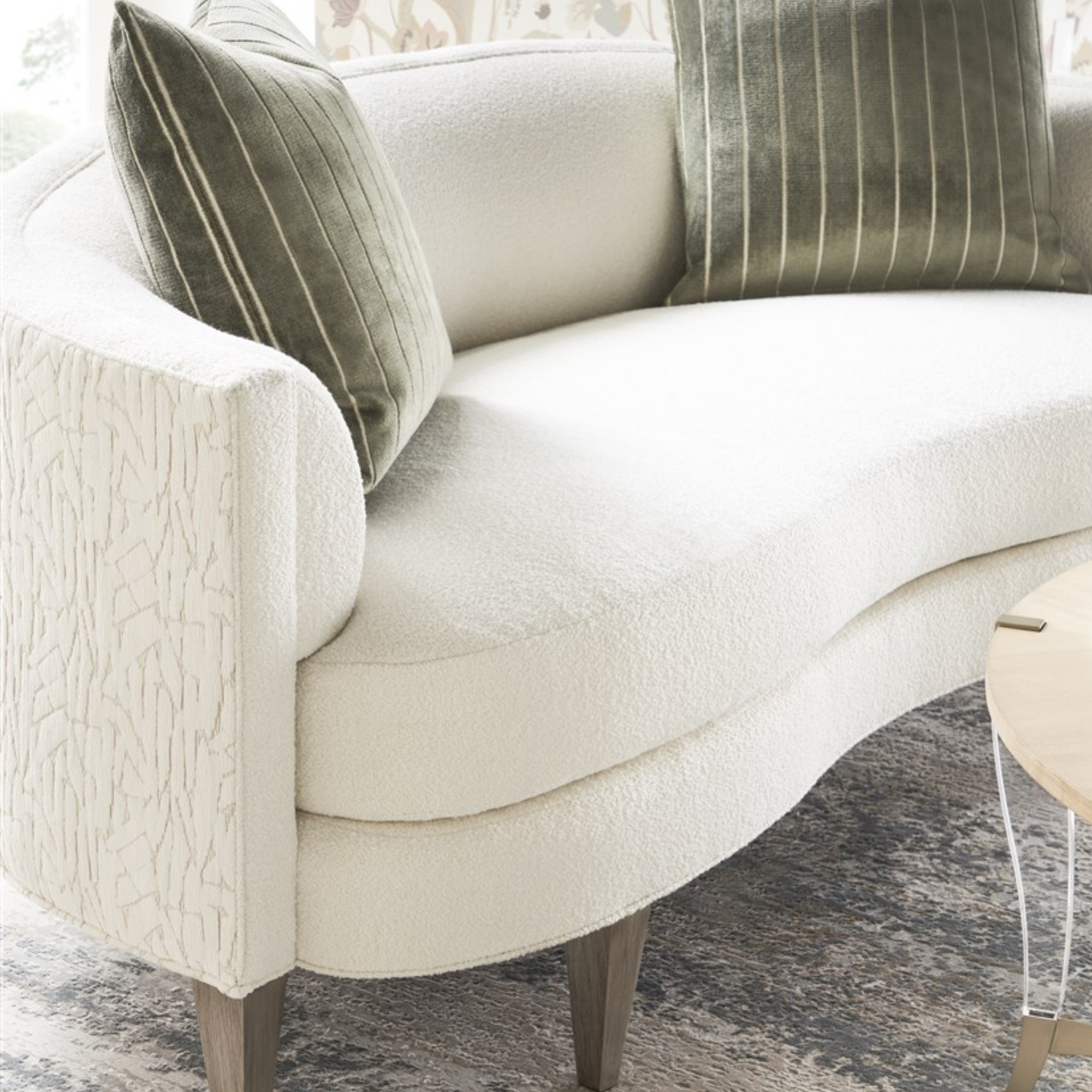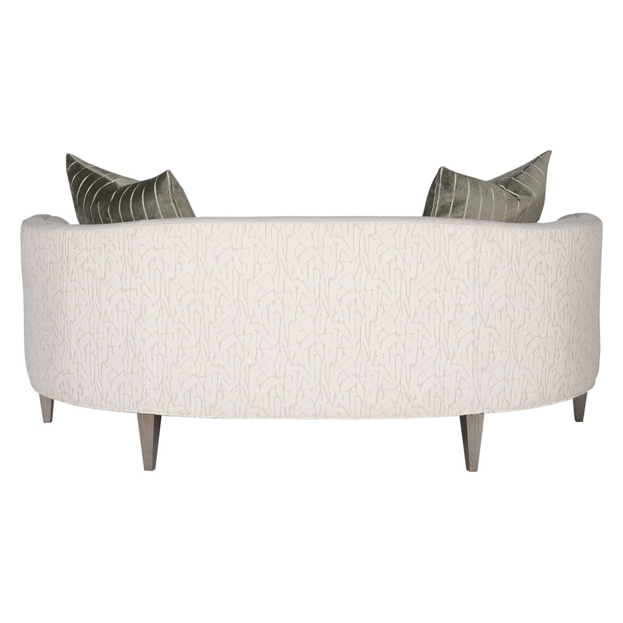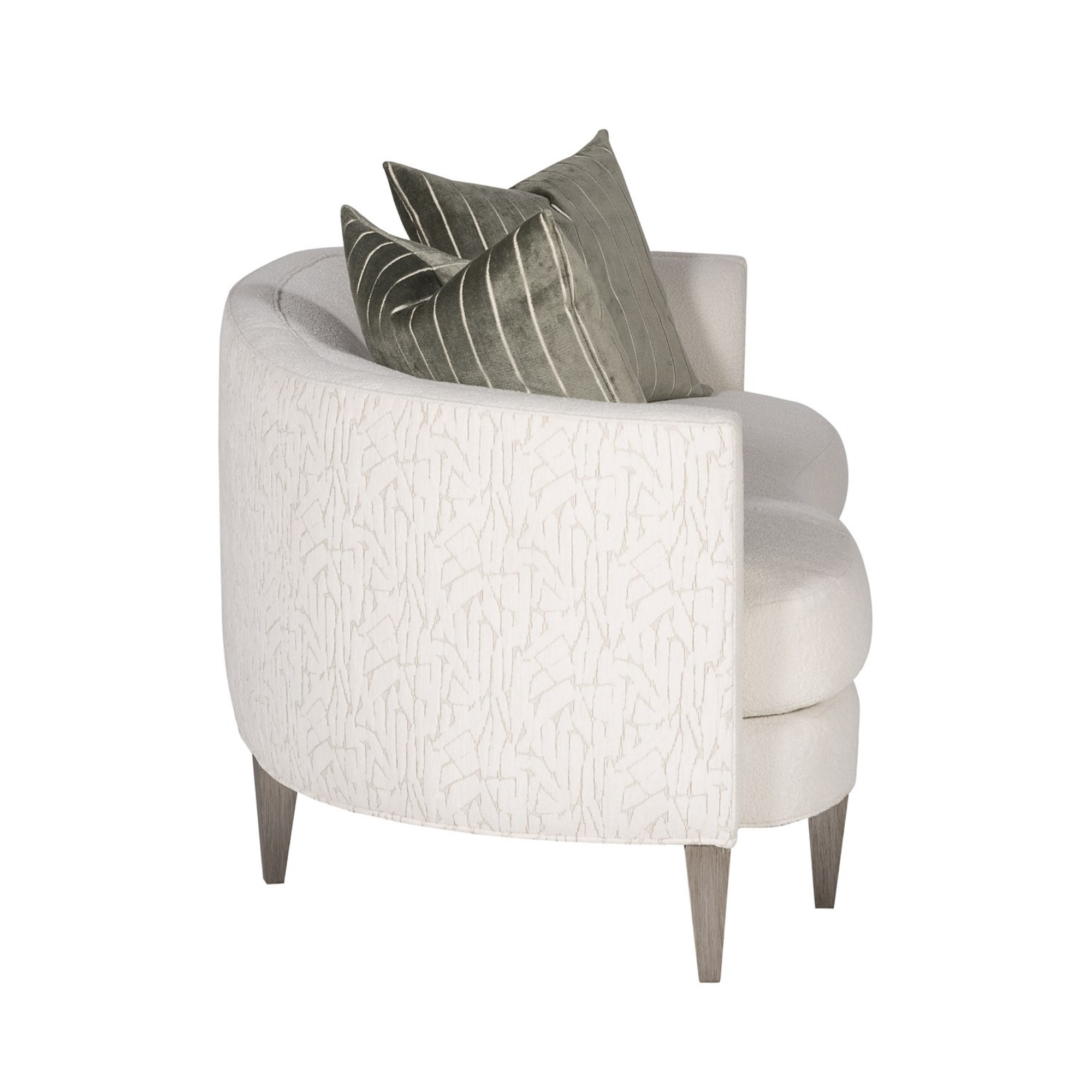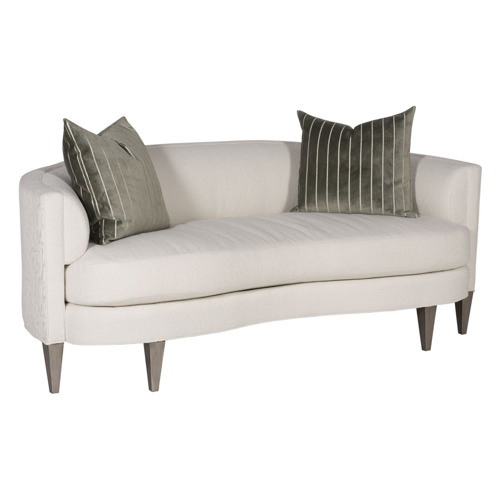 Finish/Fabric Options Available. As Shown in – Fabric: Adrian Ivory (outback, outarms); Kempsey Sheepskin (remainder); two standard 21″ throw pillows (square corner plain stitch) in Viona Silversage (upcharge-above grade 60). Finish: Promiseland.