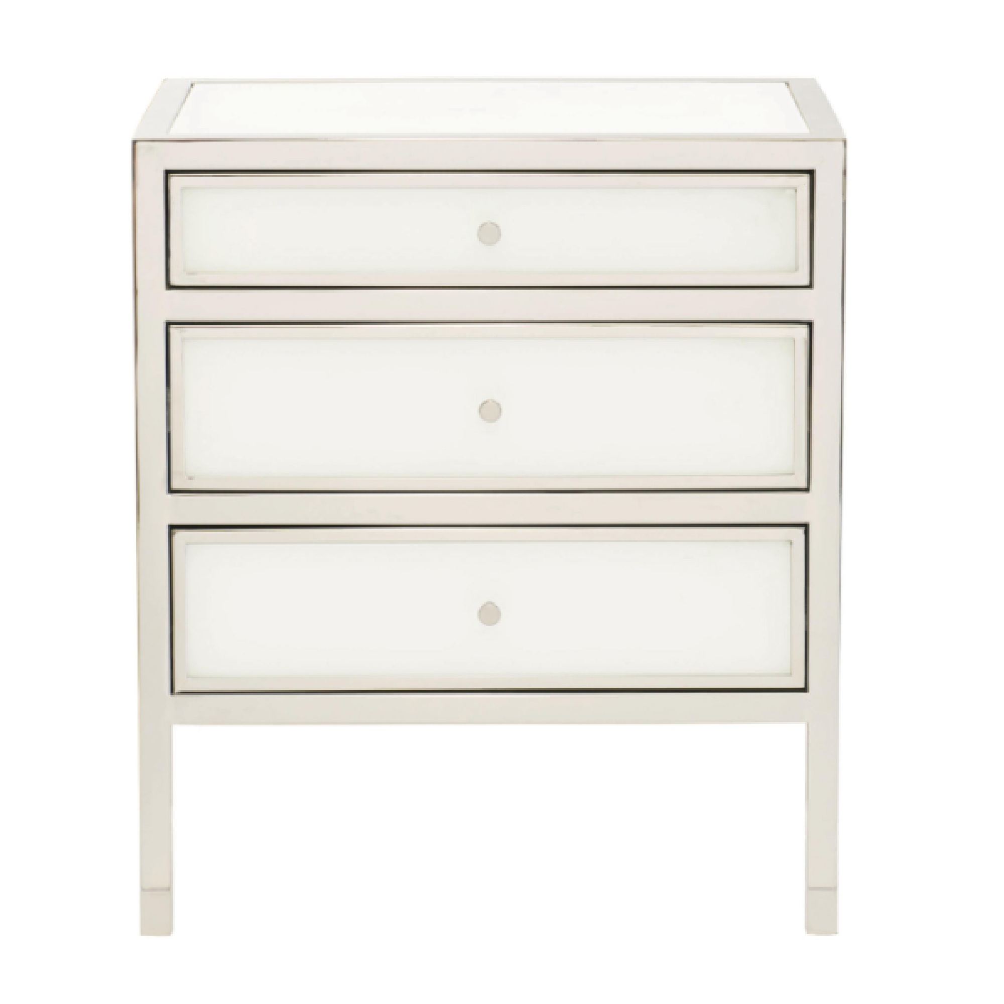 Sleek and glamorous, the Blanca nightstand showcases polished stainless steel framing with Snow glass insets on the top, sides, and drawer fronts. Three drawers with a crisp white interior create a sophisticated bedside statement with a modern edge.