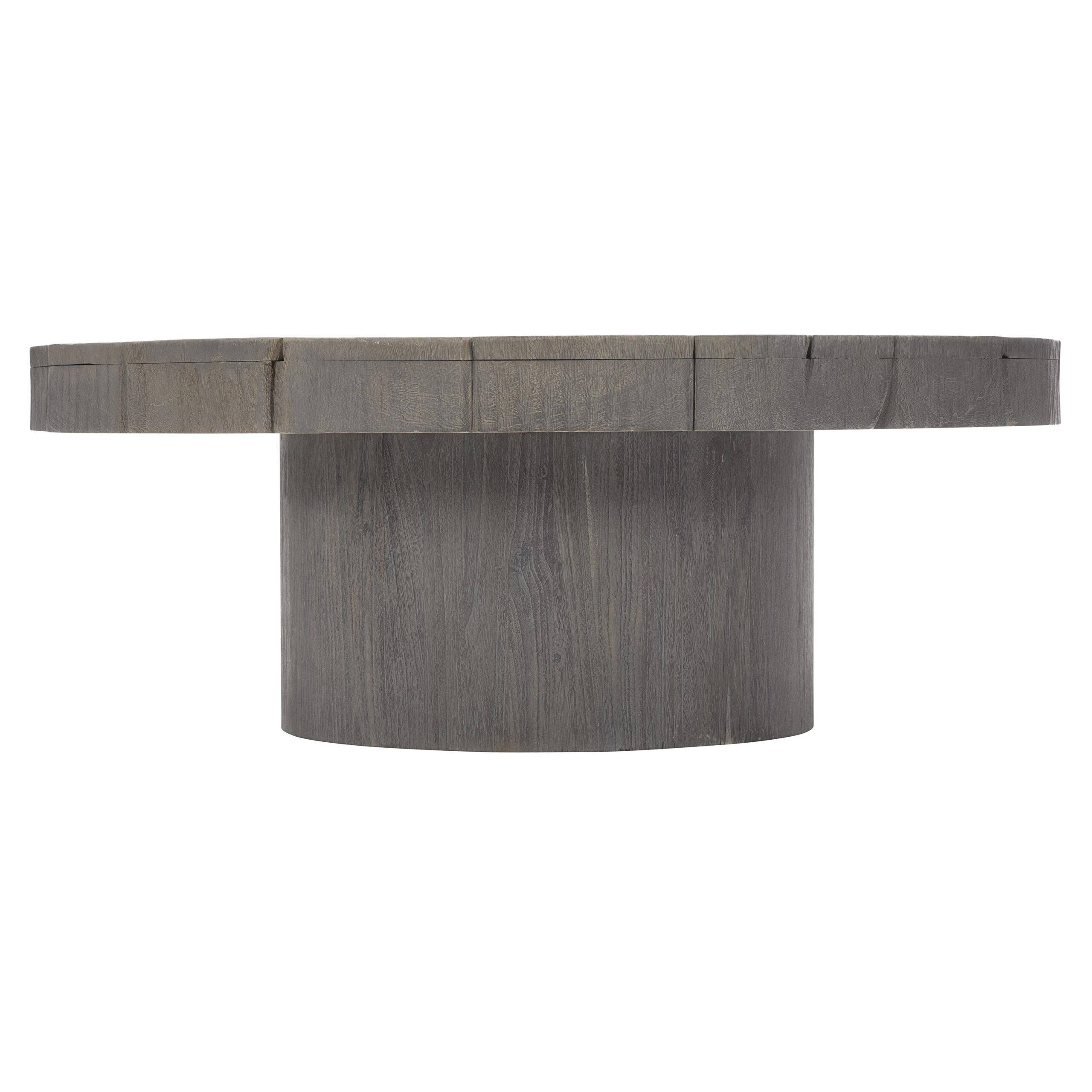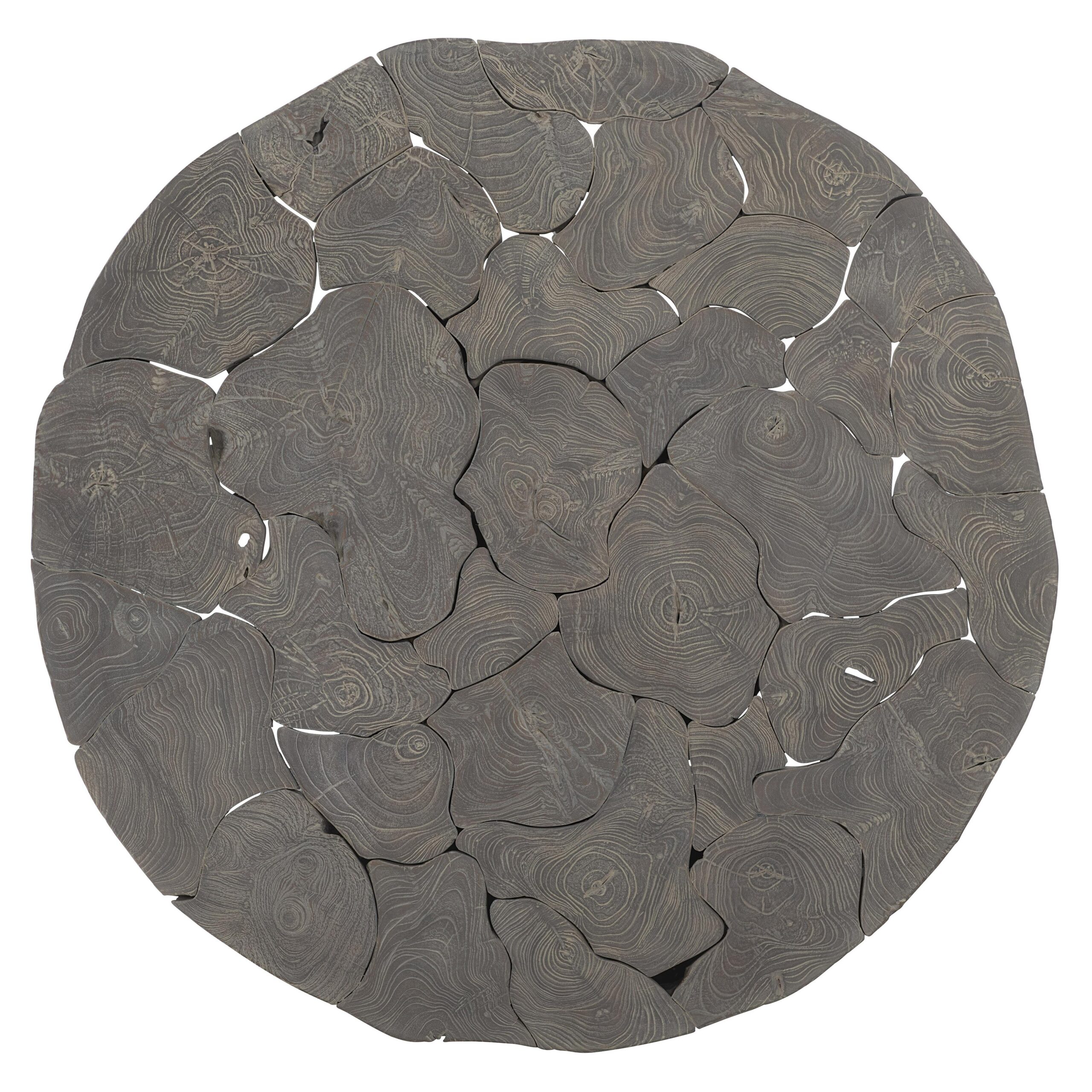 Full of warmth and personality, the Calavaras cocktail table infuses a space with the fresh energy of organic elements. Crafted from sliced teak, the round top is composed of uniquely shaped pieces that fit together like a puzzle. A smoked truffle finish enhances the natural beauty of the wood.