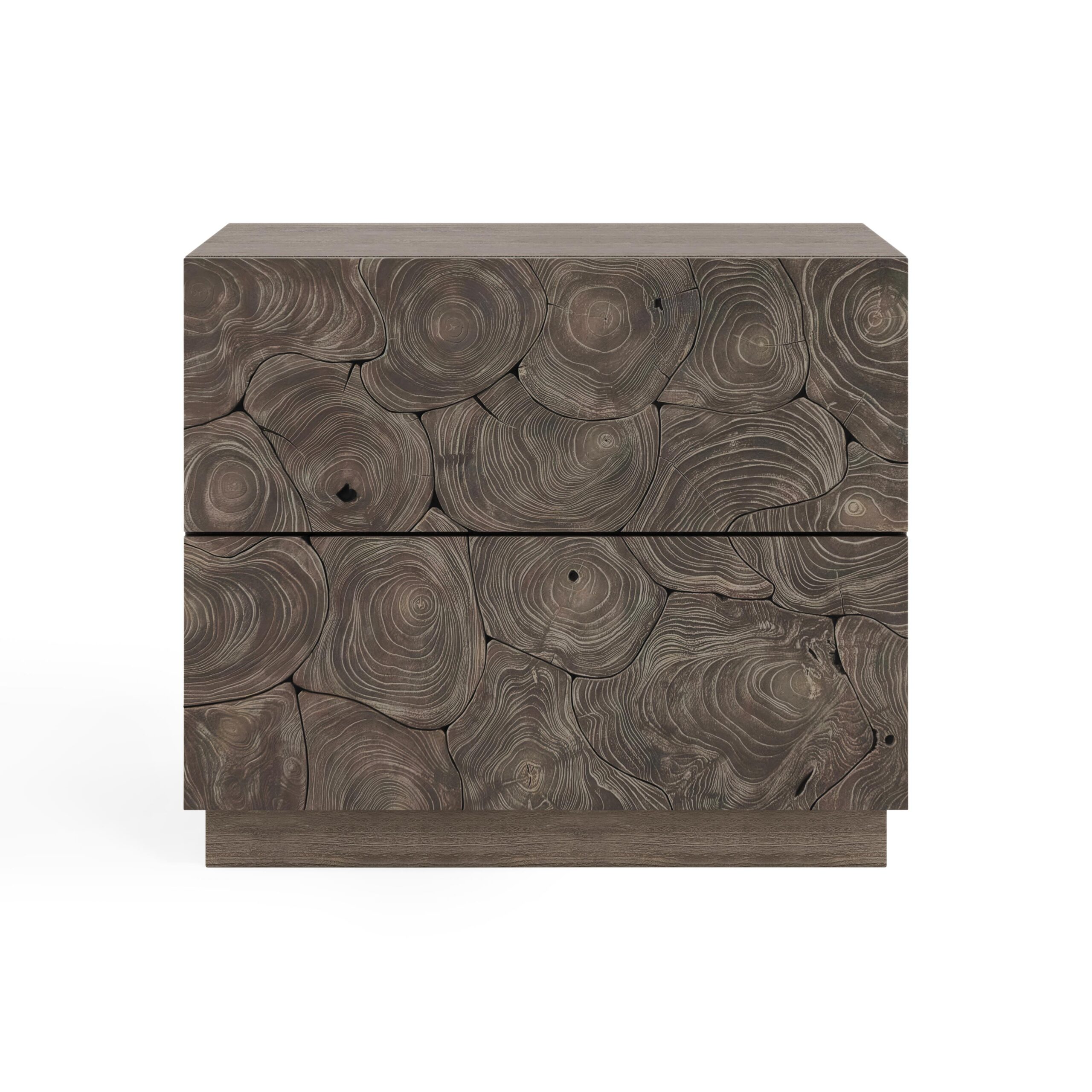 A simple minimalist form combines with the beautiful organic texture of teak for the Calavaras nightstand. The design draws all eyes, with its open-work pattern of sliced teak on two push-to-open drawers. Finished in Smoked Truffle, the nightstand rests on a plinth base.
