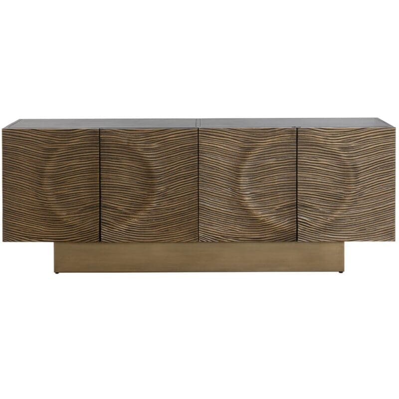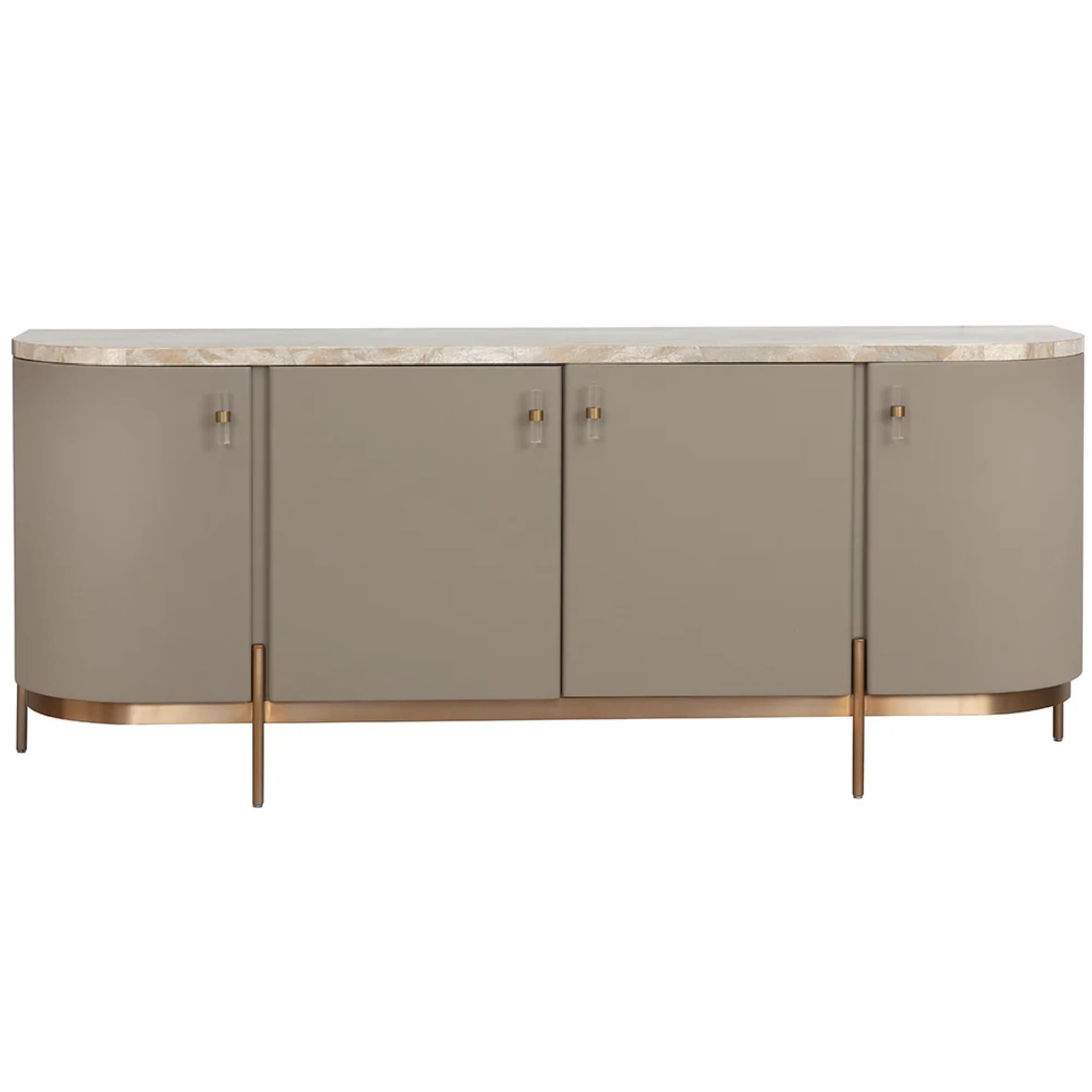 Crafted with a cappuccino marble top, taupe faux leather-wrapped doors and a brushed gold stainless steel base.