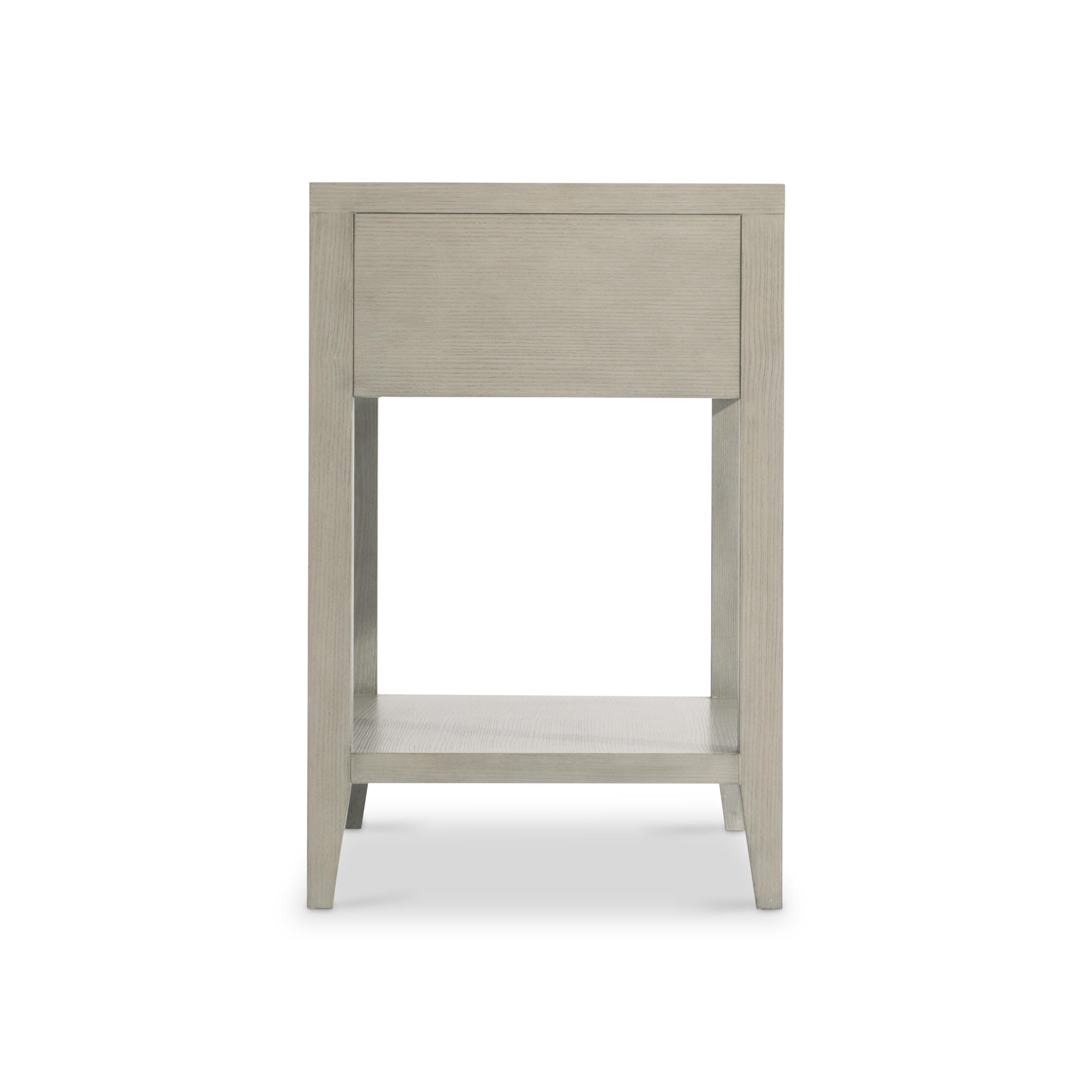 The cast metal drawer front of the Cornelia nightstand features a raised acanthus leaf pattern inspired by Florentine metalwork. Elegant tapered legs and a lower shelf are finished in Nebbia. The design also includes two-port USB charging unit.