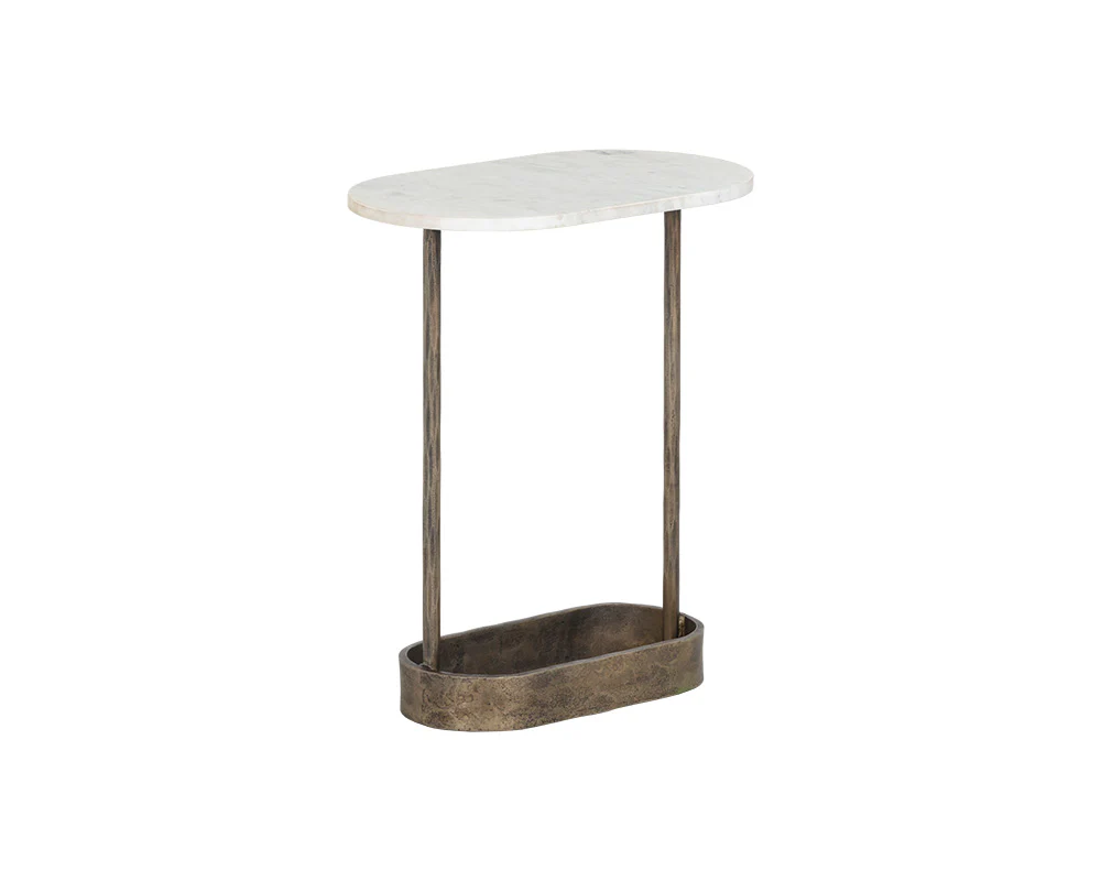 A side table inspired by global travels with a minimalist silhouette. Features a white marble tabletop with a structured hammered iron base in an antique brass finish. With refined craftsmanship, this design was brought to life by skilled local artisans. By nature, these materials develop unique imperfections such as fissures, markings and colour variations for a truly one-of-a-kind piece.
